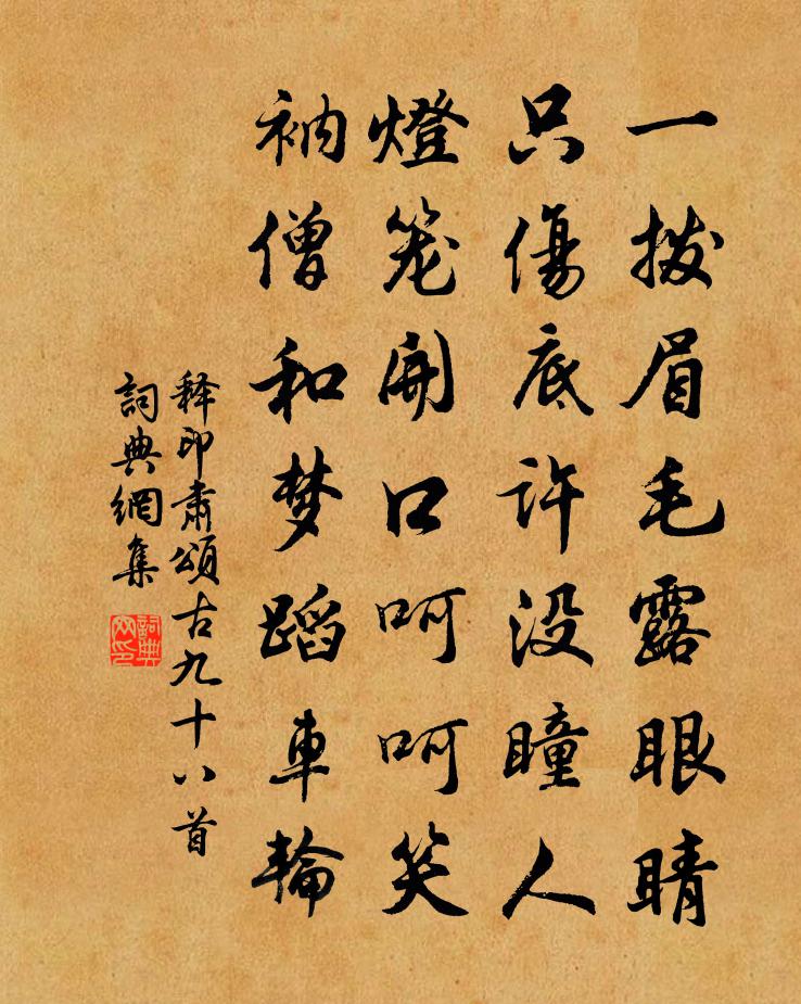 詩詞名句歷史字典書法欣賞書法字典國語詞典說文解字康熙字典古漢語字典標 題 作 者 詩 句 頌古九十八首作者:釋印肅 朝代:宋代頌古九十八首原文一撥眉毛露眼睛,只傷底許沒瞳人。燈籠開口呵呵笑,衲僧和夢蹈車輪。詩詞問答問:頌古九十八首的作者是誰?答:釋印肅問:頌古九十八首寫於哪個朝代?答:宋代釋印肅頌古九十八首書法欣賞頌古九十八首書法作品詩詞推薦挽史太君詞李新〔宋代〕吳楚雲帆萬里風,元歌來哭舊江東。梁城皓鶴千年恨,蜀壟青松一夢空。滏水波聲天地遠,灞陵山色古今同。碑陰乾明節祝聖壽四錫〔宋代〕百辟歡呼降庭辰,金樽獻酒願千春。延年不假丹砂效,享壽全由聖德新。古物進來兼藥鼎,畫圖呈處有仙人。君恩句釋曉瑩〔宋代〕落澗水淙淙。賢者之孝二百四十首徐庶林同〔宋代〕不勝方寸亂,豈暇二心持。忍矣王陵將,賢哉徐庶辭。滿江紅蔡伸〔宋代〕人倚金鋪,顰翠黛、盈盈墮睫。話別處、留連無計,語嬌聲咽。十幅雲帆風力滿,一川煙暝波光闊。但回首、極目送僧歸日本貫休〔唐代〕焚香祝海靈,開眼夢中行。得達即便是,無生可作輕。流黃山火著,碇石索雷鳴。想到夷王禮,還為上寺迎。句韓偓〔唐代〕豈獨鴟夷解歸去,五湖漁艇且餔糟。淮陽公主輓歌李乂〔唐代〕玉顏生漢渚,湯沐榮天女。金縷化邙塵,哀榮感路人。鳳凰曾作伴,螻蟻忽為親。疇日成蹊處,穠華不復春。霜夜陸游〔宋代〕澹月窺窗似有情,更堪梅影向人橫。放翁不受天魔惱,獨擁青氈睡到明。題衡陽泗州寺張抃〔唐代〕一水悠悠百粵通,片帆無奈信秋風。幾層峽浪寒舂月,盡日江天雨打篷。漂泊漸搖青草外,鄉關誰念雪園東。未知疏山三首曾季貍〔宋代〕江南九月未飛霜,木葉蕭蕭已半黃。行遍疏山山下路,滿山唯有桂花香。訊黃乙山於壽寧寺黃敏求〔宋代〕客中聽雨況僧寮,盡日無人訪寂寥。一枕秋聲供痛快,隔窗風裡有芭蕉。會吟行謝靈運〔南北朝〕六引緩清唱。三調佇繁音。列筵皆靜寂。鹹共耹會吟。會吟自有初。請從文命敷。敷績壺冀始。刊木至江汜。列宿道中逢乞食老僧貫休〔唐代〕赤棕櫚笠眉毫垂,拄楖栗杖行遲遲。時人只施盂中飯,心似白蓮那得知。宜興山房十首李曾伯〔宋代〕月暗山空夜倍長,清談消遣睡毋忙。山中新酒幸堪飲,何惜一杯相共嘗。遊絲雍裕之〔唐代〕遊絲何所似,應最似春心。一向風前亂,千條不可尋。郡西亭偶詠白居易〔唐代〕常愛西亭面北林,公私塵事不能侵。共閒作伴無如鶴,與老相宜只有琴。莫遣是非分作界,須教吏隱合為心。可憐龍門呈心老王之道〔宋代〕千山倚山高,一徑空雲斜。忽然見樓閣,知是佛子家。蒼松老不死,天矯如龍蛇。霜皮自鱗皴,風梢互槎牙。幽花英宗皇帝詞二首曾鞏〔宋代〕已應南陽氣,猶遲代邸來。范鎔歸獨化,綱理付群付。禹會方無外,虞巡遂不回。空驚柏城仗,很小鼓送余哀。湖上行春連文鳳〔宋代〕踏破六橋楊柳煙。鄉心迢遞怯啼鵑。好花歲歲仍相似,白髮星星不再玄。囊裹有金堪一醉,瓢中無藥可千年。遊人名句推薦牽牛織女遙相望,爾獨何辜限河梁。曹丕《燕歌行二首·其一》 落日暴風雨,歸路繞汀灣蘇舜欽《水調歌頭·滄浪亭》 更被夕陽江岸上,斷腸煙柳一絲絲。韋莊《江外思鄉》 綠波春浪滿前陂,極目連雲稏肥。韋莊《稻田》 惠遠祠前晉溪水,翠葉銀花清見底。元好問《過晉陽故城書事》 智者不倍時而棄利,勇士不怯死而滅名,忠臣不先身而後君。劉向《戰國策·齊六·燕攻齊取七十餘城》 便做無情,莫也愁人苦朱淑真《蝶戀花·送春》 擢擢當軒竹,青青重歲寒。呂太一《詠院中叢竹》 秋色漸將晚,霜信報黃花。葉夢得《水調歌頭·秋色漸將晚》 雁過孤峰曉,猿啼一樹霜。賈島《送天台僧》