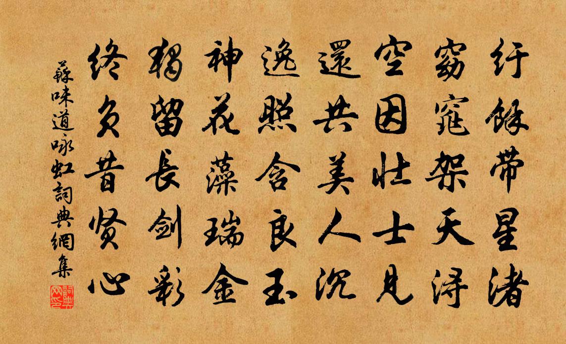 詩詞名句歷史字典書法欣賞書法字典國語詞典說文解字康熙字典古漢語字典標 題 作 者 詩 句 詠虹作者:蘇味道 朝代:唐代詠虹原文紆餘帶星渚,窈窕架天潯。空因壯士見,還共美人沉。逸照含良玉,神花藻瑞金。獨留長劍彩,終負昔賢心。詩詞問答問:詠虹的作者是誰?答:蘇味道問:詠虹寫於哪個朝代?答:唐代問:詠虹是什麼體裁?答:五律蘇味道詠虹書法欣賞詠虹書法作品注釋全唐詩:卷65_5詩詞推薦借亭觀魚錢時〔宋代〕春日春風衣杲杲,海棠未老春正好。與客行過借亭西,平沙步步生芳草。空潭愛日透底明,游魚如散空中霙。徘徊阻戎瀘間群盜岑參〔唐代〕南州林莽深,亡命聚其間。 * 無昏曉,屍積填江灣。餓虎銜髑髏,飢烏啄心肝。腥裛灘草死,血流江水殷。夜雨寄清曉闍梨林逋〔宋代〕前時春雪晴,林壑趣彌清。幾憶山陰講,兼忘谷口耕。樹叢歸夕鳥,湖影浸寒城。還肯重相訪,柴門掩杜蘅。滿庭芳(雪中戲呈友人)黃庭堅〔宋代〕風力驅寒,雲容呈瑞,曉來到處花飛。遍裝瓊樹,春意到南枝。便是漁蓑舊畫,綸竿重、橫玉低垂。今宵里,香閨頌古五首釋守仁〔宋代〕鋸解秤錘,油煎石磉。兩手擎來,有功者賞。菩薩蠻·飄蓬只逐驚飆轉納蘭性德〔清代〕飄蓬只逐驚飆轉,行人過盡煙光遠。立馬認河流,茂陵風雨秋。寂寥行殿索,梵唄琉璃火。塞雁與宮鴉,山深日易和張少監舟中望蔣山徐鉉〔唐代〕谿路向還背,前山高復重。紛披紅葉樹,間斷白雲峰。盡日慵移棹,何年醉倚松。自知閒未得,不敢笑周顒。鷦鷯賦張華〔魏晉〕鷦鷯,小鳥也,生於蒿萊之間,長於藩籬之下,翔集尋常之內,而生生之理足矣。色淺體陋,不為人用,形微處卑觀物吟邵雍〔宋代〕地以靜而方,天以動而圓。既正方圓體,還明動靜權。靜入必成潤,動極遂成然。潤則水體具,然則火用會。水體枯木詩辭召命作翁洮〔唐代〕枯木傍溪崖,由來歲月賒。有根盤水石,無葉接煙霞。二月苔為色,三冬雪作花。不因星使至,誰識是靈槎?和陳魯山十詩以孟夏草木長遶屋樹扶疏為韻陸游〔宋代〕至人貴其身,不使事物遶。捐身易富貴,明珠彈飛鳥。我願稱善人,題作墓上表。從來尺鷃樂,不羨飛鴻矯。程帥寄詩見憶次韻四首陳造〔宋代〕擾擾飛潛易陸沉,化工刺手斬然新。飲光一笑知誰繼,試把玄機舉似人。題蘇州靈岩寺張祜〔唐代〕碧海西陵岸,吳王此盛時。山行今佛寺,水見舊宮池。亡國人遺恨,空門事少悲。聊當值僧語,盡日把松枝。挽南康冷知軍孫應時〔宋代〕近吒龍門御,欽聞月日評。感公非輩行,見我若平生。杖屢已陳跡,山川空復情。階庭森玉樹,端不負留耕。花下對酒二首白居易〔唐代〕藹藹江氣春,南賓閏正月。梅櫻與桃杏,次第城上發。紅房爛簇火,素艷紛團雪。香惜委風飄,愁牽壓枝折。樓中陳良臣之子正功肯學能文求余印可曾豐〔宋代〕學探玉甃千仞井,筆找龍文百斛鼎。歸根可以後冥莖,發刃難於先肯綮。點鐵要之便成金,即心是道道是心。一案觀章中丞夜按歌舞許渾〔唐代〕夜按雙娃禁曲新,東西簫鼓接雲津。舞衫未換紅鉛濕,歌扇初移翠黛顰。彩檻燭煙光吐日,畫屏香霧暖如春。西樓悼王子開五首秦觀〔宋代〕卓爾金閨彥,頎然玉昏班。周旋三友益,零落十年間。轣轆靈輀動,悠揚素旐還。暮年還抱愛,應復辨追攀。虎丘勸農虞儔〔宋代〕春事三分破二分,山郊勸相豈虛文。通宵已過台前雨,破曉誰耕隴上雲。士女攜壺方雜還,老癃扶杖亦歡欣。迂疎題定山梵放軒胡珵〔宋代〕道人避世氛,山腰著只園。千夫斸青冥,豁達窗戶搴。鬼神間施設,儼護龍象筵。法鼓空中鳴,龍臥層崖巔。幽靈名句推薦悲懷感物來,泣涕應情隕。潘安《悼亡詩三首》 一日不作,百日不食。司馬遷《史記·三十世家·趙世家》 春去秋來也,愁心似醉醺。歐陽炯《巫山一段雲·春去秋來也》 目前貧富非為準,久後窮通未可知。馮夢龍《醒世恆言·卷一》 異鄉物態與人殊,惟有東風舊相識歐陽修《春日西湖寄謝法曹歌》 有三秋桂子,十里荷花。柳永《望海潮·東南形勝》 一聲畫角譙門,豐庭新月黃昏,雪裡山前水濱。白樸《天淨沙·冬》 桃未芳菲杏未紅,沖寒先已笑東風。曹雪芹《紅樓夢·第五十回》 狐埋之而狐搰之,是以無成功。左丘明《國語·吳語·越王勾踐命諸稽郢行成於吳》 唯見鴻雁飛,令人傷懷抱。高適《登百丈峰二首》
