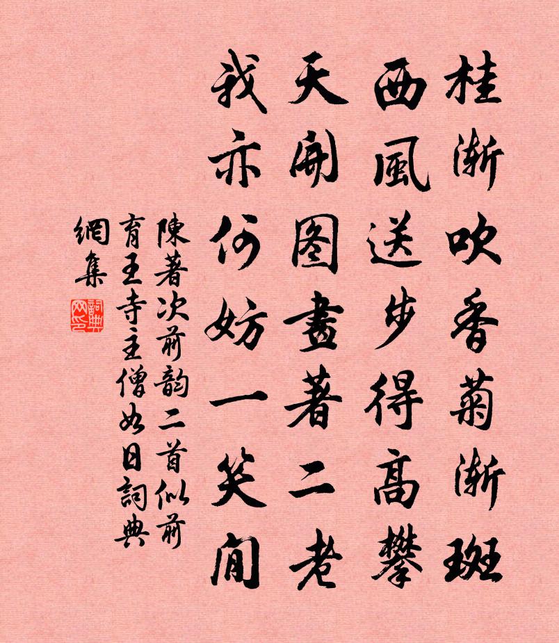 詩詞名句歷史字典書法欣賞書法字典國語詞典說文解字康熙字典古漢語字典標 題 作 者 詩 句 次前韻二首似前育王寺主僧如日作者:陳著 朝代:宋代原文桂漸吹香菊漸斑,西風送步得高攀。天開圖畫著二老,我亦何妨一笑閒。詩詞問答問:《次前韻二首似前育王寺主僧如日》的作者是誰?答:陳著問:該詩寫於哪個朝代?答:宋代書法欣賞次前韻二首似前育王寺主僧如日書法作品詩詞推薦讀陶集愛其致意於菊者八因作八首二曰空服方回〔宋代〕金英足可換君骨,綠醑寧當腐我腸。空服九華無九醞,帝鄉何似醉為鄉。書懷夏竦〔宋代〕黃閣有賢圖國計,皂囊無黨害邊功。河湟飲馬無難事,一點沙塵在目中。始建射侯韋應物〔唐代〕男子本懸弧,有志在四方。虎竹忝明命,熊侯始張皇。賓登時事畢,諸將備戎裝。星飛的屢破,鼓譟武更揚。曾習謝送桂花鄭清之〔宋代〕道眼如如了色空,維摩方病散花中。杜陵有酒勤相覓,留竢清齋出梵宮。臘夕直宿枕上偶成李洪〔宋代〕北風洶洶應嘉平,點滴檐間雨未晴。病骨可堪寒慄烈,老懷仍怯歲崢嶸。湯婆漫許登禪榻,黃你無因伴短檠。清絕偈頌十一首釋了演〔宋代〕臘月一,雪凍草枯,水寒冰結。黃河絕流,虛空迸裂。若將此語定綱宗,敢保老兄猶未徹。送邑宰丁溉之任滿陳著〔宋代〕君不見南山峰晴倚空,有時煙嵐失青蔥。又不見碑潭水清貫市,有時波濤漲黃滓。銅章一臨山水閒,變態有甚水與和張思濟縣尉韻二首袁說友〔宋代〕書債頻年積,舟行一水期。稍吟秋夜雨,不盡故人思。正為才高累,寧論事了嗤。相忘心屢折,落筆更蜚馳。王中庸赴河南鞏縣尉楊億〔宋代〕春風祖席引香醪,白馬驪駒草色袍。官舍前鹽兩京道,居民半雜五陵豪。卑飛碌碌猶棲棘,餘地飄飄暫鼓刀。捧檄野望宋祁〔宋代〕皋壤一搖落,年華此向闌。雪雲從北暝,霜日帶西寒。漿酒喧神鼓,風毛送獵鞍。去邦猶未遠,差認漢宮盤。感皇恩佚名〔宋代〕十月小春天,梅飄香細。九葉堯蓂已呈瑞。壽陽仙子,暫降羽衣環珮。林間風味,別人難比。齊眉共慶,勸聲鼎沸新栽竹白居易〔唐代〕佐邑意不適,閉門秋草生。何以娛野性?種竹百餘莖。見此溪上色,憶得山中情。有時公事暇,盡日繞欄行。勿言臨江仙(壽六十二)彭子翔〔宋代〕佛說波斯王此歲,衰顏羞見河流此首楞嚴。翁今丹臉發光浮。毗盧金 * ,爛熳菊花秋。七個明朝方九日,年年稅偶興四首韓元吉〔宋代〕小園無數菊花開,準擬花殘便見梅。不恨無花正無酒,敲門誰送一樽來。漁家傲周紫芝〔宋代〕遇坎乘流隨分了。雞蟲得失能多少。兒輩雌黃堪一笑。堪一笑。鶴長鳧短從他道。幾度秋風吹夢到。花姑溪上人空頌古三十六首釋惟一〔宋代〕曹溪門下南來燕,終日呢喃話祖翁。話盡離微人不會,不如養羽候秋負。菖蒲裘萬頃〔宋代〕康廬入吾懷,十載馳夢魂。踵門者何人,遺予以芳蓀。歡然得其趣,如對五老言。幽資出嚴谷,常帶冰雪痕。塵容點絳唇(周園分題得湖上聞樂)佚名〔宋代〕紫霧香濃,翠華風轉花隨輦。洞天雲暖。一片笙歌遠。水展龍舟,憶侍瑤池宴。閒庭院。夢回春半。雪鬢無人見。嵩山汪元量〔宋代〕行行太室峰,秋聲若鳴鏑。流目矚崎嶇,蓬萊應咫尺。上有神仙區,下有穆王宅。徘徊復徘徊,泫然感疇昔。八駿送中齋過家入燕陳杰〔宋代〕江浙相望半月程,燕雲萬里重行行。向多臨水登山賦,不盡還家去國情。三入換來金印大,三歸贏得彩衣明。東湖名句推薦故人何不返,春華復應晚。柳惲《江南曲》 無恆產而有恆心者,惟士為能。孟子《孟子·梁惠王章句上·第八節》 巧詐不如拙誠。韓非及後人《韓非子·說林上》 人以自是,反以相誹。呂不韋《呂氏春秋·覽·慎大覽》 柳花驚雪浦,麥雨漲溪田。李賀《南園十三首》 道由白雲盡,春與青溪長。劉昚虛《闕題》 清愁詩酒少,寒食雨風多。張鎡《寒食》 明月淨松林,千峰同一色。歐陽修《自菩提步月歸廣化寺》 舊山松竹老,阻歸程。岳飛《小重山·昨夜寒蛩不住鳴》 篤志而體,君子也。荀子《荀子·修身》