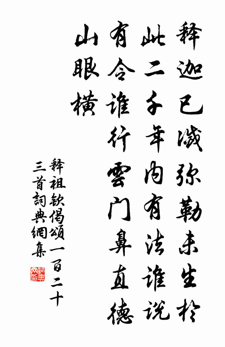 詩詞名句歷史字典書法欣賞書法字典國語詞典說文解字康熙字典古漢語字典標 題 作 者 詩 句 偈頌一百二十三首作者:釋祖欽 朝代:宋代偈頌一百二十三首原文釋迦已滅,彌勒未生。於此二千年內,有法誰說,有令誰行。雲門鼻直,德山眼橫。詩詞問答問:偈頌一百二十三首的作者是誰?答:釋祖欽問:偈頌一百二十三首寫於哪個朝代?答:宋代釋祖欽偈頌一百二十三首書法欣賞偈頌一百二十三首書法作品詩詞推薦留客趙汝鐩〔宋代〕闊疏方在念,飛蓋忽相過。酒缺鄰堪覓,詩成子自喔。添羹挑野菜,包鮓就池荷。莫屢辭歸去,余樽亦不多。送孫肖之還縉雲王銍〔宋代〕蓬蒿頻歲掩鄉關,再喜相逢一破顏。遊子年華紅葉老,幽人風味白雲閒。那知篋裹書成後,猶作溪邊興盡還。流落普明亭賦韓維〔宋代〕楊柳飛花盡,櫻桃結子成。蹊陰空淨綠,野艷有孤明。訪古重來地,傷春獨望情。幽禽亦何恨,百種向人鳴。虞美人劉辰翁〔宋代〕無花敢與姚黃比。對對鴛鴦起。識他金帶萬釘垂。誰向麒麟楦里、卸猴緋。潛溪以上難為說。自是君恩別。後來西江郊(並引)蘇軾〔宋代〕惠州歸善縣治之北數百步抵江,少西有盤石小潭,可以垂釣,作《江郊》詩云。江郊蔥曨,雲水蒨絢。碕岸斗入,傷感釋文珦〔宋代〕百萬長驅入戰塵,幾人能保去時身。古來戰將知多少,盡作青青塞草春。題花光梅十首高下隨宜王柏〔宋代〕亞水凌空任短長,枝枝風度要平章。一樽月下吞花影,剔在須頭點點香。題門壁陸游〔宋代〕四十年來住此村,勝衣拜起有曾孫。市壚分熟容賒酒,鄰舍情親每饋餐。居似窮邊荒馬驛,身如深谷老桑門。幸知南池晨望羊士諤〔唐代〕起來林上月,瀟灑故人情。鈴閣人何事,蓮塘曉獨行。衣沾竹露爽,茶對石泉清。鼓吹前賢薄,群蛙試一鳴。晚出江城聞角賀鑄〔宋代〕古壕沮洳荷葉枯,矍鑠禿鶖行且漁。山銜日腳水關掩,孤樓引角吹單于。胡馬嘶風興非淺,壯圖舊跡隨塵卷。秋盡開歲半月湖村梅開無餘偶得五詩以煙濕落梅村陸游〔宋代〕昨日春已來,盎盎滿江村;落梅亦多情,點點浮清樽。語離聊一醉,不恨村酒渾。人生共如此,已矣兩忘言!雨中水閣閒眺蘇泂〔宋代〕朝看雨腳似懸繩,暮見寬波沒釣汀。鴨鴨歸來人寂寂,鴉鴉飛去草青青。次敬叔韻二首裘萬頃〔宋代〕別我新詩有許清,玉聲金韻兩琮錚。筆端定自翻三峽,乞與餘波賦贈行。一翦梅(贈紫雲友)葛長庚〔宋代〕劍倚青天笛倚樓。雲影悠悠。鶴影悠悠。好同攜手上瀛洲。身在閻浮。業在閻浮。一段紅雲綠樹愁。今也休休。古再自隆興還游至德觀曾豐〔宋代〕水眼通三島,波心涌一峰。兩岸懸石穩,千古怒濤樁。呵劍敺游蜃,鞭雷起蟄龍。仙人有餘量,事了豈留蹤。入閩方岳〔宋代〕山雲底事夜來雨,藏卻奇峰不與看。政說雨中看更好,劃然捲起出晴巒。初夏徐璣〔宋代〕一雨臨初夏,驚雷昨夜新。地晴煙冉冉,堤漲淥鱗鱗。蘭麝銷衣潤,珊瑚淨幾塵。牆陰舊無竹,筍過謝東鄰。釣台方信孺〔宋代〕釣得神魚金作鱗,廢台百尺漫嶙峋。絲綸不入非熊夢,當日何人老渭濱。雪夜黃州城下趙廱〔宋代〕雪後人家早閉門,江寒水落見沙痕。黃州城下東坡路,月浸梅花正斷魂。立春前一日作陸游〔宋代〕開年化日己舒長,漸見風和烏變吭。冒土萓芽抽嫩綠,拂橋柳色弄輕黃。重溫壽酒屠蘇釅,探借春盤餅餌香。不入名句推薦綠葉翠莖,冒霜停雪。左思《三都賦》 雨後雙禽來占竹,秋深一蝶下尋花。文同《北齋雨後》 忠告而善道之,不可則止,毋自辱焉。孔子弟子《論語·顏淵篇》 臥龍躍馬終黃土,人事音書漫寂寥。杜甫《閣夜》 憑誰問,廉頗老矣,尚能飯否?辛棄疾《永遇樂·京口北固亭懷古》 上林訊息好,鴻雁已歸來。張元乾《臨江仙·送宇文德和被召赴行在所》 楊枝飄泊,桃根嬌小,獨自個思量。項鴻祚《太常引·客中聞歌》 江山如有待,花柳自無私。杜甫《後游》 規小節者不能成榮名,惡小恥者不能立大功。司馬遷《史記·七十列傳·魯仲連鄒陽列傳》 飛雪過江來,船在赤欄橋側。呂渭老《好事近·飛雪過江來》