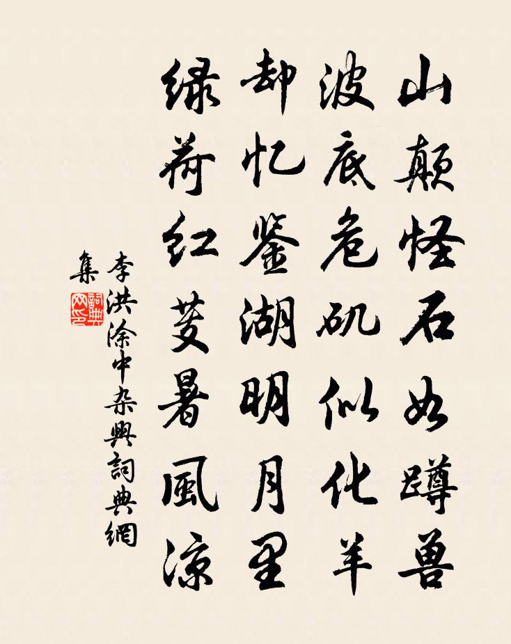 詩詞名句歷史字典書法欣賞書法字典國語詞典說文解字康熙字典古漢語字典標 題 作 者 詩 句 塗中雜興作者:李洪 朝代:宋代塗中雜興原文山顛怪石如蹲獸,波底危磯似化羊。卻憶鑑湖明月里,綠荷紅芰暑風涼。詩詞問答問:塗中雜興的作者是誰?答:李洪問:塗中雜興寫於哪個朝代?答:宋代李洪塗中雜興書法欣賞塗中雜興書法作品詩詞推薦先醉元稹〔唐代〕今日樽前敗飲名,三杯未盡不能傾。怪來花下長先醉,半是春風盪酒情。句魚玄機〔唐代〕焚香登玉壇,端簡禮金闕。明月照幽隙,清風開短襟。綺陌春望遠,瑤徽春興多。殷勤不得語,紅淚一雙流。雲情【中呂】喜春來_六藝禮夙興馬致遠〔元代〕六藝禮夙興夜寐尊師行,動止渾絕浮浪名,身潛詩禮且陶情。柳溪中,人世小蓬瀛。樂宮商律呂隨時奏,散慮焚香永嘉水員興宗〔宋代〕鄭侯興言水於溫,厥災茫昧數莫源。於時頑秋後中元,淫虹曳曳妖暈噴。夜星不呈墨微垣,鬱律撼怒排天根。擺磨舟中讀書宋琬〔清代〕久拋青簡束行幐,白鳥蒼蠅甚可憎。身是蠹魚酬夙債,黃河浪里讀書燈。潘大臨蓮池二首張耒〔宋代〕避暑人人得自怡,坐曹最苦劇囚累。江邊金石焦流日,堂上糟漿酷烈時。一酌甘寒煩素綆,終朝揮拂倦蒲葵。誰知紹興祀岳鎮海瀆四十三首佚名〔宋代〕青陽筆開,祀事也飭。在人贊溉,其聲苾苾。敬爾威備,亦孔之則。神之格思,無我有斁。梁大壯大觀舞歌 大壯舞歌沈約〔南北朝〕高高在上。實愛斯人。眷求聖德。大拯彝倫。率土方燎。如火在薪。惵惵黔首。暮不及晨。朱光啟耀。兆發穹旻。次韻王侍御夜宿高牙喻良能〔宋代〕相別三時久,相望望城賒。攜書期過雁,徙倚至昏鴉。風雨番君國,雲煙夔子家。何時趣歸覲,重許拜高牙。輦下會裡人子蒙飲黃庶〔宋代〕秋風吹客衣,歸思入夢寐。相逢在千里,一飲勝百醉。果脯隨分列,不減到家味。平生金石心,顛倒獨莫棄。何時東陂遇雨,率爾貽謝南池孟浩然〔唐代〕田家春事起,丁壯就東陂。殷殷雷聲作,森森雨足垂。海虹晴始見,河柳潤初移。予意在耕鑿,因君問土宜。木蘭花慢陳德武〔宋代〕一春看又盡,問何日、是歸年。望五嶺重關,九嶷疊翠,滿目藩垣。蒼梧幾時艤棹,許論文、高議仰英賢。夜立殘風入松 湖上九日張可久〔元代〕哀箏一抹十三弦。飛雁隔秋煙。攜壺莫道登臨晚,雙雙燕、為我留連。仙客玲瓏玉樹,佳人窄索金蓮。琅琅新雨洗長慶二年七月自中書舍人出守杭州,路次藍溪作白居易〔唐代〕太原一男子,自顧庸且鄙。老逢不次恩,洗拔出泥滓。既居可言地,願助朝廷理。伏閣三上章,戇愚不稱旨。聖人臘月二十四夜同成父對所傳贛陳丞詩作此寄陳趙蕃〔宋代〕旁舍箠楚息,小齋燈火同。猶貪誦詩發,未暇問人窮。笑我尉方暇,憶渠丞不聾。移官故相近,得句可郵筒。秋熱二首楊萬里〔宋代〕年年極暑與秋期,日日秋陽在暮時。我自愁吟無意思,蟬聲移近入檐枝。除夜酬樂天元稹〔唐代〕引儺綏旆亂毿毿,戲罷人歸思不堪。虛漲火塵龜浦北,無由阿傘鳳城南。休官期限元同約,除夜情懷 * 諳。莫道路中對月曾鞏〔宋代〕山川困遊人,而不斷歸夢。其餘惟日月,朝夕南北共。日光碟機人身,擾擾逐群動。鄉思須暫忘,世事哪止重。豈如雁兒落兼得勝令張養浩〔元代〕往常時為功名惹是非,如今對山水忘名利;往常時趁雞聲赴早朝,如今近晌午猶然睡。往常時秉笏立丹墀,如今把寄陳魯山陸游〔宋代〕天下無虞國論深,書生端合老山林。平生力學所得處,政要如今不動心。舊友幾年猶短褐,謫官萬里少來音。願公名句推薦惜恐鏡中春。不如花草新。張先《菩薩蠻·憶郎還上層樓曲》 楊柳散和風,青山澹吾慮。韋應物《東郊》 昔人已乘黃鶴去,此地空餘黃鶴樓。崔顥《黃鶴樓 / 登黃鶴樓》 女兒年幾十五六,窈窕無雙顏如玉。蕭衍《東飛伯勞歌》 五原秋草綠,胡馬一何驕。李白《塞上曲》 我愛山中夏,空冥花雨下。元鵬《山中四詠》 獨立寒秋,湘江北去,橘子洲頭。 * 《沁園春·長沙》 嬌艷輕盈香雪膩,細雨黃鶯雙起。張泌《滿宮花·花正芳》 二月賣新絲,五月糶新谷。聶夷中《詠田家 / 傷田家》 入我相思門,知我相思苦,李白《三五七言 / 秋風詞》