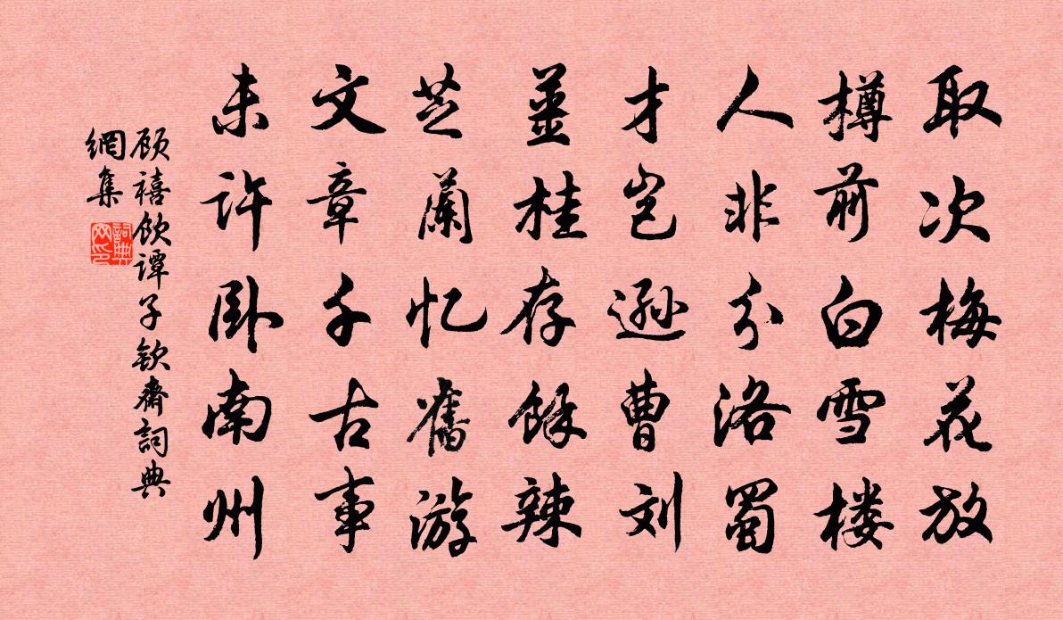 詩詞名句歷史字典書法欣賞書法字典國語詞典說文解字康熙字典古漢語字典標 題 作 者 詩 句 飲譚子欽齋作者:顧禧 朝代:宋代飲譚子欽齋原文取次梅花放,樽前白雪樓。人非分洛蜀,才豈遜曹劉。薑桂存余辣,芝蘭憶舊遊。文章千古事,未許臥南州。詩詞問答問:飲譚子欽齋的作者是誰?答:顧禧問:飲譚子欽齋寫於哪個朝代?答:宋代顧禧飲譚子欽齋書法欣賞飲譚子欽齋書法作品詩詞推薦戲為妓山氏作康執權〔宋代〕昔日緹縈亦如許,盡道生男不如女。河陽滿縣皆春風,忍使梨花偏帶雨。沁園春毛滂〔宋代〕秀稟元精,靈鍾崧岳,命世大賢。自飛英任路,承流百里,郎官星彩,輝映經躔。勁柏凌霜,香梅嬌雪,珪月彎彎晚次新豐北野老家書事呈贈韓質明府盧綸〔唐代〕機鳴舂響日暾暾,雞犬相和漢古村。數派清泉 * 盛,一林寒露紫梨繁。衰翁正席矜新社,稚子齊襟讀古論。共說蕪城仲並〔宋代〕鶯歌燕語戲晴暉,日暮行人緩緩歸。十里蕪城春色晚,回頭往事已全非。鵲橋仙 己酉山行書所見辛棄疾〔宋代〕松岡避暑,茅檐避雨,閒去閒來幾度?醉扶孤石看飛泉,又卻是、前回醒處。東家娶婦,西家歸女,燈火門前笑語句佚名〔宋代〕社近記穿黃增子,雨前趲摘紫槍旗。塞垣行(一作崔融詩)崔湜〔唐代〕疾風卷溟海,萬里揚砂礫。仰望不見天,昏昏竟朝夕。是時軍兩進,東拒復西敵。蔽山張旗鼓,間道潛鋒鏑。精騎貢院中戲從元禮求酒司馬光〔宋代〕顧我虛罍恥,知君餘瀝多。庭前有春雪,如此薄寒何。導引佚名〔宋代〕上林寒早,仙仗轉郊圻。笳鼓入雲悲。逶迤輦路過西池。樓閣鎖參差。都人瞻望意如疑。猶想翠華歸。玉京傳信杳詩陸機〔魏晉〕惆悵懷平素。豈樂於茲同。豈宴棲末景。游豫躡余蹤。曉炊黃竹莊三首楊萬里〔宋代〕城中殊未有梅看,莫是冬暄欠淺寒。行到深山最寒處,兩株香雪照冰灘。赴舉出山留寄山居鄭參軍李昭象〔唐代〕還如費冠卿,向此振高名。肯羨魚須美,長夸鶴氅輕。理琴寒指倦,試藥黑髭生。時泰難雲臥,隨看急詔行。花時遍游諸家園陸游〔宋代〕為愛名花抵死狂,只愁風日損紅芳。綠章夜奏通明殿,乞借春陰護海棠。大橫屏舒岳祥〔宋代〕燖鵝急雪灑斑斑,疊嶂層巒浩渺間。拳鷺失巢無倚著,卻隨蓬背下江灣。偈頌七十六首釋子益〔宋代〕日可冷,月可熱眾魔不能壞真說。且作麽生是真說,屋頭泉溜響無休,砌下寒蛩聲更切。思親姜特立〔宋代〕富貴來時不見親,永懷恩德倍酸辛。如今有祿肥妻子,誰念孀孤泉下人。春雪東方虬〔唐代〕春雪滿空來,觸處似花開。不知園裡樹,若個是真梅。歸途葉茵〔宋代〕春來天氣半陰晴,那更賓士一月程。又恐花時成草草,還家插柳佐清明。別友裘萬頃〔宋代〕清宵月滿梁,相思幾搔首。不圖塵土中,得共一尊酒。人事好乖甚,隨復而分手。惟有管鮑心,明明若箕斗。夏日雜感四首張耒〔宋代〕群動入夜息,我歸亦安眠。脫我身上衣,援枕體晏然。朝日常營營,有生不可聞。羲和戢其光。幸此須臾間。人生名句推薦傍鄰聞者多嘆息,遠客思鄉皆淚垂。李頎《聽安萬善吹觱篥歌》 未有知而不行者。王陽明《傳習錄·卷上·徐愛錄》 誠者,不勉而中不思而得:從容中道,聖人也。子思《中庸·第二十章》 十年生死兩茫茫,不思量,自難忘。蘇軾《江城子·乙卯正月二十日夜記夢》 春潮帶雨晚來急,野渡無人舟自橫。韋應物《滁州西澗》 九華山路雲遮寺,清弋江村柳拂橋。杜牧《宣州送裴坦判官往舒州時牧欲赴官歸京》 落葉委埏側,枯荄帶墳隅。潘安《悼亡詩三首》 休言萬事轉頭空,未轉頭時皆夢。蘇軾《西江月·平山堂》 花時同醉破春愁,醉折花枝作酒籌。白居易《同李十一醉憶元九》 越梅半拆輕寒里,冰清淡薄籠藍水。和凝《菩薩蠻·越梅半拆輕寒里》