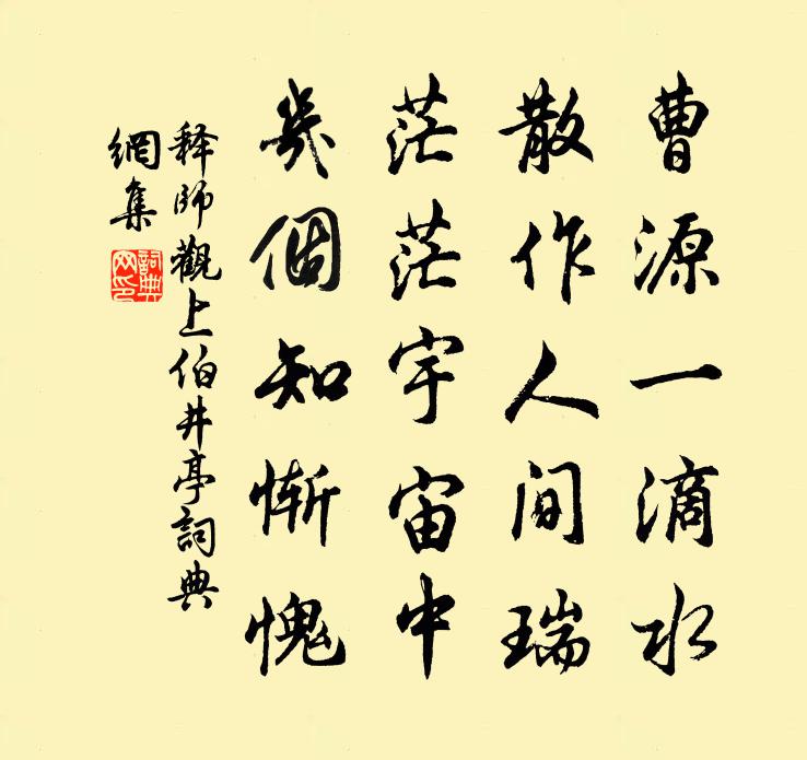 詩詞名句歷史字典書法欣賞書法字典國語詞典說文解字康熙字典古漢語字典標 題 作 者 詩 句 上伯井亭作者:釋師觀 朝代:宋代上伯井亭原文曹源一滴水,散作人間瑞。茫茫宇宙中,幾個知慚愧。詩詞問答問:上伯井亭的作者是誰?答:釋師觀問:上伯井亭寫於哪個朝代?答:宋代釋師觀上伯井亭書法欣賞上伯井亭書法作品詩詞推薦寒山拾得贊釋梵琮〔宋代〕寒拾相逢便拍肩,雙收雙放笑掀天。古今一片閒田地,露出尋常茗菷邊。朝中措(帥生日)洪适〔宋代〕斗南樓閣舞祥雲。為壽幾多人。有酒恰如東海,年年為滿金尊。無雙治行,兒童詠德,草木沾仁。只把空虛三院,挽吳君謀少卿二首劉克莊〔宋代〕吳公卿尚少,劉叟耄而迂。一任群兒謗,相輝九老圖。客誰哭橫墓,友可托嵇孤。心折蟆陵路,終當酹束芻。夜坐蔡權〔宋代〕露冷風高天氣清,中秋月色更發明。捫懷永夜心同照,抱膝孤燈興自傾。漏盡欣無塵客坐,鐘鳴恍有老仙迎。歸來東嘉倦雨遣興有懷浙右兄弟二十韻李洪〔宋代〕南國地卑濕,兼旬雨不停。氣昏江練白,雲蔽石崖青。倦聽涔涔霤,全遮渺渺汀。柳低齊戶牖,竹密亞窗欞。壞壁和寄仵判院八首趙希逢〔宋代〕古壁傷情憶舊題,連天芳草望空迷。沉吟此意向誰說,合盡碧雲日又西。摸魚子許有孚〔元代〕買陂塘旋栽楊柳,佳人屢輟齋務。扁舟蕩漾亭深處,堪避片雲疏雨。明月渚。有仙子凌波,解佩留芳嶼。園丁亦語度自到洛中與樂天為文酒之會時時構詠樂不可…因為聯句裴度〔唐代〕成周文酒會,吾友勝鄒枚。唯憶劉夫子,而今又到來。 ——裴度欲迎先倒屣,亦坐便傾杯。飲許送葉若磯之金陵竭信庵柴望〔宋代〕一片斜陽落渡頭,青衫烏帽獨登樓。江流建業三千里,山色淮南數百州。都督正開羊祜府,誰人得上李膺舟。此行閣皁陶弼〔宋代〕萬仞天然皁閣形,陰陽不似眾山青。一區海上神仙宅,數曲人間水墨屏。華表鶴歸春谷響,玉京龍起夜潭腥。可憐謝戴安撫書院額釋印肅〔宋代〕普庵以此香,回向大居士。幻盡覺圓者,妙意難遮覆。惠我二筆端,三昧非迷悟。世間豈識知,何處尋門戶。六字和程公辟大卿游越山亭陳襄〔宋代〕荔子園林海日邊,幽亭更在碧雲巔。江山舊是無諸國,樓殿今為極欒天。五馬如君多暇少,一樽惟我共游偏。須知贈杜鼎升張及〔宋代〕家本樊川老蜀都,世家冠劍豈寒儒。筆耕尚可儲三載,酒戰猶能敵百夫。僻愛舜琴湘水弄,每懸孫畫醉仙圖。孟光臥治齋晚坐楊萬里〔宋代〕閉戶坐不得,開窗貯微涼。樹林蔭白日,兒研生碧光。信手取詩卷,細喔三數章。初披頗欣愜,再攬忽感傷。廢卷寄廬岳鑒上人李中〔唐代〕岳寺棲瓶錫,常人親亦難。病披青衲重,晚剃白髭寒。烘壁茶煙暗,填溝木葉乾。昔年皆禮謁,頻到碧雲端。次韻蹇侍郎天元殿門芝草蘇頌〔宋代〕列聖儲靈貺,坤珍應祀儀。分葩對牟首,觀瑞駐華芝。毓德繇皇始,彰功在聖時。早聞縈殿桷,復見孕門楣。自有余臥病畿邑御史王君假守潭楚道出於舍下特見宋庠〔宋代〕病客臥窮里,衡扉掩殘春,隳官道家藏,竄跡農廛民。朝羅噪飢雀,暮席流芳塵。屍居怳踰歲,踵息動彌旬。忽訝謁陶唐帝廟詞張栻〔宋代〕溪交流兮谷幽,山作屏兮層丘。木偃蹇兮枝相謬,皇胡為兮於此留。藹冠佩兮充庭,潔芳馨兮載陳。純衣兮在御,舊愁朱淑真〔宋代〕銀屏屈曲障春風,獨抱寒衾睡正濃。啼鳥一聲驚破夢,亂愁依舊鎖眉峰。北池陶弼〔宋代〕句漏城中菡萏池,池邊台榭半空基。頻年太守多新額,棄代思賢有舊碑。名句推薦二月黃鶯飛上林,春城紫禁曉陰陰。錢起《贈闕下裴舍人》 馬上逢寒食,愁中屬暮春。宋之問《途中寒食題黃梅臨江驛寄崔融》 惟順於父母,可以解憂。孟子《孟子·萬章章句上·第一節》 為世用者,百篇無害;不為用者,一章無補。王充《論衡·卷三十·自紀篇》 雪霏霏,風凜凜,玉郎何處狂飲?魏承班《滿宮花·雪霏霏》 竹色溪下綠,荷花鏡里香。李白《別儲邕之剡中》 金樽清酒斗十千,玉盤珍羞直萬錢。李白《行路難·其一》 日暮秋煙起,蕭蕭楓樹林。戴叔倫《過三閭廟》 管中窺豹,所見不多;坐井觀天,知識不廣。程登吉《幼學瓊林·卷三·人事》 張翰江東去,正值秋風時。李白《送張舍人之江東》