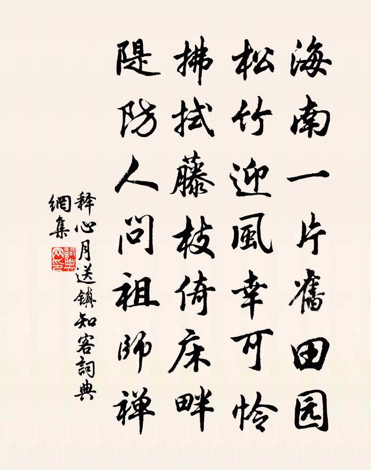 詩詞名句歷史字典書法欣賞書法字典國語詞典說文解字康熙字典古漢語字典標 題 作 者 詩 句 送鎮知客作者:釋心月 朝代:宋代送鎮知客原文海南一片舊田園,松竹迎風幸可憐。拂拭藤枝倚床畔,隄防人問祖師禪。詩詞問答問:送鎮知客的作者是誰?答:釋心月問:送鎮知客寫於哪個朝代?答:宋代釋心月送鎮知客書法欣賞送鎮知客書法作品詩詞推薦湘妃廟李群玉〔唐代〕少將風月怨平湖,見盡扶桑水到枯。相約杏花壇上去,畫欄紅紫斗樗蒲。鷓鴣天(歐倩)趙彥端〔宋代〕梅粉新妝間玉容。壽陽人在水晶宮。浴殘雨洗梨花白,舞轉風搖菡萏紅。雲枕席,月簾櫳。金爐香噴鳳幃中。凡材題李公麟山莊圖其九秘全庵蘇轍〔宋代〕世道自破碎,全理未嘗違。溪山亦何有,永覺平日非。俞公達待制輓詞二首秦觀〔宋代〕詞場英妙氣如虹,出入青雲見事功。流馬木牛通蜀漕,葛巾羽扇破渠戎。風生使者旌旄上,春在將軍俎豆中。詔墨寄夷白坦然吳則禮〔宋代〕北湖飯飽初不知,惟見從來方朵頤。天公大似撩吾輩,不遣細和夔州詩。收麥呈王松齡秀才晁補之〔宋代〕晁莊寂莫依東山,王莊負郭容往還。東山刺薊深一尺,負郭家近饒盤餐。穿鞋戴笠隨麥隴,旱日炎炎煙燎顏。賤貧滿庭芳 西園席間用人韻耶律鑄〔元代〕酒陣詩壇,徵兵命將,得無傾動華筵。擬勤春事,還自要相先。天地元如逆旅,應自愧、不駐流年。憑誰問,娥鏡中嘆白髮呂溫〔唐代〕年過潘岳才三歲,還見星星兩鬢中。縱使他時能早達,定知不作黑頭公。挾彈篇梅堯臣〔宋代〕長安細侯年尚小,獨出春郊不須曉。手持柘彈霸陵邊,豈惜金丸射飛鳥。金丸射盡飛鳥空,解衣市酒向新豈。醉倒西歸七首次韻和泗州十五叔父一晁補之〔宋代〕潔腹不受污,昔人因食薇薇亦周土生,悲哉懷永飢武王與周公,聖德天動威奈此二子何,猶嘆安適歸次幽居蔡槃〔宋代〕卻粒燒丹未有方,且逃人事住山房。冷看桐葉含秋思,間掃苔花背夕陽。牆壁遍題無酒句,衣裳多帶搗茶香。雲深念奴嬌(五和)劉克莊〔宋代〕隆乾間事,兩翁有、手澤遺編曾紀。余掌蘭台修纂到,景定初開忠邸。抔起復麻,奮塗歸筆,嚼碎張巡齒。德音猶百丈山鄭樵〔宋代〕疊嶂聯屏飛遠近,風情物色有餘涯。回頭四顧東西地,多少礪山莊帝家。奉和隨王殿下詩 八謝朓〔南北朝〕愴愴緒獨興。祁祁族雲布。嚴氣集高軒。稠陰結寒樹。日月謬論思。朝夕承清豫。徒藉小山文。空揖章台賦。感事吟邵雍〔宋代〕理順面前皆道路,義乖門外是榛荊。何人肯認皆言語,此語分明人不聽。開禧元年四月自中都挈家還鄉寓居城南十二月汪莘〔宋代〕每恨投南鵲,尤憐向北枝。雖蒙今士笑,恐有後人思。運火解朝凍,咽津棄夜飢。不來溪上住,那得雪中詩。秋祀高禖二絕蘇轍〔宋代〕乾德年中初一新,頹坦破瓦委荊榛。興亡舉墜干戈際,閒暇方知國有人。失調名黃庭堅〔宋代〕直須把、茱萸遍插,看滿座、細嗅清香。神宗皇帝輓詞五首司馬光〔宋代〕至德成無象,徽名避不居。期門弋獵絕,步輦宴遊疏。錢列金釭暗,兵嚴武帳虛。蓬萊日晏仗,猶望駕宮車。春陰晏殊〔宋代〕十二重環閟洞房,愔愔危樹俯回塘。風迷戲蜨間無緒,露裛幽花冷自香。綺席醉吟銷桂酌,玉台愁作澀銀簧。梅青名句推薦舉大事,必慎其終始戴聖《禮記·文王世子》 此身行作稽山土,猶吊遺蹤一泫然。陸游《沈園二首》 惻隱之心,人皆有之孟子《孟子·告子章句上·第六節》 濃似春雲淡似煙,參差綠到大江邊。紀昀《富春至嚴陵山水甚佳》 臨官莫如平,臨財莫如廉。劉向《說苑·政理》 一去無訊息,那能惜馬蹄。薛道衡《昔昔鹽》 大丈夫相時而動。曹雪芹《紅樓夢·第四回》 百結愁腸郁不開,此生惆悵異鄉來。秋瑾《九日感賦》 驟雨過,珍珠亂撒,打遍新荷。元好問《驟雨打新荷》 萬里人南去,三春雁北飛。韋承慶《南中詠雁詩》
