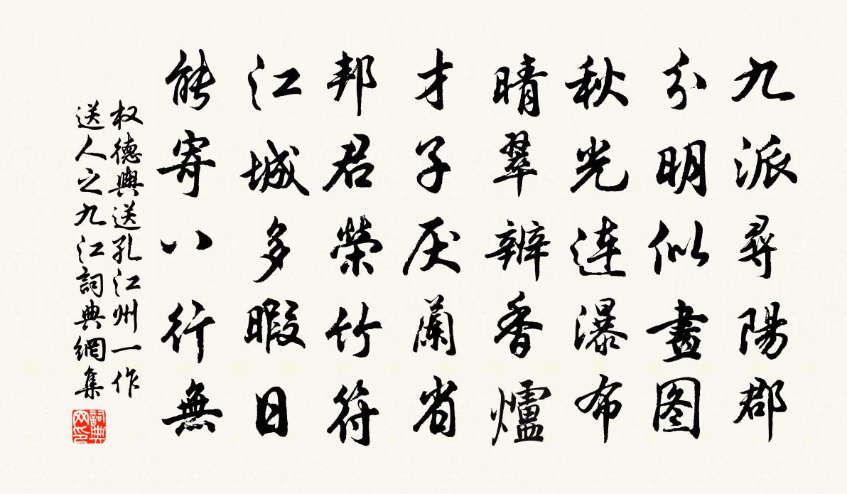 詩詞名句歷史字典書法欣賞書法字典國語詞典說文解字康熙字典古漢語字典標 題 作 者 詩 句 送孔江州(一作送人之九江)作者:權德輿 朝代:唐代原文九派尋陽郡,分明似畫圖。秋光連瀑布,晴翠辨香爐。才子厭蘭省,邦君榮竹符。江城多暇日,能寄八行無。詩詞問答問:《送孔江州(一作送人之九江)》的作者是誰?答:權德輿問:該詩寫於哪個朝代?答:唐代問:該詩是什麼體裁?答:五律書法欣賞送孔江州(一作送人之九江)書法作品注釋全唐詩:卷324-2詩詞推薦游五泄書呈完夫節推丁寶臣〔宋代〕莫厭幽尋路險辛,細思容易是山神。能收地巧藏深處,不惜天奇示俗人。古有少陵吟未到,今無摩詰畫難真。海邊六和塔僧房蒲壽宬〔宋代〕天風語檐鈴,蒼靄藏古殿。穿竹逢緇衣,拈花對黃面。誰把山水心,為我露一線。推窗古樹隙,空水還匹練。山色賀新郎趙長卿〔宋代〕負你千行淚。大都來、一寸心兒,萬般縈系。似恁愁煩那裡洎。故自三年二歲。為你後、甘心憔悴。終待說、山盟和陳郎中時舉清夜不寐陳杰〔宋代〕四檐殘溜雜風鈴,長夜遙空候啟明。綠鬢望郎猶不寐,白頭遺老得無情。幾時畫角吹愁徹,何處黃粱做夢成。一笑贈趙公旦張嵲〔宋代〕少年意氣隘九州,遠別不為兒女愁。只今摧頹落異縣,跬步信宿生離憂。況今送子又千里,使我別緒何能休。憶昔送元勛不伐侍親之官泉南八首李廌〔宋代〕解知身世兩鴻毛,肯羨一鉤連六鰲。有口惟宜醉醇酒,時時痛飲讀離騷。深夜謠二首曹勛〔宋代〕月影移鳷鵲,鑪香滿建章。君王駐琱輦,宮女出彤房。仙樂浮雲漢,笙歌繞畫梁。按圖皆國色,何處是高唐。蘇幕遮 示李梁張三人王處一〔元代〕李張梁,聽少告。休恁躊躇,縱得心顛倒。每恨玉陽無答報。似此修行,何日歸蓬島。大唐僧,九度老。萬種難辛送楚建中潁州法曹歐陽修〔宋代〕冠蓋盛西京,當年相府榮。曾陪鹿鳴宴,◇識洛陽生。共嘆長沙◇,空存許劭評。堪嗟桃李樹,何日見陰成。宮怨任翻〔唐代〕淚乾紅落臉,心盡白垂頭。自此方知怨,從來豈信愁。彭孝求以詩送芍藥雲今年厄閏不佳且許紅都勝周必大〔宋代〕厄閏黃楊古所傳,翻階紅藥豈其然。明年果得真都勝,便是雙鶬一箭穿。送嚴二擢第東歸李嘉祐〔唐代〕隳官就賓薦,時輩詎爭先。盛業推儒行,高科獨少年。迎秋見衰葉,餘照逐鳴蟬。舊里三峰下,開門古縣前。宜祿昭仁寺後軒文同〔宋代〕危欄憑絕壑,欲奈此時何。但有夕陽處,就中秋色多。與誰同徒倚,空自發吟喔。便覺成羈旅,歸心逐雁過。紹興朝會十三首佚名〔宋代〕帝德誕敷,銷燁群惹。近悅近來,惟聖時克。玉振金聲,治功興起。韶箾象之,盡善盡美。瑞鶴仙(別恨)康與之〔宋代〕薄寒羅袖怯。教小玉添香,被翻宮襭。蘭缸半明滅。聽幾聲歸雁,一簾微月。情波恨葉。索新詞、猶自怨別。夢回諷鍊金方士唐寅〔明代〕破衣衫中破布裙,逢人便說會燒銀。 君何不 * 些用,擔水河頭賣與人。 偈頌一百二十三首釋崇岳〔宋代〕有時堆堆坐禪,有時一向打哄。年來行腳衲僧,都是個般病痛。報君知,休打哄。入門拚卻個渾身,頭頭自有生蛇嘲蝶釋文珦〔宋代〕耳聲眼色總非真,物我同為一窖塵。蝴蝶不知身是夢,花間栩栩過青春。有杕之杜佚名〔先秦〕有杕之杜,生於道左。彼君子兮,噬肯適我?中心好之,曷飲食之?有杕之杜,生於道周。彼君子兮,噬肯來游?和劉編修潛夫讀近報蔣峴被逐二首王邁〔宋代〕讀報欣然共賦詩,古來忠佞各殊岐。彼猶愧見蔣穎叔,君盍自期劉器之。惡草剪除雖一快,芳蘭銷歇已多時。懷哉名句推薦清夜何湛湛,孤燭映蘭幕。江淹《銅爵妓》 美人贈我錦繡段,何以報之青玉案。張衡《四愁詩》 五月天山雪,無花只有寒。李白《塞下曲六首·其一》 人人親其親、長其長而天下平。孟子《孟子·離婁章句上·第十一節》 結交在相知,骨肉何必親。佚名《箜篌謠》 欲剪箱中一尺天,吳娥莫道吳刀澀李賀《羅浮山父與葛篇》 明妃留在兩眉愁,萬古春山顰不盡元好問《玉樓春·驚沙獵獵風成陣》 雍雍新雁咽寒聲,愁恨年年長相似。李煜《謝新恩·冉冉秋光留不住》 闌風伏雨催寒食,櫻桃一夜花狼藉。納蘭性德《菩薩蠻·闌風伏雨催寒食》 積善之家,必有餘慶;積不善之家,必有餘殃。王永彬《圍爐夜話·第十五則》