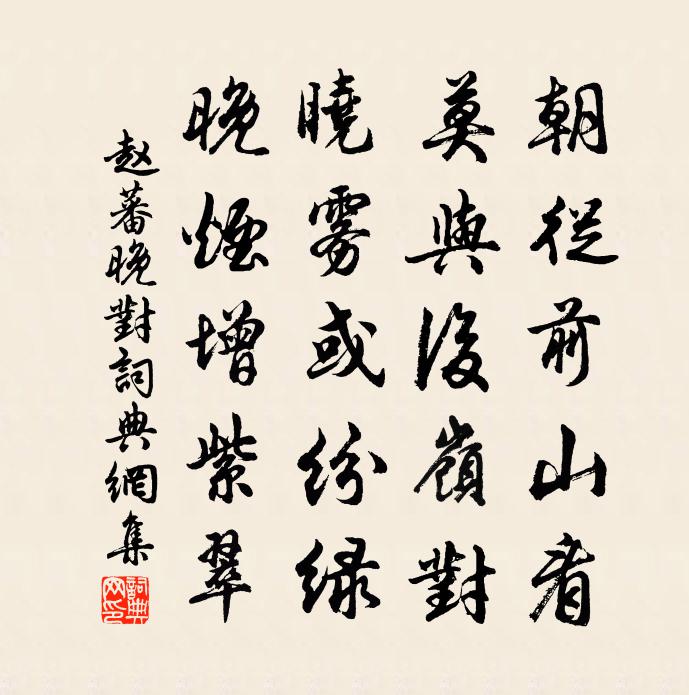 詩詞名句歷史字典書法欣賞書法字典國語詞典說文解字康熙字典古漢語字典標 題 作 者 詩 句 晚對作者:趙蕃 朝代:宋代晚對原文朝從前山看,莫與後嶺對。曉霧或紛綠,晚煙增紫翠。詩詞問答問:晚對的作者是誰?答:趙蕃問:晚對寫於哪個朝代?答:宋代趙蕃晚對書法欣賞晚對書法作品詩詞推薦句高湘〔唐代〕惟有高州是當家。江城子袁易〔元代〕爛鋪蜀錦寫烏絲。憶傾卮。燕來時。猶記半揎,雲袖見凝脂。燕子只今何處去,庭院悄,誤心期。綠蕪凋盡眾芳遲題張提舉西野徐照〔宋代〕渡頭風景如前日,誰種桃花在兩邊。未晚人家門戶閉,鷺鷥閒立釣魚船。夜徐寅〔唐代〕日墮虞淵燭影開,沉沉煙霧壓浮埃。剡溪雪滿子猷去,漢殿月生玉母來。檐掛蛛絲應漸織,風吹螢火不成灰。愁人送人北游張詠〔宋代〕慈親別幾時,又作北游期。萬馬方征虜,腳踏車欲訪誰。遠身孤劍共,幽抱素琴知。應渡黃河夕,波濤驚夢思。周祀圜丘歌 雲門舞庾信〔南北朝〕獻以誠。郁以清。山罍舉。沉齊傾。惟尚饗。洽皇情。降景福。通神明。送紫霄女道士四明謝君陸游〔宋代〕一別南充十四年,時時清夢到金泉。山 * 上秋風早,卻見神仙小自然。秋雨嘆三首杜甫〔唐代〕雨中百草秋爛死,階下決明顏色鮮。著葉滿枝翠羽蓋,開花無數黃金錢。涼風蕭蕭吹汝急,恐汝後時難獨立。堂上郡中上元燈減舊例三之二而又迎送使客七首楊萬里〔宋代〕雪後樓台欲暮時,遊人只道上燈遲。月輪貼在梅花背,錯認梅枝作桂枝。敘懷寄高推官齊己〔唐代〕搜新編舊與誰評,自向無聲認有聲。已覺愛來多廢道,可堪傳去更沽名。風松韻里忘形坐,霜月光中共影行。還勝無夢令侯善淵〔元代〕地水火風四大。為你百端為害。逐便各別離,遣我法身輕快。自在。自在。攝化超靈三界。題吳微仲常齋李呂〔宋代〕人心非無常,自為外物禁。喜怒烈火熾,寵辱銛鋒森。從茲失本然,至理而浮沉。達人解其會,魔軍詎能侵。盤石白酒兩瓶送崔侍御徐夤〔唐代〕雪化霜融好潑醅,滿壺冰凍向春開。求從白石洞中得,攜向百花岩畔來。幾夕露珠寒貝齒,一泓銀水冷瓊杯。湖邊拾得攜苕箒贊釋子益〔宋代〕往來雙磵路,腳下起塵埃。苕箒忙忙掃,何曾掃得來。秋聲曾鞏〔宋代〕喬柯與長谷,秀色故未浼。秋風來吹之,聲如振江海。怒號無晨夕,唱和若有待。翏翏遍坳窪窪,豈獨緣崔嵬。百寄育王東生和尚釋雲岫〔宋代〕三十餘年無故人,只留雲外伴間身。夜來夢入宸奎閣,戶牖重開見日輪。偈頌一百零九首釋可湘〔宋代〕東去西去,南來北來。銅頭鐵額,馬面驢腮。毫端上打{左足右孛}跳,燈影里舞三台。演福且搭個樣子,耍得好春懷賀鑄〔宋代〕東風吹雪陰復晴,西日冉冉林間明。著水苔衣漸涵綠,向陽竹鞭初引萌。官糧得飽酒不足,春物有意人無情。馳書招鄭服之周弼〔宋代〕歸心同一路,況復在新年。夢著登山屐,閒隨渡水船。宿蒿迷舊隴,春葑起閒田。醉臥天池上,知君在我先。送陝縣王主簿赴襄陽成親岑參〔唐代〕六月襄山道,三星漢水邊。求凰應不遠,去馬剩須鞭。野店愁中雨,江城夢裡蟬。襄陽多故事,為我訪先賢。名句推薦鳥啼官路靜,花發毀垣空。張繼《清明日自西午橋至瓜岩村有懷》 堂前撲棗任西鄰,無食無兒一婦人。杜甫《又呈吳郎》 魚書經歲絕,燭淚流殘月。徐燦《菩薩蠻·秋閨》 桃李務青春,誰能貫白日。李白《長歌行》 夜來幽夢忽還鄉,小軒窗,正梳妝。相顧無言,惟有淚千行。蘇軾《江城子·乙卯正月二十日夜記夢》 孔雀東南飛,五里一徘徊。佚名《孔雀東南飛 / 古詩為焦仲卿妻作》 京口瓜洲一水間,鐘山只隔數重山王安石《泊船瓜洲》 晚日寒鴉一片愁。柳塘新綠卻溫柔。辛棄疾《鷓鴣天·晚日寒鴉一片愁》 尋常百種花齊發,偏摘梨花與白人。元稹《離思五首》 四邊伐鼓雪海涌,三軍大呼陰山動。岑參《輪台歌奉送封大夫出師西征》