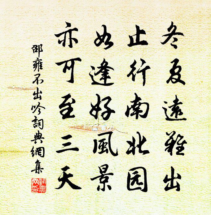 詩詞名句歷史字典書法欣賞書法字典國語詞典說文解字康熙字典古漢語字典標 題 作 者 詩 句 不出吟作者:邵雍 朝代:宋代不出吟原文冬夏遠難出,止行南北園。如逢好風景,亦可至三天。詩詞問答問:不出吟的作者是誰?答:邵雍問:不出吟寫於哪個朝代?答:宋代邵雍不出吟書法欣賞不出吟書法作品詩詞推薦過關山楊時〔宋代〕歲律行將暮,飈風凌九垓。山深人寂寞,路遠馬虺隤。幽意從誰展,愁懷殢酒開。衰遲仍惜日,投晚獨徘徊。公餘出晉康亭小憩曾豐〔宋代〕客來非與景相期,萬象殷勤自四圍。山以出云為顯設,江於朝海得依歸。沙嵐昏墊雨湔祓,煙水汩陳風發揮。公退偶書邵雍〔宋代〕紛紛議論出多門,安得真儒號縉紳。名教一宗長有主,中原萬里豈無人。皇王旁伯時雖異,禮不詩書道自新。觀古自和山房十詠李曾伯〔宋代〕禪房寂寂夜昏昏,相對長明一點燈。舉似新詩共僧話,笑儂綺語污溪藤。贈殷山人李遠〔唐代〕有客抱琴宿,值予多怨懷。啼烏弦易斷,嘯鶴調難諧。曲罷月移幌,韻清風滿齋。誰能將此妙,一為奏金階。華胥引丁默〔宋代〕論交眉語,惜別心啼,費情不少。蕙渺溱期,苹深汜約輕誤了。幾度金鑄相思,又燕歸鴻杳。誰料如今,被鶯閒占浣溪沙·伏雨朝寒愁不勝納蘭性德〔清代〕伏雨朝寒愁不勝,那能還傍杏花行。去年高摘斗輕盈。漫惹爐煙雙袖紫,空將酒暈一衫青。人間何處問多情。七峰亭獨坐喻良能〔宋代〕雨霽失炎燠,新亭境清淑。層波綠奫泫,疊嶂青陸續。風篁韻絲桐,煙柳開畫軸。澹然塵慮銷,庶足永曛旭。和王石澗儒免韻何夢桂〔宋代〕鴞林何處聽遺音,三嘆斯文試共論。梁木夢非千聖往,瓜丘煙斷六經存。悠悠滄海東流遠,耿耿中天北極尊。吾道岳鄂王墓董嗣杲〔宋代〕將軍魂夢繞旌旃,偃月謀成尚忍言。一旦風波誰左袒,八陵荊棘自中原。更無雁帶邊頭信,惟有天知地下冤。鬱郁途次葉縣觀千葉桃花陶弼〔宋代〕三月宮桃滿上林,百花千萼費春心。葉公城外襄河北,一樹無人色更深。孔毅父封君輓詞二首蘇轍〔宋代〕別日笑言重,歸來藥餌憂。鍾歌掩不試,貝葉亂誰收。恨極囊封在,情多壟木稠。埋文應自作,一一記徽猷。寄題甘露寺北軒杜牧〔唐代〕曾向蓬萊宮裡行,北軒闌檻最留情。孤高堪弄桓伊笛,縹緲宜聞子晉笙。天接海門秋水色,煙籠隋苑暮鐘聲。他年春日山莊韋述〔唐代〕初歲開韶月,田家喜載陽。晚晴搖水態,遲景盪山光。浦淨漁舟遠,花飛樵路香。自然成野趣,都使俗情忘。過平望三首楊萬里〔宋代〕小麥田田種,垂楊岸岸栽。風從平望住,雨傍下塘來。亂港交穿市,高橋過得桅。誰言破書篋,檐取太湖回。陪盱眙王使君東遊四首陳造〔宋代〕風林山闕處,茅舍兩三家。小駐加鶻隊,重尋粟玉花。疎煙橫暖靄,碧溜漱晴沙。野興未渠盡,數峰明晚霞。和鄭元及第後秋歸洛下閒居( 同高侍郎下隔年及第)白居易〔唐代〕勤苦成名後,優遊得意間。玉憐同匠琢,桂恨隔年攀。山靜豹難隱,谷幽鶯暫還。微吟詩引步,淺酌酒開顏。門回滿江紅(壽慶元西倅·孫元寶)陳著〔宋代〕越水稽山,清明氣、鍾為人極。D44B纓早、□中學問,從頭施設。不受塵來霜壁立,常生意處春流活。與世間寄省悟師釋智圓〔宋代〕平湖波渺渺,蹤跡杳難尋。城裡無時到,雲邊閉戶深。寒燈明古像,晚磬出疏林。寂寞懷高趣,西軒日易沈。寄主客安員外十韻王禹偁〔宋代〕罷郡歸蘭省,還愁到帝鄉。趨朝騎瘦馬,賃宅住閒坊。命服紆春草,吟髭鑷夜霜。有心憶雲水,無語狎班行。藥債名句推薦溪上桃花無數,花上有黃鸝。黃庭堅《水調歌頭·遊覽》 公乎躍馬揚玉鞭,滅沒高蹄日千里。溫庭筠《拂舞詞 / 公無渡河》 江山留勝跡,我輩復登臨。孟浩然《與諸子登峴山》 暗相思,無處說,惆悵夜來煙月。韋莊《應天長·別來半歲音書絕》 驪山語罷清宵半,淚雨霖鈴終不怨。納蘭性德《木蘭詞·擬古決絕詞柬友》 萬馬不嘶,一聲寒角,令行柳營。劉過《沁園春·張路分秋閱》 漢將歸來虜塞空,旌旗初下玉關東。戎昱《塞下曲》 水光瀲灩晴方好,山色空濛雨亦奇。蘇軾《飲湖上初晴後雨二首·其二》 夫君子之行,靜以修身,儉以養德。諸葛亮《誡子書》 百年成之不足,一旦壞之有餘。佚名《增廣賢文·上集》