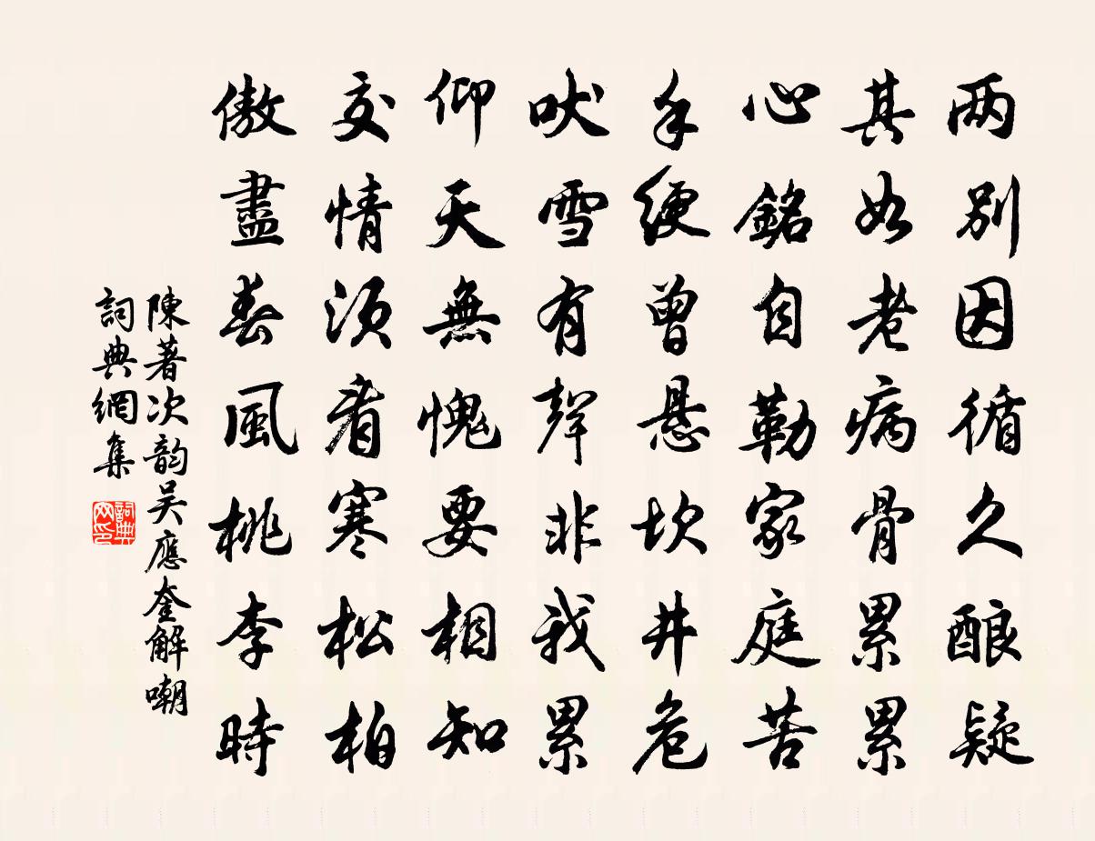 詩詞名句歷史字典書法欣賞書法字典國語詞典說文解字康熙字典古漢語字典標 題 作 者 詩 句 次韻吳應奎解嘲作者:陳著 朝代:宋代次韻吳應奎解嘲原文兩別因循久釀疑,其如老病骨累累。心銘自勒家庭苦,手綆曾懸坎井危。吠雪有聲非我累,仰天無愧要相知。交情須看寒松柏,傲盡春風桃李時。詩詞問答問:次韻吳應奎解嘲的作者是誰?答:陳著問:次韻吳應奎解嘲寫於哪個朝代?答:宋代陳著次韻吳應奎解嘲書法欣賞次韻吳應奎解嘲書法作品詩詞推薦題成國仲畫扇王之道〔宋代〕奮髯欲何為,戢翼應有待。畫工妙丹青,物狀從變態。洪善慶興祖偕訪升上人即景次韻顧禧〔宋代〕地僻僧棲隱,茆庵曲逕通。雲浮秋水白,霞奪蓼花紅。野鳥當窗下,疏煙入畫中。采菱人未散,歸棹且從容。使君以十月上休日燕通判教授縣令錄參沅陵貴趙蕃〔宋代〕假日黃堂燕,窮冬白晝長。風流話前哲,翰墨出珍藏。莒國龍蛇字,西台錦繡章。東萊先理致,朱老繼顛狂。最後好事近洪适〔宋代〕爛漫海棠花,多謝東君留得。眉壽堂邊風景,與蓬瀛咫尺。桃紅李白競爭妍,綠野盡春色。只欠櫻唇清唱,怕行雲冬夜不寐朱淑真〔宋代〕推枕鴛幃不耐寒,起來霜月轉欄乾。悶懷脈脈與誰說,淚滴羅衣不忍看。初離興元陸游〔宋代〕夢裡何曾有去來,高城無奈角聲哀。連林秋葉吹初盡,滿路寒泥蹋欲開。笠澤決歸猶小憩,錦城未到莫輕回。炊菰和路樞四首胡寅〔宋代〕圖書雖是舊生涯,翰墨那能剡國華。戲彩便甘甜五馬,退朝猶想覆千花。先民事業高三代,將聖春秋自一家。他日句李若拙〔宋代〕家寄碧湘濱。秋日黃庚〔宋代〕旅食幾時休,生涯未有謀。西風一夜雨,落葉萬山秋。起石終當隱,草玄殊可羞。江鄉煙水遠,何日買歸舟。代杭民答樂天元稹〔唐代〕翠幕籠斜日,朱衣儼別筵。管弦淒欲罷,城郭望依然。路溢新城市,農開舊廢田。春坊幸無事,何惜借三年。監郡犍為舟中寓題寄同舍薛能〔唐代〕一寢閒身萬事空,任天教作假文翁。旗穿島樹孤舟上,家在山亭每日中。疊果盤餐丹橘地,若花床蓆早梅風。佳期窊樽韓維〔宋代〕閒坐閒行水際,自吟自嘯雲根。過盡春風秋月,無人共醉窊樽。惜分飛(柳絮)劉學箕〔宋代〕池上樓台堤上路。盡日悠揚飛舞。欲下還重舉。又隨胡蝶牆東去。糝徑飄空無定處。來往綠窗朱戶。卻被春風妒。絕句黃載〔宋代〕社寒比臘更清嚴,花蕊蕭疏半欲緘。過手重裘猶得力,莫將晴煗信春衫。題郎世寧畫馬乾隆〔清代〕伯樂今難遇,誰空冀北群?橫風嘶逸韻,意氣欲凌雲。當來日大難行元稹〔唐代〕當來日大難行。前有阪,後有坑。大梁側,小梁傾。兩軸相絞,兩輪相撐。大牛豎,小牛橫。烏啄牛背,足趺力佇登夢野亭張耒〔宋代〕危亭瞰雲夢,眼界浩無邊。秋見長江路,晴寬七澤天。永懷哀郢賦,誰吊獨醒賢。俯仰悲千古,披襟尚颯然。鴻禧觀次高橫槎韻趙孟堅〔宋代〕逍遙微物累,出處任天真。薄宦已陳夢,青山猶故人。鑑湖涼不暑,荷葉淨無塵。往往入圖畫,扣舷欹角巾。水調歌頭(和吳秀岩韻)程公許〔宋代〕駝褐倚禪榻,絲鬢颺茶煙。誰知老子方寸,歷歷著千年。試問汗青餘幾,一笑腰黃縈夢,我自樂天全。出處兩無累題臥屏十八花梅花葛立方〔宋代〕含章英落佳人睡,卻月香殘水部詩。何似江南覓春信,和香先得最南枝。名句推薦騎牛遠遠過前村,短笛橫吹隔隴聞。黃庭堅《牧童詩》 春去花還在,人來鳥不驚。王維《畫》 花開又被風吹落,月皎那堪雲霧遮。施耐庵《水滸傳·第一百一十二回》 有為者辟若掘井,掘井九軔而不及泉,猶為棄井也。孟子《孟子·盡心章句上·第二十九節》 洞門高閣靄餘輝,桃李陰陰柳絮飛。王維《酬郭給事 / 贈郭給事》 易得凋零,更多少無情風雨趙佶《宴山亭·北行見杏花》 治國之道,愛民而已。劉向《說苑·政理》 梅落繁枝千萬片,猶自多情,學雪隨風轉。馮延巳《鵲踏枝·梅落繁枝千萬片》 人不通今古,馬牛如襟裾。佚名《增廣賢文·上集》 北風利如劍,布絮不蔽身。白居易《村居苦寒》