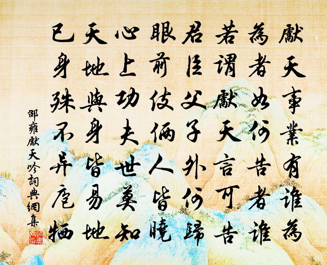 詩詞名句歷史字典書法欣賞書法字典國語詞典說文解字康熙字典古漢語字典標 題 作 者 詩 句 先天吟作者:邵雍 朝代:宋代先天吟原文先天事業有誰為,為者如何告者誰。若謂先天言可告,君臣父子外何歸。眼前伎倆人皆曉,心上功夫世莫知。天地與身皆易地,已身殊不異庖犧。詩詞問答問:先天吟的作者是誰?答:邵雍問:先天吟寫於哪個朝代?答:宋代邵雍先天吟書法欣賞先天吟書法作品詩詞推薦病鶴雍陶〔唐代〕憶得當時病未遭,身為仙馭雪為毛。今來沙上飛無力,羞見檣烏立處高。和酬宋竹坡韻郭鈺〔元代〕寄詩問我山中事,性懶家貧一事無。春瓮酒香梅未落,午窗夢起鳥相呼。舊來叔夜交遊絕,老去文通筆硯枯。鷗社曉入謻門趨殿中馬上作宋庠〔宋代〕鑰出馳宮路,更餘送曉籌。露盤先得日,溫樹未知秋。煙幕昏朱里,風旂颺采斿。鳴鞘歷宣室,應為□神休。送趙德老端明帥蜀樓鑰〔宋代〕身名俱泰老尚書,叱馭寧辭萬里途。兩地恩榮真赫奕,四川父老定歡呼。乖崖袍帶今重見,清獻琴龜我更無。頻向詠史詩。漢中胡曾〔唐代〕荊棘蒼蒼漢水湄,將壇菸草覆餘基。適來投石空江上,猶似龍顏納諫時。和程泰之閣學詠雪十二題弄雪袁說友〔宋代〕天與騷人景物宜,風流嘲戲恰相知。長安道上吟詩罷,笑里騎驢緩勒羇。河上老人歌(一作河上歌)王昌齡〔唐代〕河上老人坐古槎,合丹只用青蓮花。至今八十如四十,口道滄溟是我家。簡劉武子蘇泂〔宋代〕落拓劉郎醉未醒,少年名字以詩行。流傳謾有南朝體,蕭寺如今白髮生。南歌子佚名〔宋代〕月下秦準海,花前晏小山。二仙仙去幾時還。留得月魂花魄、在人間。河漢流旌節,天風裊佩環。滿空香霧濕雲鬟游委羽山李景文〔宋代〕王國風塵暗,仙山景物新。龍宮逾紫禁,鶴寓遠朱輪。冰融溪上日,花發洞門春。一似桃源路,從今學避秦。梅花林逋〔宋代〕幾回山腳又江頭,繞著孤芳看不休。一味清新無我愛,十分孤靜與伊愁。任教月老須微見,卻為春寒得少留。終共所見袁枚〔清代〕牧童騎黃牛,歌聲振林樾。意欲捕鳴蟬,忽然閉口立。止止庵即事詹琰夫〔宋代〕小結茅庵倚薜蘿,主人心事定如何,春風枕上邯鄲夢,夜雨燈前雲水歌。歲月不堪頻把玩,山林偏稱小婆娑。年來貽主客呂郎中(即皇太子贊諭)儲光羲〔唐代〕上士既開天,中朝為得賢。青雲方羽翼,畫省比神仙。委佩雲霄里,含香日月前。君王儻借問,客有上林篇。獨樂園七題種竹齋司馬光〔宋代〕吾愛五子猷,借宅亦種竹。一日不可無,蕭灑常在目。雪霜徒自白,柯葉不改綠。殊勝石季倫,珊瑚滿金谷。昭君曲劉宰〔宋代〕朝日曜兮香春花,玉壺炯兮清冰。耿余心兮不斯,付妍醜兮丹青。君王兮宵衣,壯土悲歌兮戰死。豈余身兮憚殃,己未過太湖僧寺得宗汝為書寄山蕷白酒長韻詩黃庭堅〔宋代〕從學晚聞道,謀官無見功。早衰觀水鑒,內熱愧鄰邦。比鄰有宗侯,治劇乃雍容。摩手撫鰥寡,蒿碪磔強梁。桃李泊丹陽與諸人同舟至馬林溪遇雨皇甫冉〔唐代〕雲林不可望,溪水更悠悠。共載人皆客,離家春是秋。遠山方對枕,細雨莫回舟。來往南徐路,多為芳草留。送馬舍人赴建康軍幕張鎡〔宋代〕柳營謀客自楓宸,去去尖風雁字勻。莫把吟詩替橫槊,新亭北望正愁人。青城縣何子方使君同年園池范成大〔宋代〕榿塍芋壟意中行,浩蕩薰風不計程。雨腳背人歸玉壘,江聲隨馬入青城。五橋今日新知路,千佛當年舊綴名。水竹名句推薦雲銷雨霽,彩徹區明。王勃《滕王閣序》 夜市賣菱藕,春船載綺羅。杜荀鶴《送人游吳》 寧為太平犬,莫作亂離人!馮夢龍《醒世恆言·卷三》 曲岸持觴,垂楊系馬,此地曾經別。辛棄疾《念奴嬌·書東流村壁》 堯不能獨成,烏獲之不能自舉韓非及後人《韓非子·觀行》 善無主於心者不留,行莫辯於身者不立。墨子《墨子·02章 修身》 處富貴之地,要知貧賤的痛癢;當少壯之時,須念衰老的辛酸。洪應明《菜根譚·概論》 慎厥身,修思永。佚名《尚書·虞書·皋陶謨》 寶奩明月不欺人,明日歸來君試看。嚴仁《玉樓春·春思》 白雲一片去悠悠,青楓浦上不勝愁。張若虛《春江花月夜》