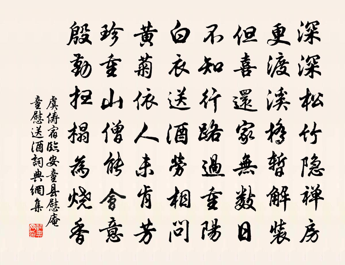 詩詞名句歷史字典書法欣賞書法字典國語詞典說文解字康熙字典古漢語字典標 題 作 者 詩 句 宿臨安童縣慰庵童慰送酒作者:虞儔 朝代:宋代宿臨安童縣慰庵童慰送酒原文深深松竹隱禪房,更渡溪橋暫解裝。但喜還家無數日,不知行路過重陽。白衣送酒勞相問,黃1/1菊依人未肯芳。珍重山僧能會意,殷勤掃榻為燒香。詩詞問答問:宿臨安童縣慰庵童慰送酒的作者是誰?答:虞儔問:宿臨安童縣慰庵童慰送酒寫於哪個朝代?答:宋代虞儔宿臨安童縣慰庵童慰送酒書法欣賞宿臨安童縣慰庵童慰送酒書法作品詩詞推薦題致堂新州坐石方岳〔宋代〕稜層不隔梅花嶺,萬里相從識兩翁。卻怪牧牛亭下路,石麟咫尺臥秋風。送修撰楊學士留守南京夏竦〔宋代〕畫船樵鼓忽東浮,留幕賓從候舳艫。宮裡銅魚勘門鑰,府中銀兔合軍符。鳴騶苑路人千騎,送客河橋酒百壺。莫為儲福觀陸游〔宋代〕路轉屏風疊,雲藏帝子家。窮幽行犖确,息倦倚槎牙。綠蘚封茶樹,清霜折藥花,世無勾漏令,誰此養丹砂?宿青草渡王鎡〔宋代〕夜深猶有去來船,長江倒影涵青天。鶴寒夢覺松梢月,流水殘梅浸香雪。山翁呼兒沽酒歸,獨客有感未睡時。提劍句釋惠崇〔宋代〕空潭聞鹿飲,疏樹見僧行。日夕望江山贈魚司馬詩何遜〔南北朝〕湓城帶湓水。湓水縈如帶。日夕望高城。耿耿青雲外。城中多宴賞。絲竹常繁會。管聲已流悅。玄聲復淒切。歌黛送游景仁夔漕分韻得喜字吳泳〔宋代〕桐花繁欲垂,柳色澹如洗。深谷艤行舟,匆匆春莫矣。廬山蕨已肥。荊渚魚正美。提攜赤藤杖,炊煮白粲火。佳處和同年梁韶州寺丞次張寄詩楊萬里〔宋代〕故人一別恰三年,誰與論詩更說禪。忽報一麾官嶺外,寄來七字雪梅前。人惟南內班行舊,語帶西湖山水鮮。安得五位頌釋慧暉〔宋代〕兼中至,長安大道閒遊戲。處處無私空合空,法法同歸水投水。對雪許渾〔唐代〕雲度龍山暗倚城,先飛淅瀝引輕盈。素娥冉冉拜瑤闕,皓鶴紛紛朝玉京。陰嶺有風梅艷散,寒林無月桂華生。剡溪待制中書舍人陳公之亡以山宅須利既遷殯而未葉適〔宋代〕嗟我與公同澹泊,一生一死又淒涼。經綸傳世止於此,老病著身行自當。掛壁斷弦從別調,拂天進駐水渡新。暮春同揚景韓飲虞獻子江亭和壁間文與可韻程公許〔宋代〕晴興屬玉玩煙霏,照眼琅玕碧四圍。堂蔭白茅娟子美,江吟淨練憶玄暉。誰家鼓吹觀游去,何處笭箵罷釣歸。尚想贈地理錢季實何夢桂〔宋代〕神仙地理無多訣,未用尋龍先看峽。次看峽內有明堂,外峽內堂垣氣結。交結深時垣氣牢,交結淺時垣氣洩。回看龜堂一隅開窗設榻為小憩之地陸游〔宋代〕栟櫚薝蔔障斜陽,旋置臨階八尺床。小展窗扉無大費,略加苫蓋有餘涼。老來愈覺歲時速,夢裹不知途路長。試問鸚鵡曲 燕南八景馮子振〔元代〕蘆溝清絕霜晨住。步落月問倚闌父。薊門東直下金台,仰看樓台飛雨。道陵前夕照蒼茫,疊翠望居庸去。玉泉邊一燕子秦韜玉〔唐代〕不知大廈許棲無,頻已銜泥到座隅。曾與佳人並頭語,幾回拋卻繡工夫。簡艮齋曾豐〔宋代〕得古濂溪派,惟今謝艮齋。冥搜窮骨髓,燕坐黜形骸。晚景登烏府,秋風立玉階。狐狸無暇問,閶闔莫空排。已亥雜詩 23龔自珍〔清代〕荒村有客抱蠹魚,萬一談經引到渠。終勝秋燐無姓氏,沙渦門外五尚書。領客賞梅吳芾〔宋代〕經年相別阻傳杯,忽見梅枝入眼來。今日勸君休惜醉,不應辜負臘前梅。奉和聖制幸韋嗣立山莊劉憲〔唐代〕非吏非隱晉尚書,一丘一壑降乘輿。天藻緣情兩曜合,山卮獻壽萬年餘。名句推薦從此擾擾攘攘,又不知夢醒何時耳。沈復《浮生六記·坎坷記愁》 揚子江頭楊柳春,楊花愁殺渡江人。鄭谷《淮上與友人別》 光陰荏苒,日月如梭。施耐庵《水滸傳·第六十二回》 縱被無情棄,不能羞。韋莊《思帝鄉·春日游》 心之憂危,若蹈虎尾,涉於春冰。佚名《尚書·周書·君牙》 落木千山天遠大,澄江一道月分明。黃庭堅《登快閣》 別有根芽,不是人間富貴花。納蘭性德《採桑子·塞上詠雪花》 心無備慮,不可以應卒。墨子《墨子·05章 七患》 東風兮東風,為我吹行雲使西來。李白《久別離》 秋氣堪悲未必然,輕寒正是可人天。楊萬里《秋涼晚步》