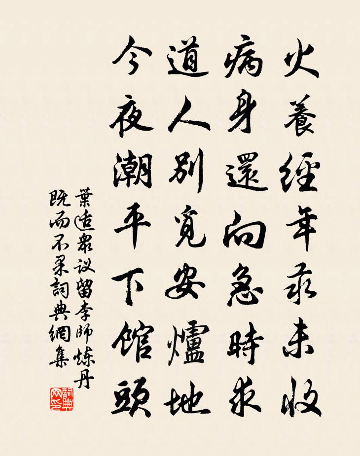 詩詞名句歷史字典書法欣賞書法字典國語詞典說文解字康熙字典古漢語字典標 題 作 者 詩 句 眾議留李師煉丹既而不果作者:葉適 朝代:宋代眾議留李師煉丹既而不果原文火養經年汞未收,病身還向急時求。道人別覓安爐地,今夜潮平下館頭。詩詞問答問:眾議留李師煉丹既而不果的作者是誰?答:葉適問:眾議留李師煉丹既而不果寫於哪個朝代?答:宋代葉適眾議留李師煉丹既而不果書法欣賞眾議留李師煉丹既而不果書法作品詩詞推薦將行示遠父秉文四八弟趙蕃〔宋代〕雞啼午方停,蟬噪暑未秋。寓居雖市近,適意如林投。可人誰能來,王徐真勝流。王居近官道,樹林間田疇。徐居聽微水有感四首張嵲〔宋代〕只應初剖判,便有斯江水。於今知幾時,東流猶瀰瀰。觀汪丞相所藏崔白畫羅漢折彥質〔宋代〕山堂漠漠開曉煙,何許大士當四筵。坐忘默識形骸外,持缽植杖風露前。老龍欲奮屢回首,於菟甚馴非畏鞭。小兒題三老堂壁趙蕃〔宋代〕雨過湖邊秋思多,悵無輕枳傲漁蓑。向來夢境今安在,名與青山保不磨。讀唐人愁詩戲作陸游〔宋代〕天恐文人未盡才,常教零落在蒿萊。不為千載離騷計,屈子何由澤畔來?送徐山人歸睦州舊隱雍陶〔唐代〕君在桐廬何處住,草堂應與戴家鄰。初歸山犬翻驚主,久別江鷗卻避人。終日欲為相逐計,臨岐空羨獨行身。秋風沁園春蘇軾〔宋代〕情若連環,恨如流水,甚時是休。也不須驚怪,沈郎易瘦,也不須驚怪,潘鬢先愁。總是難禁,許多魔難,奈好事寒山拾得贊釋智遇〔宋代〕五峰石,雙澗松邊。是者伎倆,莫罵豐乾。送李道士歸山崔峒〔唐代〕秋城臨古路,城上望君還。曠野入寒草,獨行隨遠山。授人鴻寶內,將犬白雲間。早晚燒丹罷,遙知冰雪寒。四時白紵歌 冬白紵沈約〔南北朝〕寒閨晝密羅幌垂。婉容麗色心相知。雙去雙還誓不移。長袖拂面為君施。翡翠羣飛飛不息。願在雲間長比翼。佩服十絕句呈章茂深安撫陳造〔宋代〕忍饞留得可羹魚,微沫相濡未就枯。自解柳枝投淥水,勞生與汝各江湖。馬城花窠呂午〔宋代〕老子西城住,今逾十載期。栽花成茂樹,種柳長高枝。移接從渠巧,夸傳到處知。擔頭挑賣去,一一是趨時。鶴梅堯臣〔宋代〕何時別遼海,像啄雜庭鵾。去作仙人駕,來乘衛國軒。雲中晴引唳,松上舊能言。但說長千歲,予非學羨門。偈二十七首釋守淨〔宋代〕正炊折腳鐺安隱,無奈公文抵死催。硬把死蛇頭不得,隨時之義大矣哉。夜直玉堂讀王仲行正字文編用入館新詩韻周必大〔宋代〕軼材騰驥騄,涌思決河渠。枝茂根先實,名高士豈虛。君王憐舊土,館殿有新除。努力功名會,燕然欠大書。大雨陸游〔宋代〕今年景氣佳,有禱神必答,時時雖閔雨,顧盼即沾洽。綿地千裡間,四月秧盡插。季夏雨三日,淒爽欲忘箑。瀦水戊子春術者劉五星謂予壽有八十一感而有作二吳芾〔宋代〕多少同年盡溘然,我今獨喜尚安全。儻延朝夕誠為幸,敢謂猶能十五年。宿上望上桂樓曾豐〔宋代〕重屋崢嶸據道周,浪行良勸小淹留。星無匿彩天澄夜,雲不遺瑕月粲秋。金氣方張猶重殺,物華已結未多收。老來贈武夷熊聖功隱士蔡沈〔宋代〕里閈皆華族,雲山獨草廬。非求龍虎鼎,爰傍聖賢居。石聳千尋直,溪涵萬頃虛。文公精爽在,風月夜何如。五郊樂章。肅和佚名〔唐代〕離位克明,火中宵見。峰雲暮起,景風晨扇。木槿初榮,含桃可薦。芬馥百品,鏗鏘三變。名句推薦鄉心新歲切,天畔獨潸然。劉長卿《新年作》 花徑不曾緣客掃,蓬門今始為君開。杜甫《客至》 雨余溪水掠堤平,閒看村童謝晚晴。陸游《觀村童戲溪上》 深澗飲渴虹,邃河生秋雷。惟鳳《姑射山詩題曾山人壁》 如切如磋,如琢如磨。佚名《淇奧》 雍雍新雁咽寒聲,愁恨年年長相似。李煜《謝新恩·冉冉秋光留不住》 戍鼓斷人行,邊秋一雁聲。杜甫《月夜憶舍弟》 殷勤昨夜三更雨,又得浮生一日涼。蘇軾《鷓鴣天·林斷山明竹隱牆》 花謝花飛花滿天,紅消香斷有誰憐。曹雪芹《紅樓夢·第二十七回》 時人不識農家苦,將謂田中谷自生。顏仁郁《農家》