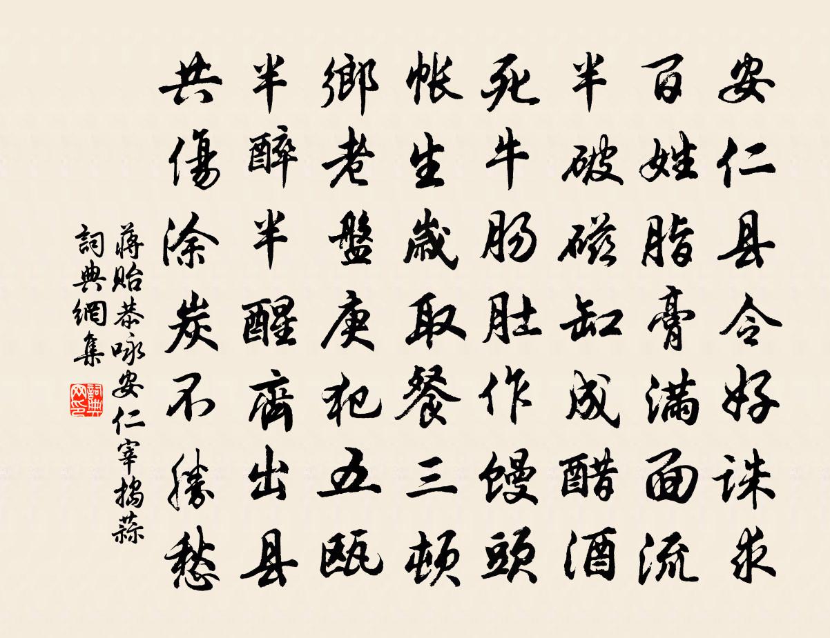 詩詞名句歷史字典書法欣賞書法字典國語詞典說文解字康熙字典古漢語字典標 題 作 者 詩 句 詠安仁宰搗蒜作者:蔣貽恭 朝代:唐代詠安仁宰搗蒜原文安仁縣令好誅求,百姓脂膏滿面流。半破磁缸成醋酒,死牛腸肚作饅頭。帳生歲取餐三頓,鄉老盤庚犯五甌。半醉半醒齊出縣,共傷塗炭不勝愁。詩詞問答問:詠安仁宰搗蒜的作者是誰?答:蔣貽恭問:詠安仁宰搗蒜寫於哪個朝代?答:唐代問:詠安仁宰搗蒜是什麼體裁?答:七律蔣貽恭詠安仁宰搗蒜書法欣賞詠安仁宰搗蒜書法作品注釋全唐詩:卷870-58詩詞推薦醉中得上都親友書以予停俸多時憂…乘酒興詠而報之白居易〔唐代〕頭白醉昏昏,狂歌秋復春。一生耽酒客,五度棄官人。異世陶元亮,前生劉伯倫。臥將琴作枕,行以鍤隨身。歲要感秋三絕張耒〔宋代〕楚天未白轉星河,樓角先吹出寒歌。長愧侵床五更月,殷勤無計謝姮娥。雙峰下哭故人李宥劉長卿〔唐代〕憐君孤壟寄雙峰,埋骨窮泉復幾重。白露空沾九原草,青山猶閉數株松。圖書經亂知何在,妻子因貧失所從。惆悵送從兄祕校鹹赴衢州都掾宋庠〔宋代〕倦客睢園完,迎家越絕長。聊甘督罰掾,羞比入貲郎。汗竹書滕密,炊菰宴具香。蘭台英藻盛,方信乃宗強。塞上曹松〔唐代〕邊寒來所闊,今日復明朝。河凌堅通馬,胡云缺見雕。砂中程獨泣,鄉外隱誰招。回首若經歲,靈州生柳條。廬山霽色韓元吉〔宋代〕山北山南佛寺開,煙銷日出更崔嵬。讀書誰伴謫仙老,沽酒要須陶令來。二月一日郡圃尋春二首楊萬里〔宋代〕中和節里半春天,一拂清寒半點暄。憔悴不勝梅欲落,嬌饒無對杏初繁。朝中措葛郯〔宋代〕雙鞬錦領出西山。戎幕護旌旗。橫槊春風百詠,臨淮夜月千卮。風流樽俎,瓊花破艷,紅藥攢枝。賞盡竹西歌吹,與蘇州守十詩以兵衛森畫戟燕寢凝清香為韻周麟之〔宋代〕青衫飄泊江海生,十年篷底載我行。每逢勝地一長望,江山舉目難為情。登樓幾作仲宣賦,在野猶帶倪寬經。邇來醉蓬萊春壽府佚名〔宋代〕正春風初扇,梅蕊飄香,雨余晴書。簫鼓聲中,麝煙噴金獸。幕府賓僚,杜詩韓筆,競吐奇爭秀。共指喬松,同瞻下第後上永崇高侍郎高蟾〔唐代〕天上碧桃和露種,日邊紅杏倚雲栽。芙蓉生在秋江上,不向東南怨未開。和李文伯暑時五首之麈尾黃庭堅〔宋代〕麈髦副白玉,揮弄柔毿毿。不獨效擊拂,與君為指南。諸生臨廣坐,辯口劇春蠶。此物為解紛,吾常見不談。桓豁徐鈞〔宋代〕以石名兒合讖言,奇機端可破苻堅。信乎有志終成事,逐將誅丕豈偶然。高宗郊祀前廟朝享太廟三十首真宗〔宋代〕仁行如天,篇覆無偏。功濟九有,恩濟八埏。齊民受康,朝野晏然。聲壤歌謠,四十二年。臨川山行周瑀〔唐代〕朝見青山雪,暮見青山雲。雲山無斷絕,秋思日紛紛。偈頌一百三十六首釋惟一〔宋代〕瞿曇未解這一著,雪嶺六年空卜度。不知眼病見空花,認作明星一何錯。自累猶可,更累兒孫。珊瑚枕上兩行淚,臥病累日羸甚偶復小健戲作陸游〔宋代〕行年當大耋,臥病涉高秋。丸藥作奇驗,俶裝仍小留。輕漚元泛泛,破屋已颼颼。尚有江湖興,沙頭問釣舟。老將武衍〔宋代〕幾回夢裡到邊陲,馬上猶能磨戰旗。彈淚對人偏愛說,建炎隨駕渡江時。和岩壑兄九日蘇泂〔宋代〕華顛可笑插茱萸,兒女歡然競挽須。故國黃花元自好,荒台青草孰為娛。舉觴感慨悲歌有,落帽風流蘊藉無。粘起衡山黃庭堅〔宋代〕萬丈融峰插紫霄,路當窮處架仙橋。上觀碧落星辰近,下視紅塵世界遙。螺簇山低青點點,線拖遠水白迢迢。當門名句推薦荷盡已無擎雨蓋,菊殘猶有傲霜枝。蘇軾《贈劉景文 / 冬景》 落日暴風雨,歸路繞汀灣蘇舜欽《水調歌頭·滄浪亭》 地冷葉先盡,谷寒雲不行。李白《冬日歸舊山》 鶯嘴啄花紅溜,燕尾點波綠皺。秦觀《如夢令·春景》 秋空明月懸,光彩露沾濕。孟浩然《秋宵月下有懷》 行出於己,名生於人。佚名《逸周書·卷六·諡法解》 忙日苦多閒日少,新愁常續舊愁生。陸游《浣溪沙·和無咎韻》 人品之不高,總為一利字看不破;學業之不進,總為一懶字丟不開。王永彬《圍爐夜話·第十六則》 不辭山路遠,踏雪也相過。張九齡《答陸澧》 積土成山,風雨興焉;積水成淵,蛟龍生焉;荀子《勸學》
