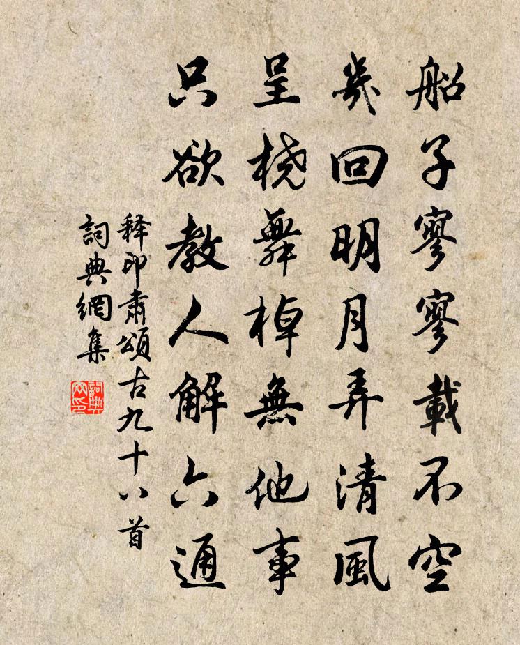 詩詞名句歷史字典書法欣賞書法字典國語詞典說文解字康熙字典古漢語字典標 題 作 者 詩 句 頌古九十八首作者:釋印肅 朝代:宋代頌古九十八首原文船子寥寥載不空,幾回明月弄清風。呈橈舞棹無他事,只欲教人解六通。詩詞問答問:頌古九十八首的作者是誰?答:釋印肅問:頌古九十八首寫於哪個朝代?答:宋代釋印肅頌古九十八首書法欣賞頌古九十八首書法作品詩詞推薦偈傾一百三十三首釋法薰〔宋代〕棒喝交馳如雷掣,顛言倒語三寸舌。南州打到北州頭,瓮裹何曾失卻鱉。近聞直學馮子容以家產中丘乘之賦作詩戲之王洋〔宋代〕千古茫茫不可攀,仲尼日月照儒關。生前冷灶七日火,身後遺基十萬間。寧許富兒通市籍,只求賢士共歡顏。那知石人峰焦翠峰〔宋代〕石為肌骨應成假,鐵作肝腸未必真。當日容成丹就處,何當點化作仙人。落花長吟邵雍〔宋代〕以酒戰花穠,花穠酒更濃。花能十日盡,酒未百壺空。尚喜裝衣袂,猶憐墜酒鍾。多情唯粉蝶,薄倖是游蜂。減卻水龍吟(奉川實化鳳花)陳允平〔宋代〕杜鵑啼老春愁,淚痕吹作胭脂雨。飛花亂點,東風枝上,紅翔翠翥。丹穴鳴初,碧梧棲未,淒涼山塢。悵瓊姬夢遠和答詩十首。和松樹白居易〔唐代〕亭亭山上松,一一生朝陽。森聳上參天,柯條百尺長。漠漠塵中槐,兩兩夾康莊。婆娑低覆地,枝幹亦尋常。八月念奴嬌沈瀛〔宋代〕春來臘去,一番新風景,為君開設。試憶前時花雨墜,只少梅花清絕。兩個難逢,一分才欠,巧殺終如拙。玉梅人賢者之孝二百四十首袁君正林同〔宋代〕家人勸我睡,共說不眠難。官既未得差,眠時自不安。新秋吳融〔唐代〕白髮又經秋,端居海上洲。無機因事發,有涕為時流。新酒乘涼壓,殘棋隔夜收。公車無路入,同拜老閒侯。禮部尚書洪公輓歌詞葛立方〔宋代〕高材博識服簪紳,玉樹瑤林絕點塵。氏族源流推肉譜,春秋褒貶藉調人。膝間韻磬傳山水,枰上枯棋戰楚秦。妙處好事近趙長卿〔宋代〕劍水靄歡聲,喜慶間生人傑。一段蔥蔥佳氣,扇薰風時節。今朝銀艾佐琴堂,爭把壽香爇。去去鳳皇池上,見龜巢和陳輔秀才金陵書事王安石〔宋代〕南郭先生比鷾鴯,年年過我未愆期。休論玉謝當時事,大抵烏衣只舊時。多病范祖禹〔宋代〕多病心牢落,驚秋鬢颯然。風乾桐葉地,雨冷菊花天。舊隱荒江漢,新居俯澗瀍。西都長夢想,何日賦歸田。江上孫介〔宋代〕灘頭鳴榔去,偃仰醉霜月。意倦早歸來,風波渺愁絕。賢者之孝二百四十首二王林同〔宋代〕要以孝行取,寧將學業論。錫無慚玉友,銓可謂金昆。跋趙唐卿所藏訪戴圖張元乾〔宋代〕王孫胸次足丘壑,幻出山陰訪載圖。草屋柴扉閉風雨,客來空去得知無。送文子徐妹丈赴隨州太學掾用司馬文正公送先陳亮〔宋代〕昔仰南洲德,今逢世嗣賢。聲名江左重,文教漢東專。君意思空馬,吾生肯絕弦。江頭無語處,一葉浪花前。倚薄黃公度〔宋代〕茅檐供倚薄,藜杖費扶攜。天入平蕪闊,山含宿靄低。樹聲風便旋,野色晚淒迷。容易營生事,秋田稻欲齊。題丁少詹姑墓誌後陳傅良〔宋代〕白髮從夫志,青芻為客謀。送車今幾兩,樂土有斯丘。猶子聲名甚,他時雨露秋。摩挲看石刻,嗟惜到松楸。有感三首方回〔宋代〕倉皇得郡免朝辭,十六年間老轉痴。一角未堪峨獬豸,二螯敢笑食蟛蜞。刊摩乾寶搜神記,嘯詠陶潛責子詩。格是名句推薦別來春半,觸目柔腸斷。李煜《清平樂·別來春半》 人道惡盈而好謙。佚名《易傳·彖傳上·謙》 居移氣,養移體。孟子《孟子·盡心章句上·第三十六節》 長安回望繡成堆,山頂千門次第開。杜牧《過華清宮絕句三首》 人生有酒須當醉,一滴何曾到九泉。高翥《清明日對酒》 河西幕中多故人,故人別來三五春。岑參《涼州館中與諸判官夜集》 天下雖安,忘戰必危。姜子牙《司馬法·仁本》 又是春將暮,無語對斜陽。葛長庚《水調歌頭·江上春山遠》 雨足高田白,披蓑半夜耕。崔道融《田上》 微吟不道驚溪鳥,飛入亂雲深處啼。沈周《題畫》
