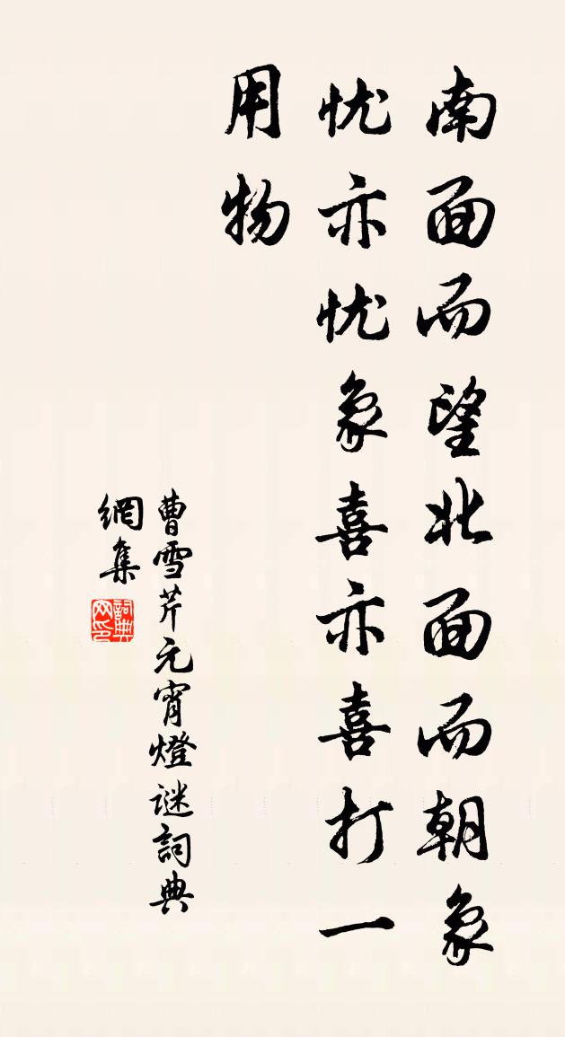 "象憂"二句出自《孟子.萬章》。大意是舜的弟弟名象,象總想害死舜,而舜對象非常友愛,象憂愁他也憂愁,象喜歡,他也喜歡。從詩謎看,此句形容鏡中影和鏡外人的關係。實寓寶玉生活中好象是有憂愁之事(黛玉之死),也好象有喜事(與寶釵成婚),但與寶釵南望北朝,二人方向永遠不能一致:對面薛而不懷林,即"空對著,山中高士晶瑩雪,終不忘,世外仙姝寂寞林"(仙曲"終身誤")