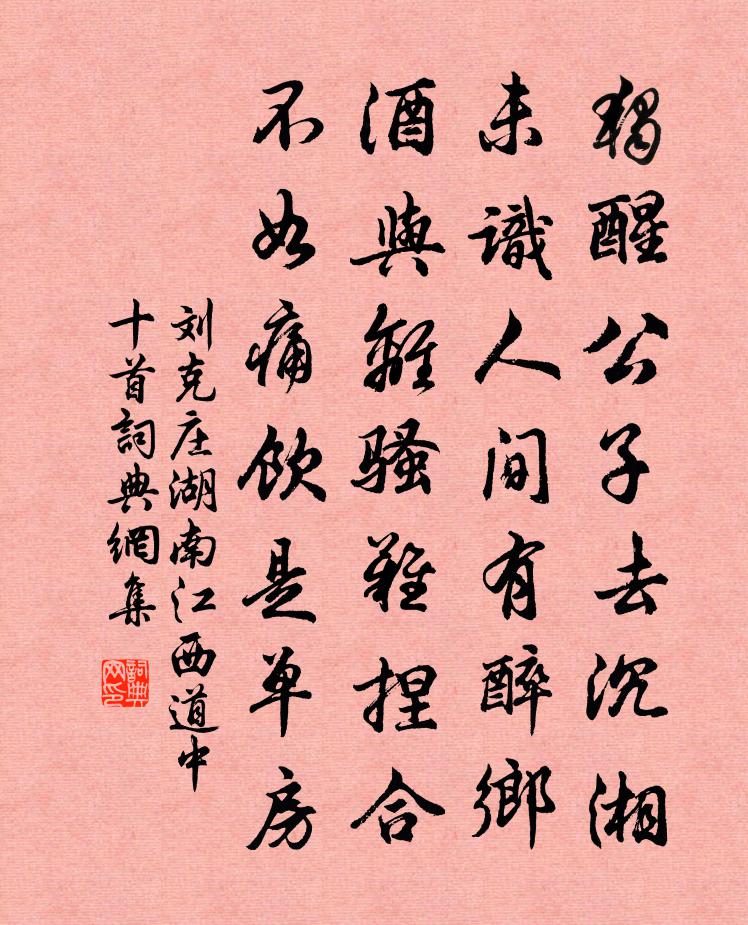 詩詞名句歷史字典書法欣賞書法字典國語詞典說文解字康熙字典古漢語字典標 題 作 者 詩 句 湖南江西道中十首作者:劉克莊 朝代:宋代湖南江西道中十首原文獨醒公子去沉湘,未識人間有醉鄉。酒與離騷難捏合,不如痛飲是單房。詩詞問答問:湖南江西道中十首的作者是誰?答:劉克莊問:湖南江西道中十首寫於哪個朝代?答:宋代問:劉克莊的名句有哪些?答:劉克莊名句大全劉克莊湖南江西道中十首書法欣賞湖南江西道中十首書法作品詩詞推薦紅薔薇(一作莊南傑詩)佚名〔宋代〕九天碎霞明澤國,造化工夫潛剪刻。淺碧眉長約細枝,深紅刺短鉤春色。晴日當樓曉香歇,錦帶盤空欲成結。謝豹謁金門馮延巳〔唐代〕聖明世,獨折一枝丹桂。學著荷衣還可喜,春狂不啻□。年少都來有幾,自古閒愁無際。滿盞勸君休惜醉,願君千淳佑甲辰三月中浣奉詔經略同客張景東馮雲從謝逵〔宋代〕尋幽天氣得晴酣,小小籃輿勝繡鞍。洞以乳名雲液涌,泉紆石出水晶寒。山容染翠開油幕,竹韻鳴竽立玉竿。孰謂送常清上人還舒州皎然〔唐代〕灊人思爾法,楚信有回船。估客親宵語,閒鷗偶晝禪。經聲含石瀲,麈尾拂江煙。常說歸山意,誅茅廬霍前。憶李之純三首王從之〔宋代〕雋氣傾天下,高情到古今。銜杯曼卿放,下筆老坡神。時論誰優劣,人材自屈伸。窮愁須理遣,不必淚沾巾。次韻上乘寺主僧如岳詠菊陳著〔宋代〕萬紫千紅各炫名,紛紛兒女哄春榮。屈園秋種無人顧,獨遇陶潛氣始平。和史少莊登山韻三首魏了翁〔宋代〕毋謂支山險,此山能幾何。崎嵌十年夢,知歷幾蹉跎。定風波蘇軾〔宋代〕子瞻書困點新茶。白髮白居易〔唐代〕白髮知時節,暗與我有期。今朝日陽里,梳落數莖絲。家人不慣見,憫默為我悲。我云何足怪,此意爾不知。凡人福勝寺香風堂釋慧遠〔宋代〕襲襲聞天都,飄飄滿衣{左衤右區}。高出威音前,平超樓至後。不墮四時春,肯與百花斗。鼻觀豈能收,河神安阮郎歸仇遠〔宋代〕桃花坊陌散香紅。捎鞭驟玉驄。官河柳帶結春風。高樓小燕空。山暗靄,草蒙茸。江南春正濃。王孫家在畫橋東。寒山寺壞莊產盡為勢家所奪余游天台甚為賢惜薛師石〔宋代〕寒山寺廢佛燈寒,有客來游欲住難。夙世閭丘今攝郡,不妨饒舌似豐乾。挽方粹景楫二首劉克莊〔宋代〕上世曾通好,君尊昔託孤。初聞攜一束,俄見賦三都。皆謂終童雋,安知董相迂。禿翁老無力,愛助尚區區。詠史上何進陳普〔宋代〕龍驤虎步反狐疑,解事陳琳卻似痴。滅火不關千里草,漢家社稷付屠兒。過長峰逕遇雨,遣悶十絕句楊萬里〔宋代〕猿藤陂子枉驚吁,未抵長峰小半塗。今夕前頭何許宿?不知出得逕來無。哀徐致中薛師石〔宋代〕亡友如今隔杳冥,畫身只見病時形。書窗閉久梅添潤,花徑荒來草又青。一卷詩編空就緒,兩年文會覺凋零。幾回和李秀才端午日風寄徐鉉〔唐代〕角黍菖蒲酒,年年舊俗諳。采衣君自樂,白髮我何堪。靜味瑤華句,閒思玉柄譚。報之長命縷,祝慶在圖南。賦江湖偉觀王志道〔宋代〕東南王氣萃錢塘,襟帶江湖國勢強。萬頃煙波流德澤,四時弦管樂豐穰。帆歸別浦魚鹽聚,雨過平堤草木香。欲賦迎春曲三闋宋祁〔宋代〕青陸斗杓回,河內動新灰。冰際綃紋綻,雲邊鶴影來。漢宮行慶罷,花樹剪刀催。高陽台(陳君衡游未還,周公謹有懷人之賦,倚歌和之)王沂孫〔宋代〕駝褐輕裝,狨韉小隊,冰河夜渡流澌。朔雪平沙,飛花亂拂蛾眉。琵琶已是淒涼調,更賦情、不比當時。想如今,名句推薦會天大雨,道不通,度已失期司馬遷《陳涉世家》 憶年十五心尚孩,健如黃犢走復來。杜甫《百憂集行》 山遠天高煙水寒,相思楓葉丹。李煜《長相思·一重山》 今朝此為別,何處還相遇。韋應物《初發揚子寄元大校書》 北極朝廷終不改,西山寇盜莫相侵。杜甫《登樓》 天憐客子鄉關遠。借與花消遣。蔣捷《虞美人·梳樓》 北極懷明主,南溟作逐臣。宋之問《途中寒食題黃梅臨江驛寄崔融》 蟬噪林逾靜,鳥鳴山更幽。王籍《入若耶溪》 涉江采芙蓉,蘭澤多芳草。佚名《涉江采芙蓉》 聖人不期修古,不法常可,論世之事,因為之備。韓非及後人《韓非子·五蠹》