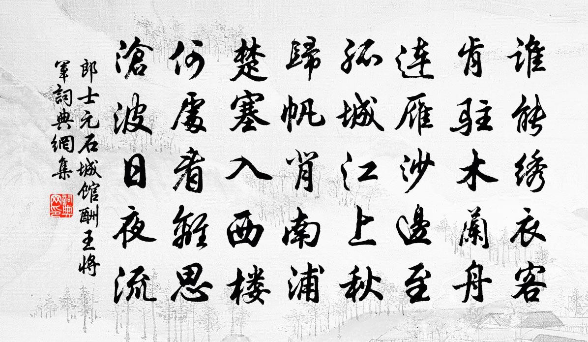 詩詞名句歷史字典書法欣賞書法字典國語詞典說文解字康熙字典古漢語字典標 題 作 者 詩 句 石城館酬王將軍作者:郎士元 朝代:唐代石城館酬王將軍原文誰能繡衣客,肯駐木蘭舟。連雁沙邊至,孤城江上秋。歸帆背南浦,楚塞入西樓。何處看離思,滄波日夜流。詩詞問答問:石城館酬王將軍的作者是誰?答:郎士元問:石城館酬王將軍寫於哪個朝代?答:唐代問:石城館酬王將軍是什麼體裁?答:五律郎士元石城館酬王將軍書法欣賞石城館酬王將軍書法作品注釋全唐詩:卷248_25詩詞推薦慶張君俞都尉留後得子秦觀〔宋代〕天上 * 玉作樓,蟠桃熟後更無憂。內家報喜車凌曉,太史占祥斗掛秋。龍得一珠應獻佛,虎生三日便吞牛。魯元送李季才戶部出守衡陽程公許〔宋代〕君來我去國,我還君得州。世事巧違人,參辰不同謀。庚午蜀貢琛,君亞龍頭。迴翔三十的,班序晚見收。邊聲震程閣學知建寧府入對二首趙蕃〔宋代〕日邊飛下詔黃新,大府潛藩屬老成。一代儒宗還北闕,十年法從對延英。從容定有回天力,咫尺重聞曳履聲。便覺漁家傲(再用前韻)吳潛〔宋代〕遍閱芳園閒半晝。殘花尚有榴裙皺。倦鳥投林雲返岫。人影瘦。可憐身世為他囿。燕子飛來還憶舊。回頭又是梅黃沁園春(二月二日壽玉林)馮取洽〔宋代〕稟氣之中,具聖之和,生逢令辰。算三春仲月,方才破二,百年大齊,恰則平分。立玉林深,散花庵小,中有然自煙波即事陸游〔宋代〕短髮垂肩不裹巾,世人誰識此翁真?阻風江浦詩成束,賣藥山城醉過春。寄題俞伯南所居希賢陳文蔚〔宋代〕毋為陵學山,當為川學海。尹重貴自任,顏樂誓不改。學無學頌一十五首釋印肅〔宋代〕昨夜三更日卓中,滿天星斗雨濛濛。三門佛殿相攜手,要去西天路不通。清平樂 壽內韓奕〔元代〕爐煙拂拂。生願長同室。還度新腔調舊瑟。四十三年今日。當初黃卷相逢。後來紅線相從。此去白頭相守,榴花無句嚴中和〔宋代〕畫扇題詩鸞背濕,銅彝煎腦鴨心香。元日過丹陽明日立春寄魯元翰蘇軾〔宋代〕堆盤紅縷細茵陳,巧與椒花兩斗新。竹馬異時寧信老,土牛明日莫辭春。西湖弄水猶應早,北寺觀燈欲及辰。白髮至陳倉曉晴望京邑盧照鄰〔唐代〕佛曙驅飛傳,初晴帶曉涼。霧斂長安樹,雲歸仙帝鄉。澗流漂素沫,岩景靄朱光。今朝好風色,延瞰極天莊。春菊史鑄〔宋代〕莫論園蔬口目卑,花開不減菊幽奇。燦然金色仍堪采,春老恰如秋老時。次韻嚴子文旅中見贈范成大〔宋代〕杯中疇昔共江天,傾座新詩報警聯。海浦寸心空共月,京華雙鬢各凋年。交情敢說同方友,句法甘從弟子員。有意乙亥冬彭秋宇〔宋代〕禍亂方來苦不禁,此生誰料有如今。四郊雲擾旌旗影,諸閫風寒社稷心。杞國有人憂凜凜,桃源無路入深深。少陵追和沈遼贈南華詩蘇軾〔宋代〕善哉彼上人,了知明鏡台。歡然不我厭,肯致遠公材。莞爾無心雲,胡為出岫來。一堂安寂滅,卒歲扃蒼苔。和克家侄謝周鳳隱雪中留宿韻柴元彪〔宋代〕遙指龜峰擬問津,芒鞋踏碎玉嶙峋。去程暮雪留行客,回首春風有故人。三酌茅柴斟白墮,一爐榾柮當烏薪。饒他送王宗望郎中赴河東漕蘇轍〔宋代〕春初戎馬掠河壖,屬國倉皇不解鞍。未免驅民饋邊食,旋聞奉使輟郎官。年高轉覺精神勝,慮穩要令事業安。持節南湖書院趙汝譡〔宋代〕捍川始成邑,巡甸遂建都。千載倚修堤,三吳達高塗。衛軍弛馬牧,令尹司官湖。濬中深有蓄,豐外堅無虞。往昔偈頌二十五首釋如淨〔宋代〕天童仲冬第一句,槎槎牙牙老梅樹。忽開花,一花兩花三四五花無數花。清不可夸,香不可夸。散作春容吹草木,名句推薦獨自下層樓,樓下蛩聲怨。程垓《卜運算元·獨自上層樓》 寢興目存形,遺音猶在耳。潘安《悼亡詩三首》 章台柳,章台柳,昔日青青今在否?韓翃《章台柳·寄柳氏》 靜女其姝,俟我於城隅。佚名《靜女》 兒童急走追黃蝶,飛入菜花無處尋。楊萬里《宿新市徐公店》 高岸為谷,深谷為陵。佚名《十月之交》 鵲辭穿線月,花入曝衣樓。李賀《七夕》 天下未有不學而成者也。王通《中說·卷六·禮樂篇》 草木也知愁,韶華竟白頭。曹雪芹《唐多令·柳絮》 一事真,百事真。馮夢龍《醒世恆言·卷十六》