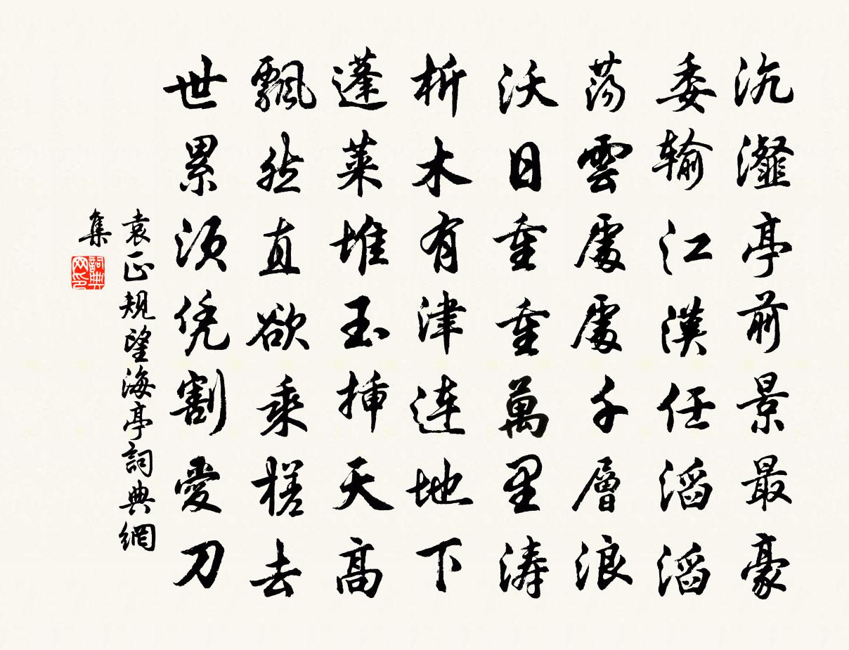 詩詞名句歷史字典書法欣賞書法字典國語詞典說文解字康熙字典古漢語字典標 題 作 者 詩 句 望海亭作者:袁正規 朝代:宋代望海亭原文沆瀣亭前景最豪,委輸江漢任滔滔。盪雲處處千層浪,沃日重重萬里濤。析木有津連地下,蓬萊堆玉插天高。飄然直欲乘槎去,世累須憑割愛刀。詩詞問答問:望海亭的作者是誰?答:袁正規問:望海亭寫於哪個朝代?答:宋代袁正規望海亭書法欣賞望海亭書法作品詩詞推薦卻望無錫芙蓉湖李紳〔唐代〕水寬山遠煙嵐迥,柳岸縈迴在碧流。清晝不風鳧雁少,卻疑初夢鏡湖秋。丹橘村邊獨火微,碧流明處雁初飛。蕭條壽周樞密四首曾豐〔宋代〕一氣清絕處,坤元直西方。公生受西氣,戲筆俱文章。北門逼西清,金仙侍玉皇。凡遺不配蹤,便是難老方。言志韓湘〔唐代〕青山雲水窟,此地是吾家。後夜流瓊液,凌晨咀絳霞。琴彈碧玉調,爐煉白硃砂。寶鼎存金虎,元田養白鴉。一瓢送程寺丞知和州項安世〔宋代〕名為淮郡實江城,採石江心郡吏迎。一葦橫通秋浦近,雙旌何異晝衣行。承平豫事疑生事,緩急圖成豈解成。我有牢城言懷華岳〔宋代〕重城不隔世間塵,個裹無花別有春。冤鬼夜隨風雨泣,病囚時作犬羊呻。雷霆不霹欺君賊,彗孛偏凌為國人。欲問郡牧李侍郎生日朱長文〔唐代〕當年弧矢設門闌,英氣鍾於曲阜間。名覆金甌新品地,香盤密印舊家山。腰邊龜組光華動,膝下龍駒禮法閒。五福冬日宴群公於宅各賦一字得杯于志寧〔唐代〕陋巷朱軒擁,衡門緹騎來。俱裁七步詠,同傾三雅杯。色動迎春柳,花發犯寒梅。賓筵未半醉,驪歌不用催。生寶信常前杏花盛開置酒招同官以詩先之卷剛中〔宋代〕晴光先已媚簾櫳,炫書那堪杏吐紅。柳色半分高致外,鳥聲全在艷香中。催科共喜錢初減,種藝須聞麥已豐。官府集仙納涼鄭霖〔宋代〕縣灘如沸鼎,玄館足清幽。竹逕不留暑,蓮池先借秋。學仙師有訣,戀祿我懷羞。安得雙島舄,乘風八極游。贛州再贈文天祥〔宋代〕此別重逢又幾時,贈君此是第三詩。眾人皆醉從教酒,獨我無爭且看棋。凡事誰能隨物競,此心只要有天知。自知贈盧隱居白玉蟾〔宋代〕日高丈五尚酣眠,心下無愁不管天。野蔌山餚酬白醑,乾柴淨米煮清泉。不須求仕如藏用,且自烹茶學玉川。時策舟中曉望孟浩然〔唐代〕掛席東南望,青山水國遙。舳艫爭利涉,來往接風潮。問我今何去,天台訪石橋。坐看霞色曉,疑是赤城標。碧角簟曹松〔唐代〕細皮重疊織霜紋,滑膩鋪床勝錦茵。八尺碧天無點翳,一方青玉絕纖塵。蠅行只恐煙粘足,客臥渾疑水浸身。五月琴調相思引賀鑄〔宋代〕團扇單衣楊柳陌。花似春風□無跡。賴白玉香奩供汾澤。借秀色。添春色。借秀色。添春色。雲幕華燈張綺席。半題吳氏四賢堂羅鑒〔宋代〕敬齋一則話,傳自南軒翁。於湖金玉之,諸老歸下風。不使掌帝制,嗟哉吾道窮。遺像今偉然,吾敬司封公。句韋奇〔宋代〕野黑雞聲顫,林深燐火明。寄處士梁燭張喬〔唐代〕賢哉君子風,諷與古人同。採藥楚雲里,移家湘水東。星霜秋野闊,雨雹夜山空。早晚相招隱,深耕老此中。聞丹丘子於城北營石門幽居中有高鳳遺蹟仆離群…以寄之李白〔唐代〕春華滄江月,秋色碧海雲。離居盈寒暑,對此長思君。思君楚水南,望君淮山北。夢魂雖飛來,會面不可得。疇昔對雪和子厚弟四首王之道〔宋代〕凍雲不成雨,巧作白玉霙。寒光僭曉色,報我東窗明。起來撥殘火,暖酒手自傾。多謝麴居士,於人殊有情。次韻不浮和東坡端午游真如寺高斯得〔宋代〕君居秣陵時,日夜書旁午。念我方投閒,遠方同甘苦。別來日月長,如發不可數。弟兄兩浮萍,功名一炊黍。相逢名句推薦謂女子,先生為姊,後生為妹。佚名《爾雅·釋親》 壯歲從戎,曾是氣吞殘虜。陸游《謝池春·壯歲從戎》 佳節久從愁里過,壯心偶傍醉中來。蘇洵《九日和韓魏公》 即從巴峽穿巫峽,便下襄陽向洛陽。杜甫《聞官軍收河南河北》 想當年,金戈鐵馬,氣吞萬里如虎。辛棄疾《永遇樂·京口北固亭懷古》 煢煢白兔,東走西顧。佚名《古艷歌》 更深黃月落,夜久靨星稀。任希古《和長孫秘監七夕》 東風靜、細柳垂金縷。万俟詠《三台·清明應制》 潯陽江頭夜送客,楓葉荻花秋瑟瑟。白居易《琵琶行 / 琵琶引》 人之性惡,其善者偽也。荀子《荀子·性惡》