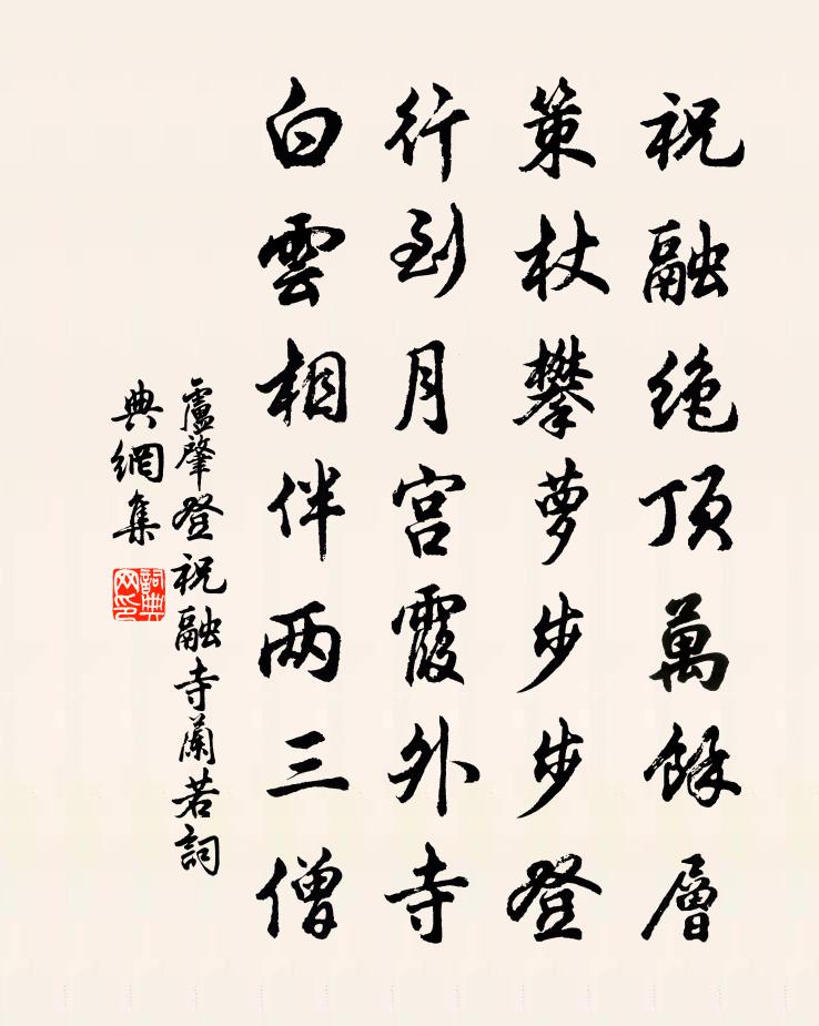 詩詞名句歷史字典書法欣賞書法字典國語詞典說文解字康熙字典古漢語字典標 題 作 者 詩 句 登祝融寺蘭若作者:盧肇 朝代:唐代登祝融寺蘭若原文祝融絕頂萬餘層,策杖攀蘿步步登。行到月宮霞外寺,白雲相伴兩三僧。詩詞問答問:登祝融寺蘭若的作者是誰?答:盧肇問:登祝融寺蘭若寫於哪個朝代?答:唐代問:登祝融寺蘭若是什麼體裁?答:七絕盧肇登祝融寺蘭若書法欣賞登祝融寺蘭若書法作品注釋全唐詩:卷551-17詩詞推薦朝中措(次韻同官約瞻叔兄及楊仲博約賞郡圃牡丹並遣酒代勸)魏了翁〔宋代〕玳筵綺席繡芙蓉。客意樂融融。吟罷風頭擺翠,醉餘日腳沈紅。簡書絆我,賞心無托,笑口難逢。夢草閒眠暮雨,山中紅葉張嵲〔宋代〕青女炫微巧,染絳妬春工。如何青林表,忽有萬炬紅。渾疑在絕塞,斥堠傳夕烽。爛爛爍晚日,燁燁含天風。錦繡容照岩楊時〔宋代〕清時投跡在嵌崟,一穴晴光破晚陰。刺草未容忘魏闕,故應長有子牟心。久坐宋伯仁〔宋代〕坐久如忘世,松窗日未斜。營巢鴉噪樹,作夢蝶眠花。易課推三畫,醫方錄數家。瓶笙聲未絕,更點土山茶。舊鏡鮑溶〔唐代〕嬋娟本家鏡,與妾歸君子。每憶並照時,相逢明月里。春風忽分影,白日難依倚。珠粉不結花,玉璫寧輝耳。心期八六子佚名〔宋代〕憶南洲。紺波縈繞,垂楊柳拂朱樓。念十載風流夢覺,滿身花影人扶,舊曾暗游。無言空愴離憂。醉袖裛將紅淚,晦日處士叔園林燕集韋應物〔唐代〕遽看蓂葉盡,坐闕芳年賞。賴此林下期,清風滌煩想。始萌動新煦,佳禽發幽響。嵐嶺對高齋,春流灌蔬壤。樽酒挽葉無咎孫應時〔宋代〕詩酒平生事,風流六十翁。詞人尋鄭老,坐客愛車公。已惜漳濱臥,那堪冀北空。交情不論晚,為子泣西風。鷓鴣天姬翼〔元代〕爭鹿人家夢未回。眼前觸物盡塵埃。古人蹤跡徒雲耳,宿世功名安在哉。明月窟,亂雲堆。紛紛浪語總休該。流霞頌古三十二首釋明辯〔宋代〕老將高提白玉鞭,雙駒一策去翩翩。古今得失論量底,空看西山暮雨前。焚香晝睡比覺香猶未散戲作陸游〔宋代〕小屏煙樹遠參差,吏散身閒與睡宜。誰似爐香念幽獨,伴人直到夢回時。丙戌五日京師作二首王安石〔宋代〕浮雲離披久不合,太陽獨行乾萬物。誰令昨夜雨霶沱,北風蕭蕭寒到骨。太行司馬光〔宋代〕旬帝胚渾散,愚公轍跡開。橫行四極外,蟠據九河隈。茀郁天閽近,崢嶸地軸回。陽崖明草樹,陰壑轉風雷。波沓次韻和謝江陵楊縣丞投贈四首項安世〔宋代〕與君齊宦五雲東,與我齊生一歲中。今日天涯須共笑,半生頭鬢備相同。觀中香火無官守,庭下吟{左口右名}少與趙五話別釋斯植〔宋代〕送君無計路漫漫,玉笛聲悲遠戍間。自是行人多有恨,離情吹不到陽關。迂拙劉黻〔宋代〕迂拙全無補,區區只耐勞。青燈常獨照,白髮不相饒。戀闕江雲隔,憶家山月高。武夷有餘稿,何事注離騷。送沈寺丞知南昌縣司馬光〔宋代〕長江湛湛帶楓林,古木寒雲縣寺深。老吏不能容狡獪,細民無復有冤侵。洪崖丹井聞猶在,徐孺衡門說可尋。寧復宿橫山趙汝鐩〔宋代〕頗厭東征道路長,回頭十日離鄉邦。掃愁酌酒雖雲獨,照影抵消燈卻雙。打並余花風動地,遷延殘夜月留窗。店雞枯木林用中〔宋代〕數年抱葉不萌芽,終歲淹淹絕蘚花。廊廟大材工舍用,何須把節向人夸。賈誼張耒〔宋代〕賈生未免孝文疑,自古功名嘆數奇。逐得洛陽年少去,白頭絳灌亦何為。名句推薦獨倚危欄,神遊無際,天地猶嫌隘。朱栴《念奴嬌·雪霽夜月中登樓望賀蘭山作》 垂柳不縈裙帶住。漫長是、系行舟。吳文英《唐多令·惜別》 謝公最小偏憐女,自嫁黔婁百事乖。元稹《遣悲懷三首·其一》 夫見亂而不惕,所殘必多,其飾彌章。左丘明《國語·周語·太子晉諫靈王壅谷水》 跬步不休,跛鱉千里;累積不輟,可成丘阜。劉安及其門客《淮南子·說林訓》 為君持酒勸斜陽,且向花間留晚照。宋祁《玉樓春·春景》 誰家秋院無風入?何處秋窗無雨聲?曹雪芹《代別離·秋窗風雨夕》 群雞正亂叫,客至雞鬥爭。杜甫《羌村三首·其三》 驚沙獵獵風成陣,白雁一聲霜有信。元好問《玉樓春·驚沙獵獵風成陣》 冰泮寒塘水綠,雨余百草皆生。韋應物《三台》