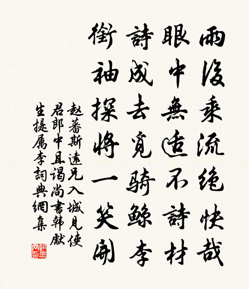 詩詞名句歷史字典書法欣賞書法字典國語詞典說文解字康熙字典古漢語字典標 題 作 者 詩 句 斯遠兄入城見使君郎中且謁尚書韓先生提屬李作者:趙蕃 朝代:宋代原文雨後乘流絕快哉,眼中無適不詩材。詩成去覓騎鯨李,銜袖探將一笑開。詩詞問答問:《斯遠兄入城見使君郎中且謁尚書韓先生提屬李》的作者是誰?答:趙蕃問:該詩寫於哪個朝代?答:宋代書法欣賞斯遠兄入城見使君郎中且謁尚書韓先生提屬李書法作品詩文賞析【原題】:斯遠兄入城見使君郎中且謁尚書韓先生提屬李丈題詩以贈四首詩詞推薦奉和令公綠野堂種花白居易〔唐代〕綠野堂開占物華,路人指道令公家。令公桃李滿天下,何用堂前更種花。自壽李劉〔宋代〕光景不相待,流年劇箭過。酸辛前詔左,科甲後生多。命蹇窮為祟,愁多睡作魔。蓋棺方事定,有酒且高歌。賡沈贊府題二陸草堂衛宗武〔宋代〕二俊書堂歷幾秋,風雲壯志浩難收。儻知蓴美過斗酪,應返故山尋勝游。正冬御殿上壽樂章八首其四皇帝第三爵酒登歌楊億〔宋代〕矯矯長離,振羽來儀。和音中律,藻翰揚輝。珍符沓至,品物修宜。至德玄感,受天之祺。潤州狠石石延年〔宋代〕水光浮柱礎,天影帶樓台。觸石雲孤起,吹潮雨四來。與王仲密諸君泛湖強至〔宋代〕十月清霜後,孤舟顥氣間。酒邊頹白日,棹底倒青山。境勝歡憂泯,吟頻物象慳。吾儕一笑後,魚鳥伴誰閒。春社陸游〔宋代〕柴門西畔枕陂塘,社雨新添一尺強。台省諸公方袞袞,故應分喜到耕桑。宣城見杜鵑花李白〔唐代〕蜀地曾聞子規鳥,宣城又見杜鵑花。一叫一迴腸一斷,三春三月憶三巴。王令收桂花蜜漬埳地瘞三月啟之如新朱翌〔宋代〕桂花老月窟,墮地散金蕊。長憂風雨余,失此香旖旎。撫樹三嘆息,留花姑少俟。枕中有仙方,解使香不死。蜜蜂寶雲庵戒師洪咨夔〔宋代〕鍾山好住苦弗住,馱嶺難居真欲居。出地入天須任我,來今去古不關渠。萬由旬上起膚寸,一剎那間彌太虛。識得淳祐祭海神十六首佚名〔宋代〕瀚海重潤,地紀亦歸。吞受百瀆,限制北陲。一視同仁,我心則怡。嘉薦玉幣,神其格思。藍田溪上楊時〔宋代〕夾籬桃李趁溪斜,淺淺清流映落花。欲問武陵源上路,度雲穿石認胡麻。庭堅得邑太和六舅按節出同安邂逅於皖公溪口黃庭堅〔宋代〕阿髯學升堂,乾母思靡悔。文成藝桃李,不言行道兌。阿蘇妙言語,機警欲無對。子姓何預人,蘭玉要可佩。趙龍學寄陽羨茶為汲蜀井對瓊花烹之方岳〔宋代〕三印誰分陽羨茶,自煎蜀井瀹瓊花。數間明月玉川屋,兩腋清風銀漢槎。團鳳烹來奴僕等,老龍畢竟當行家。相思題樟亭驛樓喻坦之〔唐代〕危檻倚山城,風帆檻外行。日生滄海赤,潮落浙江清。秋晚遙峰出,沙乾細草平。西陵煙樹色,長見伍員情。青龍寺曇璧上人兄院集王維〔唐代〕高處敞招提,虛空詎有倪。坐看南陌騎,下聽秦城雞。眇眇孤煙起,芊芊遠樹齊。青山萬井外,落日五陵西。眼界【中呂】上小樓_題情團圓未任昱〔元代〕題情團圓未成,嬋娟空病。桂子虛庭,翠羽圍屏,雁足寒檠。巴到明,空自省,青樓薄倖,恨分開鳳釵鸞鏡。隱居桃源憶故人張孝祥〔宋代〕朔風弄月吹銀霰。簾幕低垂三面。酒入玉肌香軟。壓得寒威斂。檀槽乍拈么絲慢。彈得相思一半。不道有人腸斷。聞裴侍御胐自襄州司戶除豫州司戶因以投寄孟浩然〔唐代〕故人荊河掾,尚有柏台威。移職自樊沔,芳聲聞帝畿。昔余臥林巷,載酒過柴扉。松菊無君賞,鄉園懶欲歸。浣溪沙張元乾〔宋代〕雲氣吞江卷夕陽。白頭波上電飛忙。奔雷驚雨濺胡床。玉節故人同壯觀,錦囊公子更平章。榕陰歸夢十分涼。名句推薦獨自淒涼還自遣,自製離愁。龔自珍《浪淘沙·寫夢》 萬物迎春送殘臘,一年結局在今宵。戴復古《除夜》 沖天香陣透長安,滿城盡帶黃金甲。黃巢《不第後賦菊》 解釋春風無限恨,沉香亭北倚闌乾。李白《清平調·其三》 仁之實,事親是也;義之實,從兄是也。孟子《孟子·離婁章句上·第二十七節》 乖僻自是,悔誤必多;頹惰自甘,家道難成。朱柏廬《朱子家訓·全文》 一種青山秋草里,路人唯拜漢文陵許渾《途經秦始皇墓》 暮雨相呼失,寒塘欲下遲。崔塗《孤雁二首·其二》 鐘山抱金陵,霸氣昔騰發。李白《登梅岡望金陵贈族侄高座寺僧中孚》 長幼有序。孟子《孟子·滕文公章句上·第四節》