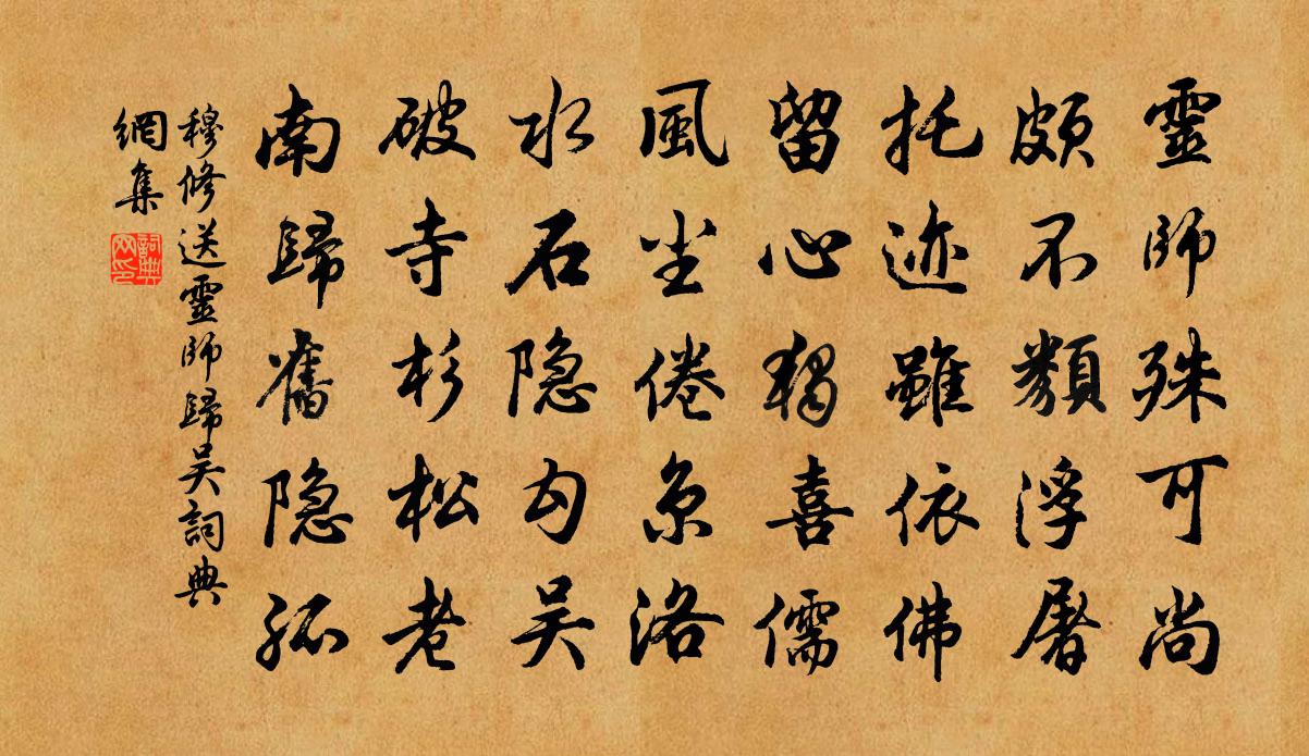詩詞名句歷史字典書法欣賞書法字典國語詞典說文解字康熙字典古漢語字典標 題 作 者 詩 句 送靈師歸吳作者:穆修 朝代:宋代送靈師歸吳原文靈師殊可尚,頗不類浮屠。托跡雖依佛,留心獨喜儒。風塵倦京洛,水石隱勾吳。破寺杉松老,南歸舊隱孤。詩詞問答問:送靈師歸吳的作者是誰?答:穆修問:送靈師歸吳寫於哪個朝代?答:宋代穆修送靈師歸吳書法欣賞送靈師歸吳書法作品詩詞推薦題自寫蘇黃像龔開〔宋代〕海風吹髮如短蓬,精魄弄成禿鬢翁。歸來已覺陽羨鄰里喜,不似雪堂概江空。六年歲月幪尊中。何況如今一螺墨,初發揚子寄元大校書韋應物〔唐代〕淒淒去親愛,泛泛入煙霧。歸棹洛陽人,殘鍾廣陵樹。今朝此為別,何處還相遇。世事波上舟,沿洄安得住。江城子慢呂渭老〔宋代〕新枝媚斜日。花徑霽、晚碧泛紅滴。近寒食。蜂蝶亂、點檢一城春色。倦遊客。門外昏鴉啼夢破,春心似、遊絲飛錢塘迎酒歌楊炎正〔宋代〕錢塘妓女顏如玉,一一紅妝新結束。問渠結束何所為,八月皇都酒新熟。酒新熟,浮蛆香,往醉金釵十二行。十三滬帥曹太博生日四首魏了翁〔宋代〕荔香搖艇下滬川,自別君侯十八年。尉我調飢刻為歲,爭如兩日往南田。依韻和歐陽永叔秋懷擬孟郊體見寄二首梅堯臣〔宋代〕秋思公何高,堆積自嵱嵷。出為悲秋辭,萬仞見孤聳。念我老於詩,我發實種種。而後傷故人,故人多作冢。陰風偈釋如本〔宋代〕久雨不晴,戊在丙丁。通身泥水,露出眼睛。且道是什麽眼睛,林間泥滑滑,時叫兩三聲。孟子枉尺直尋陳普〔宋代〕計利無非患得心,誰能枉己直於人。既甘隱忍無羞惡,氣餒如何更復伸。用前韻呈德瞻劉錡〔宋代〕門外蹄輪任跡疎,一廛深稱水雲居。平生事業將何用,嘆括空能讀父書。送孫山人姚合〔唐代〕山翁來帝里,不肯住多時。塵土衣裳重,腥膻仆隸飢。林中愁不到,城外老應遲。喧寂一為別,相逢未有期。送陳子歸陸渾別業岑參〔唐代〕雖不舊相識,知君丞相家。故園伊川上,夜夢方山花。種藥畏春過,出關愁路賒。青門酒壚別,日暮東城鴉。寓題杜牧〔唐代〕把酒直須判酩酊,逢花莫惜暫淹留。假如三萬六千日,半是悲哀半是愁。憶壽春廢虎坑余以春二月至郡主吏舉所職稱霍…去郡三載李紳〔唐代〕匪將履尾求兢惕,那效探雛所患爭。當路絕群嘗誡暴,為貓驅獮亦先迎。每推至化宣餘力,豈用潛機害爾生。休逐和張仲山寄酒馮時行〔宋代〕兵廚盎盎孚盈缶,憐我十年青濮口。投醪分惠繼以詩,詩更分香過於酒。酒瓶詩卷墮我前,頓使幽棲添二友。朝吟西村陸游〔宋代〕亂山深處小桃源,往歲求漿憶叩門。高柳簇橋初轉馬,數家臨水自成村。荿林風送幽禽語,壞壁苔侵醉墨痕。一首題黃連步接官亭壁鄱陽婦人〔宋代〕故里蕭條一望間,此身飄泊嘆空還。感時有恨無人說,愁斂雙蛾對暮山。次韻答陣夢錫十首陳造〔宋代〕冰檗未肯執名卿,搔頭自剔書窗燈。君家老人如椽筆,淛江鄞水倒泓澄。明堂樂章。雍和佚名〔唐代〕八牖晨披,五精朝奠。霧凝璇篚,風清金縣。神滌備全,明粢豐衍。載絜彝俎,陳誠以薦。夏日書事魏野〔宋代〕尋常苦出門,況復在炎蒸。短褐披猶懶,長裾曳豈能。松風輕賜扇,石井勝頒冰。只此貧無事,常愁不易勝。和羅巨濟教雪二首楊萬里〔宋代〕飛來須面旋,欲墮更橫斜。不遣詩人嬾,惟禁酒力加。鏤水初試手,翦水便成花。誰會歐蘇律,徫吟別一家。名句推薦始憐幽竹山窗下,不改清陰待我歸。錢起《晚春歸山居題窗前竹 / 暮春歸故山草堂詩》 朔風吹雪透刀瘢,飲馬長城窟更寒。盧汝弼《和李秀才邊庭四時怨·其四》 同聲相應,同氣相求。佚名《易傳·乾文言》 請為父老歌,艱難愧深情杜甫《羌村三首·其三》 日落沙明天倒開,波搖石動水縈迴李白《東魯門泛舟二首》 醉後莫思家,借取師師宿。晏幾道《生查子·落梅庭榭香》 知君仙骨無寒暑。蘇軾《木蘭花令·次馬中玉韻》 尚憶先朝多樂事,孝皇曾為兩宮開。王守仁《元夕二首》 何期小會幽歡,變作離情別緒。柳永《晝夜樂·洞房記得初相遇》 一雙舞燕,萬點飛花,滿地斜陽。陳子龍《訴衷情·春遊》