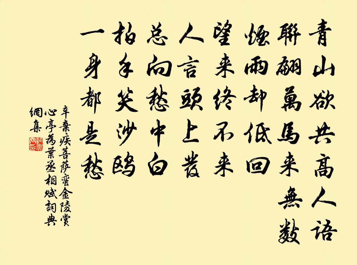 下闋,由眺望青山之悵惘陡轉而為揶揄沙鷗之詼諧,但曲斷意不斷,其脈絡仍清晰可見。雖著筆輕快,實則發自積鬱。人們都說頭髮總是由此愁悶變白的。“拍手笑沙鷗,一身都是愁。”如果是這樣的話,那么水上的沙鷗通體皆白,豈不是一身都是愁嗎 ?詞人故意發此狂想,而且拍手笑之,似乎把上闋歇拍低徊沉鬱的氣氛一掃而光了;然而仔細體味,就會察覺到那貫穿全詞的“愁 ”字並消失,或者說詞人極力排遣這如煙雨一般的無盡的愁思,是感情上的掙扎,而非心靈上的解脫。人之發白並不完全由於人心之愁;而沙鷗通體皆白 ,是其自然特徵,與愁沒有關係。詞人故意造成邏輯上的錯誤,說得越幽默灑脫 ,反而越使人感到強自解愁而又不能解的痛苦,借說鳥與愁無關,實說愁與人甚切。人愁是實,鳥愁是虛 ,“一身都是愁”的是鳥還是人,不必拘泥於字句的解釋而自曉。故“拍手笑沙鷗 ”,一縱即逝;而“一身都是愁 ”,卻如電影上的“慢鏡頭”在觀眾視野里由快放慢了。實際上“一身都是愁”是與“煙雨卻低徊,望來終不來”暗中息息相關的。儘管詞筆迴蕩曲折,然而透過層瀾,仍可以看清。白居易《白鷺詩》雲 :“人生四十未全衰,我為愁多白髮垂。何故水邊雙白鷺,無愁頭上也垂絲 。”辛詞蓋本於此。白詩言愁顯 ,辛詞言愁晦 ,其言愁一也。但辛詞多了“拍手笑”一層意思。不過就其形象來看,辛詞較之白詩更加繪聲繪色;就其感情來說,則更加摯濃深切。參閱作者同年在建康所作的《水龍吟·登建康賞心亭》,充滿了激憤憂愁。以至於“倩何人喚取,紅巾翠袖,搵英雄淚 ”!胸中積鬱如此,則登賞心亭之所見所感都無非“獻愁供恨”而已。由此可見,在《菩薩蠻》之中亦飽含著詞人之愁,英雄之淚。某些喜劇會使有心的觀眾在笑聲中情不自禁地掉下熱淚。笑和眼淚,就是似乎矛盾卻又融合無間的。