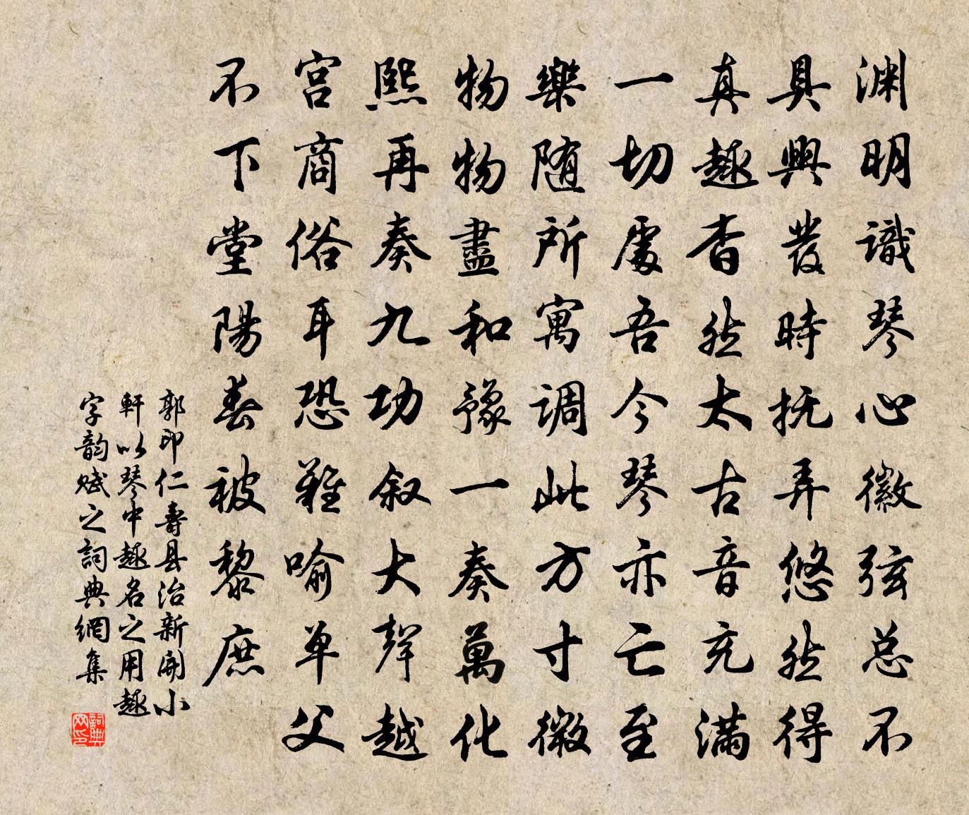 詩詞名句歷史字典書法欣賞書法字典國語詞典說文解字康熙字典古漢語字典標 題 作 者 詩 句 仁壽縣治新開小軒以琴中趣名之用趣字韻賦之作者:郭印 朝代:宋代原文淵明識琴心,徽弦總不具。興發時撫弄,悠然得真趣。杳然太古音,充滿一切處。吾今琴亦亡,至樂隨所寓。調此方寸微,物物盡和豫。一奏萬化熙,再奏九功敘。大聲越宮商,俗耳恐難喻。單父不下堂,陽春被黎庶。詩詞問答問:《仁壽縣治新開小軒以琴中趣名之用趣字韻賦之》的作者是誰?答:郭印問:該詩寫於哪個朝代?答:宋代書法欣賞仁壽縣治新開小軒以琴中趣名之用趣字韻賦之書法作品詩詞推薦次韻君玉春日戴復古〔宋代〕風雨不相貸,敏華能幾時。才歌喜晴賦,又作惜春詩。壓架酴醾老,翻階芍藥遲。無花何足算,有酒且相期。和趙榮州胡寅〔宋代〕兵戎暌隔幾春秋,又向南州話北州。一飯識君塵外趣,三川回首夢中游。可堪麗藻相華寵,逢斷沉疴合罷休。安得水口上舟呈同行傅月山萇五邁〔宋代〕泝流上嵩江,江闊流益峻。時方良月初,打關惡風信。老翁把柂立,首叫尾必應。大男前運稿,風激水還噴。小男曲江李復〔宋代〕唐址莽荊榛,安知秦宮殿。常因秋雨多,時有微泉泫。菰蒲春自生,鳧鶩秋猶戀。千古蔽一言,物極理必變。游廬山山陽七詠其三簡寂觀蘇轍〔宋代〕山行但覺鳥聲殊,漸近神仙簡寂居。門外長溪淨客足,山腰苦筍助盤蔬。喬松定有藏丹處,大石仍存拜斗余。弟子對燭陳允平〔宋代〕忽憶巴山夜,西窗風雨寒。自憐清影獨,誰識寸心丹。草長花猶在,香銷淚不乾。海棠貪睡去,惆悵五更殘。太湖吟葛紹體〔宋代〕只飲太湖水,不膾松江鱸。鱸雜魚蝦腥,水涵天地初。千里開鏡奩,一色包冰壺。日月遞吐吞,蛟龍相蟄舒。上接送胡邦衡之新州貶所王庭珪〔宋代〕囊封初上九重關,是日清都虎豹閒。百辟動容觀奏牘,幾人回首愧朝班?名高北斗星辰上,身墮南州瘴海間。不待宿遷道中遇雪陸文圭〔宋代〕登車宿遷北,萬頃鋪瓊田。墨雲淇水光,上下玻璃天。六花時時飄,集我車上氈。左右拍手笑,翁似日鶴仙。失卻懷友張籍〔唐代〕人生有行役,誰能如草木。別離感中懷,乃為我桎梏。百年受命短,光景良不足。念我別離者,願懷日月促。平地章獻明肅皇太后恭謝太廟佚名〔宋代〕英英藝祖,出震承乾。握圖撫運,卜祚延年。衣冠在廟,威靈在天。永錫無疆,子孫保焉。和杜孝錫展江亭三首韓維〔宋代〕驚鷺飛鳴避畫橈,遊人笑語過朱橋。買家園裡花應謝,綠遍牆頭野杏梢。浣溪沙·游蘄水清泉寺蘇軾〔宋代〕游蘄水清泉寺,寺臨蘭溪,溪水西流。山下蘭芽短浸溪,松間沙路淨無泥,蕭蕭暮雨子規啼。誰道人生無再少?門春思馬戴〔唐代〕初日照楊柳,玉樓含翠陰。啼春獨鳥思,望遠佳人心。幽怨貯瑤瑟,韶光凝碧林。所思曾不見,芳草意空深。想得韓翃〔唐代〕兩重門裡玉堂前,寒食花枝月午天。想得那人垂手立,嬌羞不肯上鞦韆。山居新種花葯,與道士同游賦詩錢起〔唐代〕自樂魚鳥性,寧求農牧資。淺深愛岩壑,疏鑿盡幽奇。雨花相助好,鶯鳴春草時。種蘭入山翠,引葛上花枝。風露天童三閣范成大〔宋代〕松蘿冪天墮空翠,迎面風香三十里。曾宮亭亭隔瑤水,碧瓦瓊榱五雲里。千佛當門無半偈,聲聞未解祖師意。遍參踏莎行韓絳〔宋代〕嵩嶠雲高,洛川波暖。舉頭喬木森無斷。□□□雨絕風塵,小橋頻過春渠滿。□□離宮,□棱斗煥。萬家羅綺多游上亭北軒對月吹笛得才元舍人昭華引醉霜月草文同〔宋代〕瀲灩金波瀉碧空,隔霜寒影下征鴻。夜深一笛昭華引,吹滿千岩萬壑中。晦日詔宴永穆公主亭子賦得流字張說〔唐代〕堂邑山林美,朝恩晦日游。園亭含淑氣,竹樹繞春流。舞席千花妓,歌船五彩樓。群歡與王澤,歲歲滿皇州。名句推薦存亡在虛實,不在於眾寡。韓非及後人《韓非子·安危》 道私者亂,道法者治。韓非及後人《韓非子·詭使》 懷舊空吟聞笛賦,到鄉翻似爛柯人。劉禹錫《酬樂天揚州初逢席上見贈》 江間波浪兼天涌,塞上風雲接地陰。杜甫《秋興八首·其一》 為淵驅魚者,獺也;為叢驅爵者,鸇也孟子《孟子·離婁章句上·第九節》 同居長乾里,兩小無嫌猜。李白《長干行二首》 隨侯之珠,國寶也,然用之彈,曾不如泥丸劉向《說苑·雜言》 君子之德風,小人之德草,草上之風必偃。孔子弟子《論語·顏淵篇》 拜華星之墜幾,約明月之浮槎。文天祥《回董提舉中秋請宴啟》 月兒彎彎照九州,幾家歡樂幾家愁。佚名《月兒彎彎照九州》