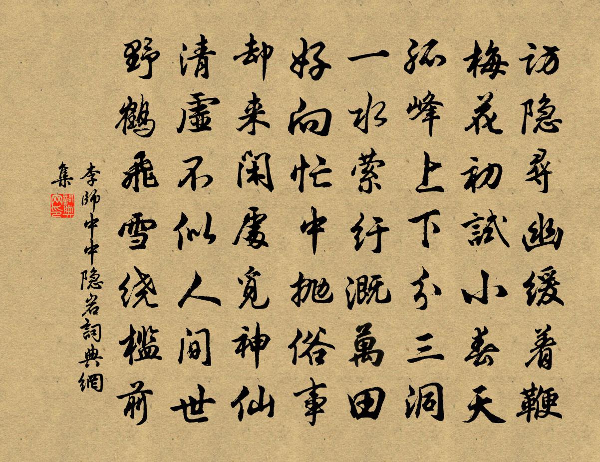 詩詞名句歷史字典書法欣賞書法字典國語詞典說文解字康熙字典古漢語字典標 題 作 者 詩 句 中隱岩作者:李師中 朝代:宋代中隱岩原文訪隱尋幽緩著鞭,梅花初試小春天。孤峰上下分三洞,一水縈紆溉萬田。好向忙中拋俗事,卻來閒處覓神仙。清虛不似人間世,野鶴飛雪繞檻前。詩詞問答問:中隱岩的作者是誰?答:李師中問:中隱岩寫於哪個朝代?答:宋代李師中中隱岩書法欣賞中隱岩書法作品詩詞推薦句佚名〔宋代〕楚國封疆六千里,荊門岩巒十二碚。賦祝次仲八景洞庭秋月劉學箕〔宋代〕木落露君山,空明夜氣浮。冰輪揩鑒淨,皓彩洋波流。空外數聲笛,孤吟人倚樓。出迎使客質明放船自瓦窋歸黃庭堅〔宋代〕鼓吹喧江雨不開,丹楓落葉放船回。風行水上如雲過,地近嶺南無雁來。樓閣人家捲簾幕,菰蒲鷗鳥樂灣洄。惜無題丹景山程公許〔宋代〕原廟標丹景,神遊想貸宗。寶龕嚴石像,紺殿銷雲峰。浪說侵疆復,何當檢玉封。天門東北望,漠漠曉煙濃。題石潭觀音院用王樞密庶愚丘正宗韻二首趙蕃〔宋代〕老衲迎門只敝裳,問年還舉四山黃。誰雲此院通衢著,渠自長閒人自忙。失調名佚名〔宋代〕便是監商孟客兒。賢侍者號木翁釋智愚〔宋代〕錄曲輪囷兒似痴,春風化鳥自忘機。年來老大混無用,一任叢林鼓是非。觀李九少府翥樹宓子賤神祠碑高適〔唐代〕吾友吏茲邑,亦嘗懷宓公。安知夢寐間,忽與精靈通。一見興永嘆,再來激深衷。賓從何逶迤,二十四老翁。於焉感事四首歐陽修〔宋代〕仙境不可到,誰知仙有無。或乘九斑◇,或駕五雲車。朝倚扶桑枝,暮游崑崙墟。◇來幾萬里,誰復遇諸塗。富貴贈書肆陳解元危稹〔宋代〕兀坐書要自切磋,閱人應似閱書多。未知買得君書去,不負君書人幾何。諒公洞庭孤橘歌顧況〔唐代〕不種自生一株橘,誰教渠向階前出,不羨江陵千木奴。下生白蟻子,上生青雀雛。飛花檐卜旃檀香,結實如綴摩尼慶清朝佚名〔宋代〕朏月生西,杓星建未,畫堂晝景偏長。天生英傑,獨向此炎光。超卓凡塵表物,精神秋水自清涼。真奇特,清溝挺病起十首劉克莊〔宋代〕酒戶詩壇聊爾耳,也吟唧唧醉陶陶。鯨魚翡翠兼群體,蜾蠃螟蛉視二豪。京洛飲徒煩借問,江湖社友謬推高。可憐廣化寺陳桷〔宋代〕山高不受暑,秋到十分涼。望外去程遠,閒中度日長。寺林投宿鳥,山路自歸羊。物物各有適,羈愁逐異鄉。薛氏鏡山甄龍友〔宋代〕我生不是先,偶與前輩隔,古人猶愛水,況此千丈碧。孤圓本然明,萬象紛如繹。行吟鬼破膽,坐釣風生腋。疏梅送趙長史歸閩川齊己〔唐代〕荊門與閩越,關戍隔三千。風雪揚帆去,台隍指海邊。客情消旅火,王化似堯年。莫失春回約,江城穀雨前。桂隱紀詠撫鶴亭張鎡〔宋代〕立縞芳桂陰,置汝固已當。他年莫姓丁,止廁子侄行。叔父生日項安世〔宋代〕一年生日最佳時,三老團欒總秀眉。北榭空明新眼界,東床訊息稱心期。竹林風景長宜酒,椒頌年華剩索詩。試拂溫泉宮鮑溶〔唐代〕憶昔開元天地平,武皇十月幸華清。山蒸陰火雲三素,日落溫泉雞一鳴。彩羽鳥仙歌不死,翠霓童妾舞長生。仍聞次韻實之春日二首劉克莊〔宋代〕向來文字擅中朝,留落而今賦大招。才子左遷追屈賈,相君高蹈友松喬。山行或與樵爭席,澗飲聊將掬代瓢。借使名句推薦明朝又是孤舟別,愁見河橋酒幔青。竇叔向《夏夜宿表兄話舊》 恐鳳靴,挑菜歸來,萬一灞橋相見。史達祖《東風第一枝·詠春雪》 不患無位,患所以立;不患莫已知,求為可知也。孔子弟子《論語·里仁篇》 古之君子,過則改之。孟子《孟子·公孫丑章句下·第九節》 方慚不耕者,祿食出閭里。韋應物《觀田家》 彩舟載得離愁動。無端更借樵風送。賀鑄《菩薩蠻·彩舟載得離愁動》 北風吹雪四更初,嘉瑞天教及歲除。陸游《除夜雪》 昨夢西湖,老扁舟身世。吳文英《拜星月慢·林鐘羽姜石帚以盆蓮數十置中庭宴客其中》 霜降碧天靜,秋事促西風。葉夢得《水調歌頭·九月望日與客習射西園余偶病不能射》 人之易其言也,無責耳矣。孟子《孟子·離婁章句上·第二十二節》