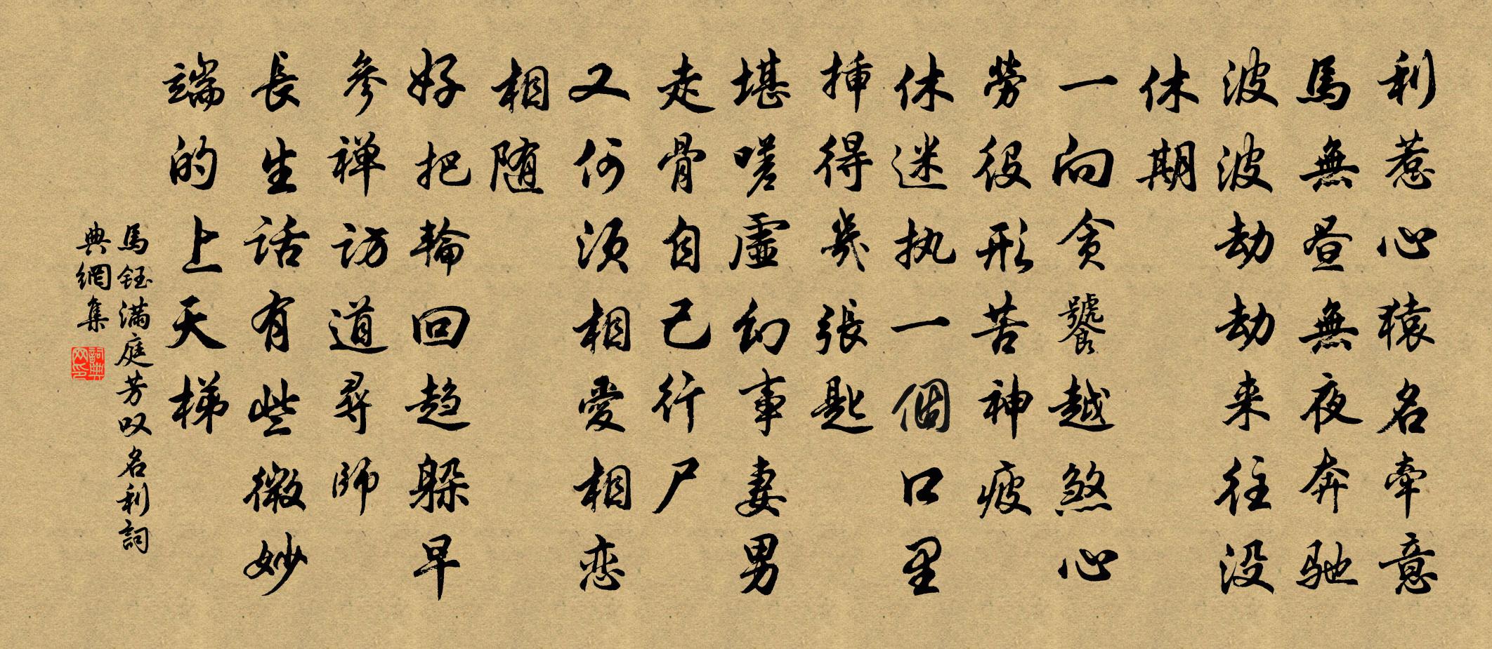 詩詞名句歷史字典書法欣賞書法字典國語詞典說文解字康熙字典古漢語字典標 題 作 者 詩 句 滿庭芳 嘆名利作者:馬鈺 朝代:元代滿庭芳 嘆名利原文利惹心猿,名牽意馬,無晝無夜賓士。波波劫劫,來往沒休期。一向貪饕越煞,心勞役、形苦神疲。休迷執,一個口裡,插得幾張匙。堪嗟虛幻事,妻男走骨,自己行屍。又何須相愛,相戀相隨。好把輪迴趨躲,早參禪、訪道尋師。長生話,有些微妙,端的上天梯。詩詞問答問:滿庭芳 嘆名利的作者是誰?答:馬鈺問:滿庭芳 嘆名利寫於哪個朝代?答:元代問:滿庭芳 嘆名利是什麼體裁?答:詞馬鈺滿庭芳 嘆名利書法欣賞滿庭芳 嘆名利書法作品詩詞推薦景震劍文佚名〔唐代〕撝雷電,運玄星。摧兇惡,亨利貞。乾降精,坤應靈。日月象,岳瀆形。頌古釋道顏〔宋代〕從來五逆怕聞雷,不似大蟲看水磨。孤峰頂上要同行,十字街頭還共坐。雨中花(七夕)楊無咎〔宋代〕漠漠雲輕,涓涓露重,西風特地颼颼。覺良宵初永,袢暑微收。乘鶴緱山,浮槎銀漢,尚想風流。笑人間兒戲,瓜減字木蘭花張掄〔宋代〕天機深遠。不遇真仙爭得見。欲下工夫。須是先尋偃月爐。抽添運用。火候不明□妄動。毫髮才差。只恐靈根□□送楊侍禁寄頻黃二公二首陳師道〔宋代〕相逢今已晚,同府尚經年。眾口不成虎,諸公更薦賢。兩親須薄祿,一障欲乘邊。往問頻夫子,何妨試著鞭。即事張嵲〔宋代〕屐齒休令破紫苔,柴門無客不須開。雨余籬菊埋光去,木落前山獻體來。妾薄命徐照〔宋代〕初與君相知,便欲腸肺傾。只擬君肺腸,與妾相似生。徘徊幾言笑,始司非真情。妾情不可收,悔思淚盈盈。盱眙北望戴復古〔宋代〕北望茫茫渺渺間,鳥飛不盡又飛還。難禁滿目中原淚,莫上都梁第一山!同諸友城南張園賞梅十首邵雍〔宋代〕春早梅花正爛開,生平不飲亦銜杯。城南盡日高台上,恰似江南去一回。謝虛齋和詩鄭清之〔宋代〕關心穡事恐春遲,暫許花風入繡旗。翠浪半天岐麥詠,玉簪數箸刈蔞詩。野亭寄韻追唐什,秋菊餐芳敵楚辭。早晚次韻留友直道士來訪陳著〔宋代〕九六盪摩中,幾人閒處同。浮生絲傀儡,後計石婆翁。事事休休過,時時咄咄空。何如仙羽健,來往傲方蓬。年老逢春十三首邵雍〔宋代〕年老逢春春莫慳,春慳不當世艱難。四時只有三春好,一歲都無十日間。酒盞不煩人訴免,花枝須念雨摧殘。卻愁暮春戲贈樊宗憲鮑溶〔唐代〕羌笛胡琴春調長,美人何處樂年芳。野船弄酒鴛鴦醉,官路攀花騕褭狂。應和朝雲垂手語,肯嫌夜色斷刀光。春陰方岳〔宋代〕玲瓏碧樹巧臨池,影在窗前作么移。水墨畫圖春淡淡,鶯花庭院日遲遲。不妨明月重相憶,怎許浮雲浪得知。一片贈李邦直探梅蘇軾〔宋代〕尋花不惜命,愛雪常忍凍。三為郡太守,清似於陵仲。解悶盧仝〔唐代〕人生都幾日,一半是離憂。但有尊中物,從他萬事休。蝶戀花 聚骨扇完顏璟〔元代〕幾股湘江龍骨瘦。巧樣翻騰,疊作湘波皺。金縷小鈿花草門。翠條更結同心扣。金殿珠簾間永畫。一握清風,暫喜夜讀葛紹體〔宋代〕滿床書籍夜從容,靜里關心舊臥龍。燈燼落紅煙縷碧,五更風雨咽疎鍾。初貶南巴至鄱陽,題李嘉祐江亭劉長卿〔唐代〕巴嶠南行遠,長江萬里隨。不才甘謫去,流水亦何之。地遠明君棄,天高酷吏欺。清山獨往路,芳草未歸時。流落奉和襲美太湖詩二十首三宿神景宮陸龜蒙〔唐代〕靈蹤未遍尋,不覺溪色暝。回頭問棲所,稍下杉蘿徑。岩居更幽絕,澗戶相隱映。過此即神宮,虛堂愜雲性。四軒名句推薦青山遮不住,畢竟東流去辛棄疾《菩薩蠻·書江西造口壁》 孤帆遠影碧空盡,唯見長江天際流。李白《黃鶴樓送孟浩然之廣陵》 樂遊原上清秋節,鹹陽古道音塵絕。李白《憶秦娥·簫聲咽》 參差煙樹灞陵橋,風物盡前朝柳永《少年游·參差煙樹灞陵橋》 六朝文物草連空,天淡雲閒今古同。杜牧《題宣州開元寺水閣閣下宛溪夾溪居人》 淚濕羅巾夢不成,夜深前殿按歌聲。白居易《後宮詞》 處事有何定憑,但求此心過得去王永彬《圍爐夜話·第三九則》 酌酒以自寬,舉杯斷絕歌路難。鮑照《擬行路難·其四》 離恨做成春夜雨。添得春江,劃地東流去楊炎正《蝶戀花·別范南伯》 敵者,利害相衝,死生弗容;未察之無以辨友,非制之無以成業。來俊臣《羅織經·制敵卷第五》
