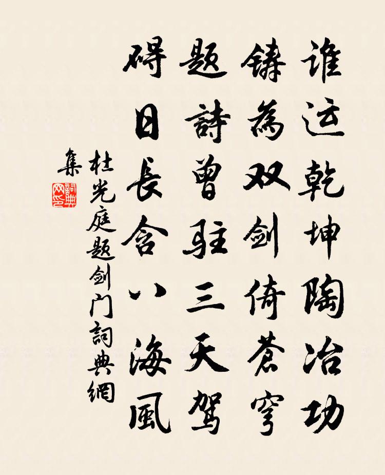 詩詞名句歷史字典書法欣賞書法字典國語詞典說文解字康熙字典古漢語字典標 題 作 者 詩 句 題劍門作者:杜光庭 朝代:唐代題劍門原文誰運乾坤陶冶功,鑄為雙劍倚蒼穹。題詩曾駐三天駕,礙日長含八海風。詩詞問答問:題劍門的作者是誰?答:杜光庭問:題劍門寫於哪個朝代?答:唐代問:題劍門是什麼體裁?答:七絕杜光庭題劍門書法欣賞題劍門書法作品注釋全唐詩:卷854-16詩詞推薦京城苦熱姚勉〔宋代〕羲和鞭日就地行,祝融張傘燒空明。錢塘人家苦逼仄,行立坐臥皆如蒸。清宮水殿山峨雪,夜飲相攜冰玉潔。溫泉頌證道歌證道歌釋印肅〔宋代〕歷江海,入此土,萬水千山同一路。來時無物去時空,稽首牟尼悉加護。游北岩馮伯規〔宋代〕遙指蒙茸雲木堆,入門小剎傍岩偎。放懷邱壑興未盡,隔岸角聲招我回。謝人惠《十才子圖》齊己〔唐代〕丹青妙寫十才人,玉峭冰棱姑射神。醉舞離披真鸑鷟,狂吟崩倒瑞麒麟。翻騰造化山曾竭,采掇珠璣海幾貧。猶得謝公墩王安石〔宋代〕走馬白下門,投鞭謝公墩。昔人不可見,故物尚或存。問樵樵不知,問牧牧不言。摩挲蒼苔石,點檢屐齒痕。想此又塔院洪咨夔〔宋代〕僧伽傳法處,阿育放光時。到頂直無縫,透心橫有枝。梅間詩鳳咮,竹裹酒鴟夷。醉上危層去,空明渺所思。登越山李覯〔宋代〕臘後梅花破碎香,望中情地轉淒涼。游山只道尋高處,高處何曾見故鄉。魚遊春水盧祖皋〔宋代〕離愁禁不去。好夢別來無覓處。風翻征袂,觸目年芳如許。軟紅塵里鳴鞭鐙,拾翠叢中句伴侶。都負歲時,暗關情寒食後出郊一首蘇籀〔宋代〕澹沱東風酒一卮,笙篁雞鞠傲春暉。綠波泛灩心微盪,邃苑提攜手未揮。藿靡莎長縈冶步,猗儺化亞罥薰衣。桃溪慶元二年皇后冊寶十三首佚名〔宋代〕肅肅台的,雍雍陰教。陰詖自防,警下是俲。中章端委,列御硼告。其國輔順,永翼帝孝。朝中措趙師俠〔宋代〕疏疏簾幕映娉婷。初試曉妝新。玉腕雲邊緩轉,修蛾波上微顰。鉛華淡薄,輕勻桃臉,深注櫻唇。還似舞鸞窺沼,遣懷杜牧〔唐代〕道泰時還泰,時來命不來。何當離城市,高臥博山隈。呈痴絕庵主頌徐敏子〔宋代〕痴絕有庵不肯住,弄老挑雲徑山去。地水火風分裂時,親書贈予黃葛布。蛻封讀罷咽無語,會得龍鬚能辟暑。豈知水調歌頭(賀許侍郎奕得孫)魏了翁〔宋代〕三十作龍首,四十珥貂蟬。幡然攜取名節,錦繡蜀山川。攬轡扶桑初曉,飲馬鹹池未旰,來日盡寬閒。茲事亦云足船尾夜坐黎廷瑞〔宋代〕船尾夜深深,無人伴苦吟。萬山黃葉夢,一路早梅心。度纖驚村犬,移篙動水禽。誰家搗衣急,殘月數砧聲。獨坐晚題趙蕃〔宋代〕甚厭窮居陋,聊為佛界遨。追隨有逢掖,應對屬方袍。褊性便幽隱,畏途思避逃。明當與山別,回首念塵勞。文周翰盛暑帖贊岳珂〔宋代〕同文之獄,諸賢非一族。殄瘁之悲,獨及於禹玉。豈一人之言,自為之反覆。傷哉利祿。詠雙杏子其核亦然梅堯臣〔宋代〕子核成雙杏,將寄同心人。定棲鴛鴦魄,為物豈無因。馬鞍驛飯罷縱步范成大〔宋代〕食飽倦輿馬,散策步前岡。意行踏芳草,蕭艾蓊生香。春事甚寂寥,山桃帶松篁。游蜂入菜花,此豈堪蜜房?今年奔問三峰寓止近墅鄭谷〔唐代〕半年奔走頗驚魂,來謁行宮淚眼昏。鴛鷺入朝同待漏,牛羊送日獨歸村。灞陵散失詩千首,太華淒涼酒一樽。兵革名句推薦君人者,愛民而安,好士而榮,兩者無一焉而亡。荀子《荀子·君道》 皮之不存,毛將安傅?左丘明《左傳·僖公·僖公十四年》 理無常是,事無常非。列子及其弟子《列子·說符》 與死人同病者,不可生也;與亡國同事者,不可存也。韓非及後人《韓非子·孤憤》 西湖舊日,留連清夜,愛酒幾將花誤。吳文英《永遇樂·探梅次時齋韻》 迴廊四合掩寂寞,碧鸚鵡對紅薔薇。李商隱《日射》 羈旅長堪醉,相留畏曉鍾。戴叔倫《客夜與故人偶集 / 江鄉故人偶集客舍》 如來是真語者。實語者。如語者。不誑語者。不異語者。鳩摩羅什譯《金剛經·離相寂滅》 縱被無情棄,不能羞。韋莊《思帝鄉·春日游》 予若洞庭葉,隨波送逐臣。李白《送郄昂謫巴中》