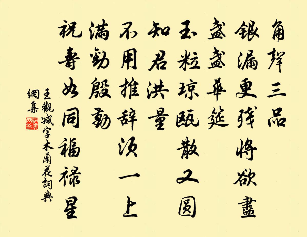 詩詞名句歷史字典書法欣賞書法字典國語詞典說文解字康熙字典古漢語字典標 題 作 者 詩 句 減字木蘭花作者:王觀 朝代:宋代減字木蘭花原文角聲三品。銀漏更殘將欲盡。盞盞華筵。玉粒瓊甌散又圓。知君洪量。不用推辭須一上。滿勸殷勤。祝壽如同福祿星。詩詞問答問:減字木蘭花的作者是誰?答:王觀問:減字木蘭花寫於哪個朝代?答:宋代問:減字木蘭花是什麼體裁?答:詞王觀減字木蘭花書法欣賞減字木蘭花書法作品詩詞推薦伯恭侄家書所見丘葵〔宋代〕百舌在牆頭,其子在牆根。飛飛拾蟲蟻,哺之何殷勤。和元員外題昇平里新齋楊巨源〔唐代〕自知休沐諸幽勝,遂肯高齋枕廣衢。舊地已開新玉圃,春山仍展綠雲圖。心源邀得閒詩證,肺氣宜將慢酒扶。此外洪橋客窗枕上陳郁〔宋代〕桐葉飄零月似冰,並河燈火夜寒生。闌乾倦倚投床去,臥聽趨朝過馬聲。芙蓉池作曹丕〔魏晉〕乘輦夜行游,逍遙步西園。雙渠相溉灌,嘉木繞通川。卑枝拂羽蓋,修條摩蒼天。驚風扶輪轂,飛鳥翔我前。丹霞鴛鴦梅李龍高〔宋代〕莫是夷齊紀出身,又疑洛下見機雲。世人苦被風情累,也把妖名涴卻君。摸魚子許有孚〔元代〕買陂塘旋栽楊柳,佳人屢輟齋務。扁舟蕩漾亭深處,堪避片雲疏雨。明月渚。有仙子凌波,解佩留芳嶼。園丁亦語野田黃雀行文同〔宋代〕搥鼉花鏗鯨宴瑤花台,紅鴉花弄翼春徘花徊。和風入坐賓主樂,金觥玉豆天中來。勸君劇飲莫自訴,暗中光景能相南柯子侯善淵〔元代〕未悟千般有,心開一物無。有無爭覺頓清虛。混內傾陽,一點透靈烏。瑞氣盤金鼎,祥煙玩玉壺。玉壺金鼎煉神珠安樂窩示元德第二首裘萬頃〔宋代〕清泉出石竇,白雲臥山窩。淋淫乍開霽,原野歡聲多。吾廬近西峰,其下林婆娑。解衣坐磐石,持竿釣清波。主人皇帝合春帖子周南〔宋代〕禁御希臨幸,宵衣戒未明。余閒寓弧矢,勸講只儒生。橫吹曲辭。隴頭吟翁綬〔唐代〕隴水潺湲隴樹黃,征人隴上盡思鄉。馬嘶斜日朔風急,雁過寒雲邊思長。殘月出林明劍戟,平沙隔水見牛羊。橫行懷廬山董嗣杲〔宋代〕屏心寒夢枕,屋角曉城鍾。客子幾多想,廬山千萬峰。仙源雲氣疊,溪坂雨聲重。楊柳西門外,禪人屢此逢。雜詩李端〔唐代〕主第辭高飲,石家赴宵會。金谷走車來,玉人騎馬待。壽陽曲·遠浦帆歸馬致遠〔元代〕夕陽下,酒旆閒,兩三航未曾著岸。落花水香茅舍晚,斷橋頭賣魚人散。按視沙苑李復〔宋代〕南瀕清渭北洛水,寒沙東西橫百里。中條太華塞秦關,眾川無歸皆瀦此。地維忽斷兩山高,帝罰罔功五丁死。波飛苦雨方岳〔宋代〕稼欲登場只等晴,入倉方始是收成。雨須小住為佳耳,已約鄰翁話太平。偈頌二百零五首釋正覺〔宋代〕管簽真風暗度韶,春恩如許在芳條。志公不是閒和尚,拄杖頭邊有剪刀。東亭蘇軾〔宋代〕仙山佛國本同歸,世路玄關兩背馳。到處不妨閒卜築,流年自可數期頤。遙知小檻臨廛市,定有新松長棘茨。誰道遜往泉城獲麥蘇轍〔宋代〕少年食稻不食粟,老居潁川稻不足。人言小麥勝西川,雪花落磨煮成玉。冷淘槐葉冰上齒,湯餅羊羹火入腹。五年寒梅於石〔宋代〕閉門一卷易,風定縷香凝。落葉空階雨,殘梅閣硯冰。鳥啼深夜語,犬吠隔籬燈。不作紅塵夢,寒窗幾曲肱。名句推薦匹馬南來渡浙河,汴城宮闕遠嵯峨。于謙《岳忠武王祠》 一曲新詞酒一杯,去年天氣舊亭台。晏殊《浣溪沙·一曲新詞酒一杯》 烈士暮年,壯心不已。曹操《龜雖壽》 水際輕煙,沙邊微雨。荷花芳草垂楊渡。劉將孫《踏莎行·閒遊》 明朝萬一西風動,爭向朱顏不耐秋。晏幾道《鷓鴣天·守得蓮開結伴遊》 遠岫出山催薄暮,細風吹雨弄輕陰。梨花欲謝恐難禁。李清照《浣溪沙·小院閒窗春色深》 同來不得同歸去,故國逢春一寂寥!杜牧《宣州送裴坦判官往舒州時牧欲赴官歸京》 看風流慷慨,談笑過殘年辛棄疾《八聲甘州·故將軍飲罷夜歸來》 雲中君不見,竟夕自悲秋。馬戴《楚江懷古三首·其一》 欲多傷神,財多累心!佚名《增廣賢文·下集》