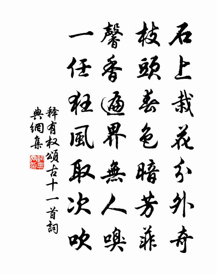 詩詞名句歷史字典書法欣賞書法字典國語詞典說文解字康熙字典古漢語字典標 題 作 者 詩 句 頌古十一首作者:釋有權 朝代:宋代頌古十一首原文石上栽花分外奇,枝頭春色暗芳菲。馨香遍界無人嗅,一任狂風取次吹。詩詞問答問:頌古十一首的作者是誰?答:釋有權問:頌古十一首寫於哪個朝代?答:宋代釋有權頌古十一首書法欣賞頌古十一首書法作品詩詞推薦豐都驛呈任子厚詩二首李流謙〔宋代〕書壞無全牘,衣濡有裂繒。倦梳晨起發,祗曲晝眠肱。客路行將了,家山喚得譍。焚香謝仟佛,宵夢已先憑。金沙台蘇軾〔宋代〕雨後東風漸轉和,扣門遷客一經過。王孫采地空珪璧,長者芳聲動薜蘿。正爾謫居懷北闕,聊同笑語說東坡。山林次韻漕使張守二首陳造〔宋代〕授書天佐漢,鼓篋客師韓。氣宇包溟渤,辭鋒凜莫乾。經綸股肱似,姓字齒牙寒。不作規隨起,誰令九鼎安。秋夜俞桂〔宋代〕月華如水淨無塵,千里相思總一心。絡緯籬邊吟不徹,做成秋意十分深。至楚懷慎漢公吳則禮〔宋代〕抱翁何許欲灌園,獨憐帆腹會孤掀。雙輪有蒲良未好,束帛加璧安足論。少日讀書守貧巷,異時簪筆登修門。相思觀潮項安世〔宋代〕張王偏宜月,雄豪更得秋。岸頭渾破膽,浪里有行舟。頌證道歌證道歌釋印肅〔宋代〕一超直入如來地,自是眾生不了利。行住坐臥總皆真,逐末興心成執滯。出火祀大辰十二首佚名〔宋代〕五運惟火,寔宗眾陽。宿壯用明,千載愈光。神保聿歸,安處火房。廳攸不作,炎圖永昌。送寒岩歸士徐凝〔唐代〕不掛絲纊衣,歸向寒岩棲。寒岩風雪夜,又過岩前溪。和參政丁侍郎從駕出獵宋庠〔宋代〕詔蹕承冬令,郊幾闢獰場。鉤陳來作衛,袀服正騰裝。表野千旌合,舒圍萬騎張。清塵風效職,捧轡日呈祥。寶畤錢塘潮圖胡仲弓〔宋代〕輕綃淡墨天冥冥,眼中似覺封西興。銀山大浪萬鼓過,海潮逆上江倒行。前年南遊此餞別,親友握手難為情。酒酣米玄暉陽春詞帖贊岳珂〔宋代〕予家有山林集,觀寶晉自製之詞,每不逮乎平日之文。豈句律之未工,疑用志之或分。偉筆力之扛鼎,得過庭之異以詩句詠梅林中笑破冰霜面方蒙仲〔宋代〕澹寂自天姿,逢人借顏色。一笑比河清,希仁太孤特。方海豐詩境樓分賦得春風釋圓悟〔宋代〕暖襲遊人陌上塵,不知花信幾番新。莫教吹到荼醾處,吹到荼醾是晚春。金丹陳以莊〔宋代〕鳳簫一去幾經年,古木青蘿鎖洞天。黠鬼不量曾竊藥,真人豈礙作飛仙。細看丹灶凝煙地,知有清朝應世賢。欲下和閱明妃傳趙希逢〔宋代〕青冢今成土一堆,嬌容埋玉恨難開。無端當日毛延壽,輕把毫端巧作媒。南山羅漢贊十六首黃庭堅〔宋代〕斑斑之獸本山林,升堂入室作輿衛。小僧奉施軍持水,弭耳來受救渴供。胸中猛虎自調服,是故異物成一家。我觀酬夢得比萱草見贈白居易〔唐代〕杜康能散悶,萱草解忘憂。借問萱逢杜,何如白見劉。老衰勝少夭,閒樂笑忙愁。試問同年內,何人得白頭。哭遂州蕭侍郎二十四韻(蕭浣)李商隱〔唐代〕遙作時多難,先令禍有源。初驚逐客議,旋駭黨人冤。密侍榮方入,司刑望愈尊。皆因優詔用,實有諫書存。苦霧秋晚題湖城驛池上亭劉禹錫〔唐代〕秋次池上館,林塘照南榮。塵衣紛未解,幽思浩已盈。風蓮墜故萼,露菊含晚英。恨為一夕客,愁聽晨雞鳴。名句推薦稱尊長,勿呼名。對尊長,勿見能。李毓秀《弟子規·出則弟》 深院鎖黃昏,陣陣芭蕉雨。歐陽修《生查子·含羞整翠鬟》 既熟慣,則更覺親密;既親密,則不免一時有求全之毀,不虞之隙。曹雪芹《紅樓夢·第五回》 瑤池阿母綺窗開,黃竹歌聲動地哀李商隱《瑤池》 生當復來歸,死當長相思。蘇武《留別妻》 聖人之為國也,觀俗立法則治,察國事本則宜。商鞅《商君書·算地》 寧添一斗,莫添一口。佚名《增廣賢文·上集》 話別情多聲欲戰,玉著痕留紅粉面。顧敻《玉樓春·拂水雙飛來去燕》 人學始知道,不學非自然。孟郊《勸學》 最愛蘆花經雨後,一蓬煙火飯魚船。林逋《詠秋江》