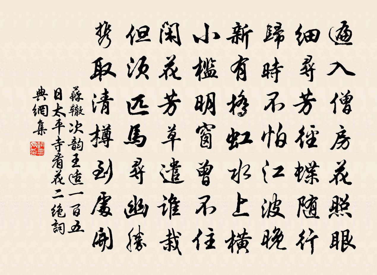 遍入僧房花照眼,細尋芳徑蝶隨行。歸時不怕江波晚,新有橋虹水上橫。