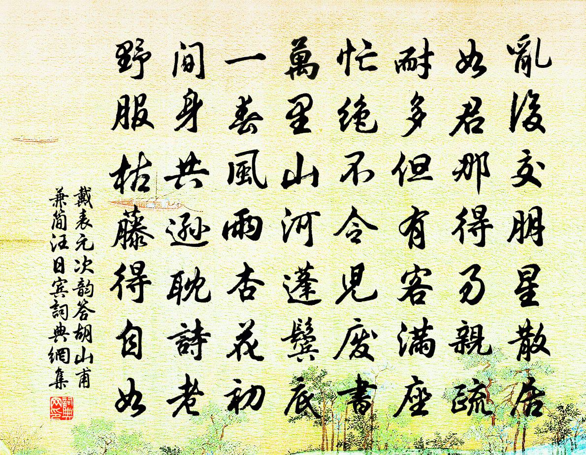 詩詞名句歷史字典書法欣賞書法字典國語詞典說文解字康熙字典古漢語字典標 題 作 者 詩 句 次韻答胡山甫兼簡汪日賓作者:戴表元 朝代:宋代次韻答胡山甫兼簡汪日賓原文亂後交朋星散居,如君那得易親疏。耐多但有客滿座,忙絕不令兒廢書。萬里山河蓬鬢底,一春風雨杏花初。間身共遜耽詩老,野服枯藤得自如。詩詞問答問:次韻答胡山甫兼簡汪日賓的作者是誰?答:戴表元問:次韻答胡山甫兼簡汪日賓寫於哪個朝代?答:宋代戴表元次韻答胡山甫兼簡汪日賓書法欣賞次韻答胡山甫兼簡汪日賓書法作品詩詞推薦金剛隨機無盡頌不受不貪分第二十八釋印肅〔宋代〕古今人易老,無異霜凋草。本根依舊青,不解尋元討。劉孺人輓詩葉適〔宋代〕嗃嗃當年女手縫,一家從此更雍雍。性安於善行無跡,兒自為銘筆有蹤。聞說湖清見龍首,還疑墓長羃雲峰。哀情次韻陳屯田途中所寄李覯〔宋代〕封豕長蛇戰嶺南,何人肉食不懷慙。只今唯有高眠好,風弄鬆聲水濺庵。田家三首張耒〔宋代〕野塘積水綠可染,舍南新柳齊如剪。去冬雪好麥穗長,今日雨晴初擇繭。東家饋黍西舍迎,連臂踏歌村市晚。婦騎寄題西昌嚴後山三教堂張埴〔宋代〕高風花吹斷溪橋笑,幾個廬山昏又曉。新開圖畫白鷗江,螭吻搖鬐到雲表。長廊晝永花煙青,參禪問道談詩聲。蒼丁端叔送牡丹以詩來用韻酬之陳傅良〔宋代〕客來談政已班班,況復書縢一再頒。亦欲頡頏相上下,不容分寸得躋攀。花猶河洛承平□,詩在黃陳輩行間。簿領南溪堰灘楊萬里〔宋代〕為愛溪流箭樣湍,戲拋亂石障清瀾。忽如亞父撞玉斗,又似仲尼鳴象環。整北移南教盡怒,從朝至午不知還。便饒暮春有感寄宋維員外李中〔唐代〕杜宇聲中老病心,此心無計駐光陰。西園雨過好花盡,南陌人稀芳草深。喧夢卻嫌鶯語老,伴吟惟怕月輪沈。明年牢落劉克莊〔宋代〕牢落吾何恨,先賢未免窮。寧為田舍子,不作國師公。螢影穿窗隙,蛩聲出壁中。殘書殊有味,讀到角吹終。依韻和武平苕霅二水梅堯臣〔宋代〕昔愛伊與洛,今逢苕與霅。南郭復西城,曉色明於甲。塵纓庶可濯,白鳥誰來狎。落日潭上歸,魚歌自相答。琴曲歌辭。湘妃劉長卿〔唐代〕帝子不可見,秋風來暮思。嬋娟湘江月,千載空蛾眉。訴衷情·小桃灼灼柳鬖鬖黃庭堅〔宋代〕小桃灼灼柳鬖鬖,春色滿江南。雨晴風暖煙淡,天氣正醺酣。山潑黛,水挼藍,翠相攙。歌樓酒旆,故故招人,權探春有感二首張耒〔宋代〕柳萼蒙茸待放綿,櫻桃新葉大如錢。深春冷落花殘後,寒食朦朧月淡天。獨坐每將詩作伴,遣愁安得酒如泉。傷心已卯老人生旦陳文蔚〔宋代〕今朝酒熟吾翁喜,又見生朝會鄰里。雖無盤饌羅膻勞,情話從容自嘉旨。人生富貴固足樂,惟有工年難得似。恬於病起釋文珦〔宋代〕臥病厭厭斷聞見,年頭未識春風面。今朝強起步晴光,傷心滿地殘梅片。次韻江子我病起朱翌〔宋代〕食不下咽當奈何,千金不惜聘秦和。則知有我聊示病,旁若無人正浩歌。薄雨過牆醒檻竹,西風吹暑下庭柯。但令題唐德明秀才玉立齋楊萬里〔宋代〕坡雲無竹令人俗,我雲俗人正累竹。玉立齋前一萬竿,能與主人相對寒。看竹喔詩筆生力,山童怪予遽忘食。不但徐州送江少卿蘇轍〔宋代〕夜雨泗河深,曉日輕舟發。帆開送客遠,城轉高台沒。居人永瞻望,歸意何倉卒。公來初無事,豐歲多牟麥。鈴閣郡中言懷寄西川蕭員外羊士諤〔唐代〕功名無力愧勤王,已近終南得草堂。身外盡歸天竺偈,腰間唯有會稽章。何時臘酒逢山客,可惜梅枝亞石床。歲晚虞美人蘇軾〔宋代〕歸心正似三春草。拭著萊衣小。橘懷幾日向翁開。懷祖已瞋文度、不歸來。禪心已斷人間愛。只有平交在。笑論瓜名句推薦使人有乍交之歡,不若使人無久處之厭。陳繼儒《小窗幽記·集醒篇》 磧里征人三十萬,一時回向月明看。李益《從軍北征》 父老得書知我在,小軒臨水為君開。蘇軾《送賈訥倅眉》 出入君懷袖,動搖微風發。班婕妤《怨歌行》 滿招損,謙受益佚名《尚書·虞書·大禹謨》 且莫思身外,長近尊前。周邦彥《滿庭芳·夏日溧水無想山作》 斜月照簾帷,憶君和夢稀。毛熙震《菩薩蠻·梨花滿院飄香雪》 鳥向檐上飛,雲從窗里出。吳均《山中雜詩》 秋夜訪秋士,先聞水上音。袁枚《夜過借園見主人坐月下吹笛》 蓬鬢哀吟長城下,不堪秋氣入金瘡。盧綸《逢病軍人》