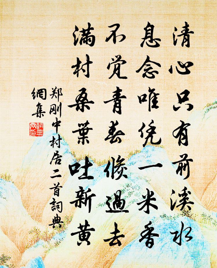 詩詞名句歷史字典書法欣賞書法字典國語詞典說文解字康熙字典古漢語字典標 題 作 者 詩 句 村居二首作者:鄭剛中 朝代:宋代村居二首原文清心只有前溪水,息念唯憑一米香。不覺青春倏過去,滿村桑葉吐新黃。詩詞問答問:村居二首的作者是誰?答:鄭剛中問:村居二首寫於哪個朝代?答:宋代鄭剛中村居二首書法欣賞村居二首書法作品詩詞推薦雨聲陸游〔宋代〕雨聲點滴朝復暮,中有詩人絕塵句。雲門鹹池渺千古,斷譜遺音此其緒。雨聲點滴夜不休,中有羈臣去國愁;九疑望州亭鼓山銘丁竦〔宋代〕鼓屴崱,峰頂特。窮島夷,頫封域。屏閩東,拱辰北。歲辛亥,帝司赤。竦紳烈,從陗陟。搴若華,揖瑤極。呵蜚送郎丞之桐城洪咨夔〔宋代〕江北江南雪意催,半酣椎起征餵桅。銳從猿鶴歸休去,剛被功名引調來。破虜檄傳淝水定,屯田疏上皖陂開。筆端和李十二舍人冬至日姚合〔唐代〕獻壽人皆慶,南山復北堂。從今千萬日,此日又初長。少年見青春王安石〔宋代〕少年見青春,萬物皆嫵媚。身雖不飲酒,樂與賓客醉。一從鬢上白,百不見可喜。心腸非故時,更覺日月駛。聞歡壬辰春上冢五首壽溪劉克莊〔宋代〕水如綬帶山如抱,畫手難摹一段奇。松下可澆三奠去,墓傍安用萬家為。虹來昂首寧非瑞,蛟徒無蹤若有知。丱角阮郎歸周紫芝〔宋代〕月欞疏影照嬋娟。閒臨小玉盤。棗花金釧出纖纖。棋聲敲夜寒。飛雹冷,水精圓。夜深人未眠。笑催爐獸暖衾鴛。早過漆林渡寄萬巨李白〔唐代〕西經大藍山,南來漆林渡。水色倒空青,林煙橫積素。漏流昔吞翕,沓浪競奔注。潭落天上星,龍開水中霧。嶢岩碧雞草堂呈劉後村宋慶之〔宋代〕斯文海內聲名闊,猶是乾淳一脈餘。須信昌黎曾得謗,可憐太史未成書。碧雞有地吟詩老,金馬無心待詔初。甚欲頌古二十一首釋心月〔宋代〕普濟把定,被龐公痛處一錐。直得左轉右側,前依後隨。笊籬提起處,相呼作舞詩。若言依樣畫貓兒,定把黃金鑄古意劉商〔唐代〕達曉寢衣冷,開帷霜露凝。風吹昨夜淚,一片枕前冰。上平江李侍郎生辰仲並〔宋代〕昔襦今褲雄藩守,佩玉峨冠近侍臣。十萬人家等蒙潤,三千風月政當仁。仙姿照坐桃如許,冷艷當檐梅一新。願比月中仙 賞月丘處機〔元代〕日色西沉,上高台、回觀天地寥廓。疏星隱現,空一輪明月,昭昭無著。皓然三界外,似百鍊、青銅鑒躍。處處恩一翦梅(送馮德英)韓淲〔宋代〕說著相思夢亦愁。芳草斜陽,春滿秦樓。樓前新綠水西流。一曲陽關,分付眉頭。多少風流事已休。紛薄香濃,怕素梅 十四王冕〔元代〕朔風吹冷過山城,巾子峰頭雪未晴。十載西湖閒客夢,夜來山月最分明。望夫石孟郊〔唐代〕望夫石,夫不來兮江水碧。行人悠悠朝與暮,千年萬年色如故。宜興山房十首李曾伯〔宋代〕曉起爐煙一縷清,梵音繚繞檻軒行。須臾日上松梢了,又聽齋鐘相齋鳴。水調歌頭(游三洞)曹冠〔宋代〕我本方壺客,飄逸離凡塵。胸中萬卷,談笑揮翰墨通神。不慕巢由隱跡,不羨皋夔功業,出處兩無心。坦蕩靈台淨喜翁文堯員外病起黃滔〔唐代〕衛羊車懸,長卿駟馬姿。天嫌太端正,神乃減風儀。飲冰俾消渴,斷谷皆清羸。越僧夸艾炷,秦女隔花枝。自能論建安遣興陸游〔宋代〕刺虎騰身萬目前,白袍濺血尚依然。聖時未用征遼將,虛老龍門一少年。名句推薦君王遊樂萬機輕,一曲霓裳四海兵。李約《過華清宮》 香臉半開嬌旖旎。當庭際。玉人浴出新妝洗。李清照《漁家傲·雪裡已知春信至》 採菊東籬下,悠然見南山。陶淵明《飲酒·其五》 重陽過後,西風漸緊,庭樹葉紛紛。晏殊《少年游·重陽過後》 一往情深深幾許?深山夕照深秋雨。納蘭性德《蝶戀花·出塞》 路逢險處須迴避,事到臨頭不自由。佚名《增廣賢文·上集》 滄海月明珠有淚,藍田日暖玉生煙。李商隱《錦瑟》 群臣見素,則大君不蔽矣。韓非及後人《韓非子·二柄》 少小雖非投筆吏,論功還欲請長纓。祖詠《望薊門》 亭皋木葉下,隴首秋雲飛柳惲《搗衣詩》
