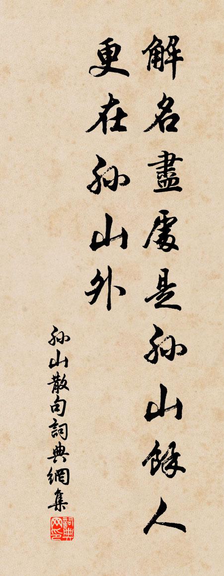 詩詞名句歷史字典書法欣賞書法字典國語詞典說文解字康熙字典古漢語字典標 題 作 者 詩 句 句作者:孫山 朝代:宋代句原文解名盡處是孫山,餘人更在孫山外。詩詞問答問:句的作者是誰?答:孫山問:句寫於哪個朝代?答:宋代問:句是什麼體裁?答:句孫山句書法欣賞句書法作品詩詞推薦屏風李商隱〔唐代〕六曲連環接翠帷,高樓半夜酒醒時。掩燈遮霧密如此,雨落月明兩不知。贈三侍御常建〔唐代〕高山臨大澤,正月蘆花乾。陽色薰兩崖,不改青松寒。士賢守孤貞,古來皆共難。明君錯甚(任)才,台上飛三鸞貽李南平殷文圭〔唐代〕紫殿西頭月欲斜,曾草臨淮上相麻。潤筆已曾經奏謝,更飛章句問張華。平原郡王南園詩二十一首寒碧姜特立〔宋代〕千層山色參空碧,十里波光照眼寒。六月火雲橫障日,好來此處憑欄乾。又和曾秘丞見贈王禹偁〔宋代〕非才誤受帝恩深,報國空存一片心。命薄任從官進退,道孤難與眾浮沉。日邊信斷無歸夢,滁上公餘且醉吟。勞寄寓事洪咨夔〔宋代〕飽鶩避弓橫渚,驚鱗透網平波。一段春光搖曳,幾雙靜眼摩挲。晚春韓維〔宋代〕春暉東去月如弦,卻拂凝埃敞北軒。幾曲雲屏空白晝,一簾花雨自黃昏。庭蕪碧合陰蟲息,窗樹紅稀斗雀喧。細憶和馮叔炎梅桂二首釋道璨〔宋代〕風露透枝葉,團團翠滿坡。但教秋思足,不必月明多。騷在誰招隱,山空自放歌。故家射科手,折取莫蹉跎。同泰寺楊備〔宋代〕佛事莊嚴國力疲,照天金碧倚欄危。沉檀爐上煙雲合,恰似當年煨燼時。山居雜詩九十首曹勛〔宋代〕高原收菽麥,下田插禾秧。田頭與地尾,一一意所量。躬耕辨好怯,擇種均豐荒。所以終歲間,食米不及糠。送碧香酒與趙明叔教授蘇軾〔宋代〕聞君有婦賢且廉,勸君慎勿為楚相。不羨紫駝分御食,自遣赤腳沽村釀。嗟君老狂不知愧,更吟醜婦惡嘲謗。諸生和陳御帶見貽曹勛〔宋代〕漢室文章遠業成,斗南英氣為時生。新兼帶插嚴天仗,夙展韜鈐衛帝營。四塞羌戎知號令,五軍貔虎畏威名。中興窗前古槐二首裘萬頃〔宋代〕密葉繁陰畫不成,捲簾雙眼為渠明。人間炎熱無來處,贏得軒窗分外清。同玉真公主過大哥山池李隆基〔唐代〕地有招賢處,人傳樂善名。鶩池臨九達,龍岫對層城。桂月先秋冷,蘋風向晚清。鳳樓遙可見,仿佛玉簫聲。雪香亭雜詠元好問〔金代〕落日青山一片愁,大河東注不還流。若為長得熙春在,時上高層望宋州。 二風詩亂風詩五篇至荒元結〔唐代〕國有世謨,仁信勤歟。王實惛荒,終亡此乎。焉有力恣諂惑,而不亡其國?嗚呼亡王,忍為此心!敢正亡王,永為偈七首釋允韶〔宋代〕籬畔黃花含曉露,庭前丹桂噴秋香。明明此物非他物,脫體承當不廝當。泉布吟邵雍〔宋代〕名為泉布者,無足走人間。善發難言口,能開不笑顏。償逋小續命,賙急大還丹。唯有商山老,非乾買得閒。趣成父寄酒趙蕃〔宋代〕如聞已熟遂初泉,日日江頭數過船。梅嶺望來能止渴,麴車逢處解流涎。故人海內忘形少,風味杯中到手賢。遙想浣溪沙晏殊〔宋代〕綠葉紅花媚曉煙。黃蜂金蕊欲披蓮。水風深處懶回船。可惜異香珠箔外,不辭清唱玉尊前。使星歸覲九重天。名句推薦股肱體合,則四海和平;上下猜貳,則封疆幅裂。姚察、姚思廉《梁書·列傳·卷五十六》 日晚江南望江北,寒鴉飛盡水悠悠。嚴維《丹陽送韋參軍》 還始覺、留情緣眼,寬頻因春。吳文英《渡江雲三犯·西湖清明》 千里江山昨夢非,轉眼秋光如許。文徵明《念奴嬌·中秋對月》 凡彼禍難也,先者恆凶,後者恆吉。佚名《黃帝四經·十大經·雌雄節》 故人具雞黍,邀我至田家。孟浩然《過故人莊》 雨中黃葉樹,燈下白頭人。司空曙《喜外弟盧綸見宿》 長袖善舞,多錢善賈。韓非及後人《韓非子·五蠹》 秋色雁聲愁幾許,都在斜陽。吳文英《浪淘沙·九日從吳見山覓酒》 天意憐幽草,人間重晚晴。李商隱《晚晴》
