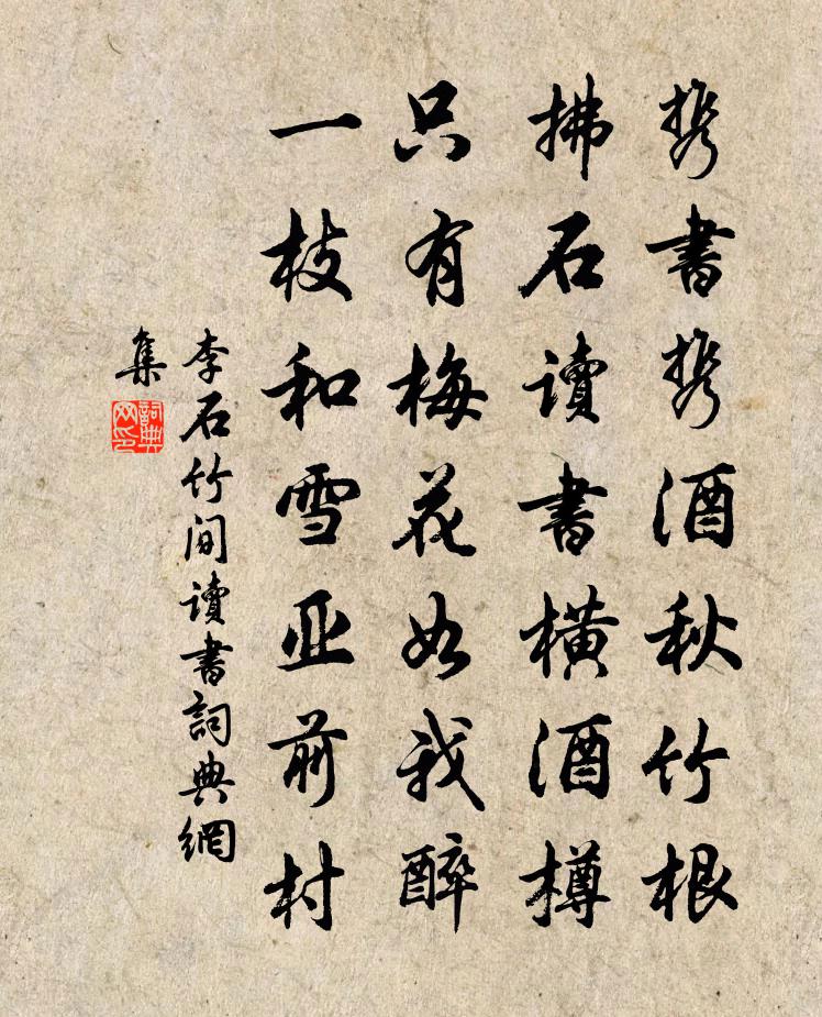 詩詞名句歷史字典書法欣賞書法字典國語詞典說文解字康熙字典古漢語字典標 題 作 者 詩 句 竹間讀書作者:李石 朝代:宋代竹間讀書原文攜書攜酒秋竹根,拂石讀書橫酒樽。只有梅花如我醉,一枝和雪亞前村。詩詞問答問:竹間讀書的作者是誰?答:李石問:竹間讀書寫於哪個朝代?答:宋代李石竹間讀書書法欣賞竹間讀書書法作品詩詞推薦真珠花楊巽齋〔宋代〕累累花發映庭除,柳帶榆錢總不如。一任春風吹滿地,幽人步履自虛徐。菩薩蠻范成大〔宋代〕小軒今日開窗了。揉藍染碧綠階草。檐佩可憐風。杏梢煙雨紅。飄零歡事少。鬢點吳霜早。天色不愁人。眼前無限如岳上人求賦剡鹿苑寺一覽閣陳著〔宋代〕層檐危鎮梵王宮,景物都歸兩碧瞳。九萬里風斯在下,三千世界本來空。詩懷浩浩晴瀾外,人事滔滔流水東。凝佇暮花天陳亮〔宋代〕天意微慳,春工多裕,長須末後殷勤。骨瘦挽先,肌韻恰好,花頭徑尺徐陳。紅黃粉紫,更牛家、姚魏為真。留幾偈頌一百三十六首釋惟一〔宋代〕秋風清,秋月白,秋水共長天一色。不是心外境,亦非目前法。可中一見便知歸,平步廣寒攀桂枝。次韻翁士特題行閒軒李彌遜〔宋代〕寒音珊珊落回溪,修竹似與長風期。虛聲帆影住來地,幽絕自有閒人知。失婢白居易〔唐代〕宅院小牆庳,坊門帖榜遲。舊恩慚自薄,前事悔難追。籠鳥無常主,風花不戀枝。今宵在何處,唯有月明知。初夏倚春望六祖寺趙汝回〔宋代〕柳絮兼花片,舞風湘水濱。濃嵐如細雨,初夏是殘春。鳥度山家曲,泉清佛界塵。年衰眠易醒,歸夢不能夫。回鄉偶書二首賀知章〔唐代〕少小離家老大回,鄉音無改鬢毛衰。(無改 一作:未改/難改)兒童相見不相識,笑問客從何處來。離別家鄉歲送姜君玉赴省試劉宰〔宋代〕樽酒論文弱冠前,交情老去只依然。久荒三徑無來客,細撥青燈話昔年。少日功名誰汗簡,舊遊江海半華顛。君行自巴東舟行經瞿唐峽,登巫山最高峰,晚還題壁李白〔唐代〕江行幾千里,海月十五圓。始經瞿塘峽,遂步巫山巔。巫山高不窮,巴國盡所歷。日邊攀垂蘿,霞外倚穹石。飛步踏莎行仲殊〔宋代〕德感元精,岳方孕秀。才明淵智神兼授。飛鳴早應舜韶來,五符千騎難淹久。熊夢開祥,龜文獻壽。龍香卷霧搖東清明後二日同鄰幾景仁次道中首興宗完秉國如司馬光〔宋代〕寂寥清明後,余春已無多。間軒富佳致,不惜載酒過。水木晚尤秀,風煙晴更和。臨樽不盡醉,奈此芳菲何。江城子李綱〔宋代〕去年九日在衡陽。滿林霜。俯瀟湘。回雁峰頭,依約雁南翔。遙想茱萸方遍插,唯少我,一枝香。今年佳節幸相將臨江仙(陳守美任)陳韡〔宋代〕三十四年台榭,八千餘里江津。去時楊柳正輕顰。重來桃李少,不似舊時春。風掃半空煙雨,玉虹翠浪如新。可憐奧村晚望黃公度〔宋代〕山逐寒雲斷,天隨暮靄低。稻畦迷上下,樵逕自東西。故國存書劍,他鄉尚鼓鼙。涓埃期補報,未敢卜幽棲。寇參軍九日惠詩以左馮翊趙監所遺玉液一壺並強至〔宋代〕久傍嚴公趨玉帳,近蒙賀監解金龜。一壺分助登高飲,客宦長安共此時。白雲庵四首逍遙子〔宋代〕蟻窠得意從渠計,螳翳忘言息我機。寒盡山庵無曆日,野花啼鳥又春歸。師永錫家青神喜紅花堰興作詩因次韻晁公溯〔宋代〕終歲辛勤農在野,邊頭亦聞軍茇舍。指揮郡縣催輓輸,兼作葦蒲收{上厭下木}柘。諸將但思弧矢利,教我力耕誰蝶戀花 壽陳北山程文海〔元代〕月掛新年弓未彀。璧水溶溶,已覺春光透。國子先生松竹友。一尊請為斯文壽。況是雪中萱樹茂。華萼相輝,天地名句推薦文豈有常體,但以有體爲常李大師、李延壽《南史·列傳·卷三十二》 池上柳依依,柳邊人掩扉。左緯《春晚》 晨昏滾滾水東流,今古悠悠日西墜。錢福《明日歌》 應傾謝女珠璣篋,盡寫檀郎錦繡篇。羅隱《七夕》 臘盡愁難盡,春歸人未歸。馮夢龍《喻世明言·卷一》 烽火照西京,心中自不平。楊炯《從軍行》 晻靄寒氛萬里凝,闌乾陰崖千丈冰。岑參《天山雪歌送蕭治歸京》 嚴妝欲罷囀黃鸝,飛上萬年枝。和凝《喜遷鶯·曉月墜》 相顧無相識,長歌懷採薇。王績《野望》 賈傅松醪酒,秋來美更香。杜牧《送薛種游湖南》