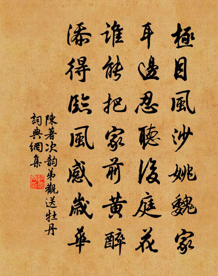 詩詞名句歷史字典書法欣賞書法字典國語詞典說文解字康熙字典古漢語字典標 題 作 者 詩 句 次韻弟觀送牡丹作者:陳著 朝代:宋代次韻弟觀送牡丹原文極目風沙姚魏家,耳邊忍聽後庭花。誰能把家前黃醉,添得臨風感歲華。詩詞問答問:次韻弟觀送牡丹的作者是誰?答:陳著問:次韻弟觀送牡丹寫於哪個朝代?答:宋代陳著次韻弟觀送牡丹書法欣賞次韻弟觀送牡丹書法作品詩詞推薦筠庵晚睡三首楊萬里〔宋代〕一戶元無白板遮,兩窗新染藕絲紗。竹床品字排三隻,睡殺山風醉殺霞。送鄭祠部陳師道〔宋代〕持節還家未白頭,有親八十更何求。又須急詔登天去,不為寒鄉盡歲留。四著儒冠甘送老,數經奇運得銷憂。擬登和孫端叟蠶首十五首桑筥梅堯臣〔宋代〕采采向桑郊,盈盈自持筥。掛鈎帶月往,稚葉和煙貯。一心恐蠶飢,搔首促儔侶。到家傾嫩綠,刀凡為{左口右父王希武通判輓詞范成大〔宋代〕事契從先世,姻聯亦近親。遽為重壤去,淒斷十年鄰。物理真飄忽,家聲正隱轔。門闌可三戟,何止駟車雲。思歸樂石延年〔宋代〕匹馬驅馳事薄游,異鄉觸目動牽愁。春禽勸我歸休去,爭奈功名未放休。巫山一段雲馬鈺〔元代〕洞裡乾刊異,悠然看不窮。虎龍*入白雲中。不見往來*。奼女嬰兒忒*。爭把崑崙頂戴。瓊瑤撞透出靈胎。跨鶴寓寺八首張耒〔宋代〕道人鍾梵久寂寞,倦客弭車聊靜便。我亦云山閒衲子,平生香火舊因緣。唐鐃歌鼓吹曲十二篇。突厥之大古夷狄莫強…鐵山碎第八柳宗元〔唐代〕鐵山碎,大漠舒。二虜勁,連穹廬。背北海,專坤隅。歲來侵邊,或傅於都。天子命元帥,奮其雄圖。破定襄,降九日永叔長文原甫景仁鄰幾持國過飲梅堯臣〔宋代〕秋堂雨更靜,佳菊粲粲芳。置酒延群公,掇英浮新黃。心猶慕淵明,歸來歸柴桑。莫問車馬之,去跡亂康莊。失調名佚名〔宋代〕花開時節連風雨。賀新郎劉德秀〔宋代〕雨沐秋榮薄。瑩湖光、琉璃千頃,浪平如削。步繞湖邊佳絕處,時涌瓊樓珠閣。記一一、經行皆昨。十萬人家空翠黃魚杜甫〔唐代〕日見巴東峽,黃魚出浪新。脂膏兼飼犬,長大不容身。筒桶相沿久,風雷肯為神。泥沙卷涎沫,回首怪龍鱗。過零丁洋文天祥〔宋代〕辛苦遭逢起一經,干戈寥落四周星。山河破碎風飄絮,身世浮沉雨打萍。惶恐灘頭說惶恐,零丁洋里嘆零丁。人生送河南陸少府錢起〔唐代〕雲間陸生美且奇,銀章朱綬映金羈。自料抱材將致遠,寧嗟趨府暫牽卑。東城社日催巢燕,上苑秋聲散御梨。朝夕五郡蘇轍〔宋代〕蜀人不信秦川好,食蔗從梢未及甘。當道沙塵類河北,依山水竹似江南。觀形隨阜飲溪鹿,雲氣侵山食葉蠶。猶有鷓鴣天史達祖〔宋代〕搭柳闌乾倚佇頻。杏簾胡蝶繡床春。十年花骨東風淚,幾點螺香素壁塵。簫外月,夢中雲。秦樓楚殿可憐身。新愁歸途轎中讀參寥詩楊萬里〔宋代〕車中無作惟生睡,卷里何佳卻勝閒。會意貪看三五句,回頭悔失數重山。夜過鑑湖用前韻書所見釋寶曇〔宋代〕湖光晚作鏡樣平,寂無人聲唯櫓聲。群峰倒影不可辨,新月半鉤如許情。斷蓬散作鳧雁過,漁火靜入江天明。移舟真人王安石〔宋代〕予常廢值真人,廢能 * 而廢寧。能納穢若淨,能易膻使馨。能解身赫赫,能逆如冥冥。日唯汝心攖,而汝耳目熒漫興 其十王冕〔元代〕撤幕愁歸燕,頹垣警睡龍。魚聲飛玉署,花夢破橘窗。紫詔傳三省,黃巾出兩江。何時舞乾羽?盡使有苗降。名句推薦雲淡風輕近午天,傍花隨柳過前川。程顥《春日偶成·雲淡風輕近午天》 信人莫若信己,防人毋存幸念。來俊臣《羅織經·閱人卷第一》 書當快意讀易盡,客有可人期不來。陳師道《絕句·書當快意讀易盡》 狂風吹我心,西掛鹹陽樹。李白《金鄉送韋八之西京》 我居北海君南海,寄雁傳書謝不能。黃庭堅《寄黃幾復》 綠雲擾擾,梳曉鬟也;杜牧《阿房宮賦》 軍氣橫大荒,戰酣日將入。王昌齡《從軍行二首》 想得此時情切,淚沾紅袖黦。韋莊《應天長·別來半歲音書絕》 其交也以道,其接也以禮,斯孔子受之矣。孟子《孟子·萬章章句下·第四節》 不知而自以為知,百禍之宗也。呂不韋《呂氏春秋·覽·有始覽》