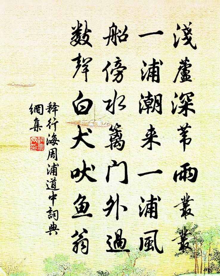 詩詞名句歷史字典書法欣賞書法字典國語詞典說文解字康熙字典古漢語字典標 題 作 者 詩 句 周浦道中作者:釋行海 朝代:宋代周浦道中原文淺蘆深葦雨叢叢,一浦潮來一浦風。船傍水籬門外過,數聲白犬吠魚翁。詩詞問答問:周浦道中的作者是誰?答:釋行海問:周浦道中寫於哪個朝代?答:宋代釋行海周浦道中書法欣賞周浦道中書法作品詩詞推薦暮秋遣興陸游〔宋代〕平生南地慣羈游,放浪常同不繫舟。鼉作夜風經沌口,鸛鳴秋雨宿杭頭。方傾意氣輕秦俠,俄困悲傷類楚囚。買屋送除景說歸三衢高斯得〔宋代〕秋風吐商氣,庭樹慽以飛。美人悼時節,去意不可鞿。朋陰傲排盪,晨光弄熹微。靈修豈敢怨,浩蕩終難依。岐分送唐介南遷五首謝景初〔宋代〕身任言責地,眼見公路埋。胡寧包心顏,踐履天了階。言出說隨至,吏送南海涯。一臣不足惜,喋血狽與豺。寄李叔器兼寄毛伯明張王臣康叔臨三首趙蕃〔宋代〕春水滿時春草生,春風日日上江亭。苹花採得從誰寄,空送沅湘入洞庭。辛酉大雪戲成二詩以千山鳥飛絕萬逕人蹤滅為周麟之〔宋代〕松桂亦華顛,瓦石背玉表,造物不作難,夜半月出皎。書窗互照映,翁牖驚易曉。舉頭忽彌望,萬里絕飛鳥。和寄問劉白 時夢得與樂天方舟西上。白居易〔唐代〕正與劉夢得,醉笑大開口。適值此詩來,歡喜君知否。遂令高卷幕,兼遣重添酒。起望會稽雲,東南一回首。愛君西村暮歸陸游〔宋代〕天氣清和修禊後,土風淳古結繩前。村村陂足分秧水,戶戶門通入郭船。亭障盜消常息鼓,坊場酒賤不論錢。行人花犯 題步障亭韓奕〔元代〕海棠開,誰家亭館,依然舊標緻。彩雲深處。有半濕青紅,畫闌雕砌。繁英密蕊重重樹。望中迷數里。似蜀錦、張靈龜石陳岩〔宋代〕巧石排成五總龜,人間無事不前知。如今已自靈於物,還記泥中曳尾時。庭橘孟浩然〔唐代〕明發覽群物,萬木何陰森。凝霜漸漸水,庭橘似懸金。女伴爭攀摘,摘窺礙葉深。並生憐共蒂,相示感同心。骨刺與荀中書別詩鮑照〔南北朝〕勞舟厭長浪。疲斾倦行風。連翩感孤志。契闊傷賤躬。親交篤離愛。眷戀置酒終。敷文勉征念。發藻慰愁容。思君惜分飛(九日)袁去華〔宋代〕平日悲秋今已老。細看秋光自好。風緊寒生早。漫將短髮還吹帽。寂寞東籬人不到。只有淵明醉倒。一笑留殘照。送愚卿兼簡魯卿卓卿趙蕃〔宋代〕逢人盡道為官去,為訪名山只有君。屨底沖殘大仰雪,筆頭帶得祝融雲。區區自誓王逸少,歷歷臥遊宗少文。歸見次劉曉窗九日韻十首楊公遠〔宋代〕西風搖落雁南飛,黃葉深深擁竹扉。佳節只消拚酩酊,牛山何事淚沾衣。送道人歸華陽周文璞〔宋代〕山中無酒禁,戶戶有松醪。旋汲泉炊飯,多挑筍助庖。天燈將出現,野月未能高。憶我初游日,先將石洞敲。雨中對後檐叢竹崔元翰〔唐代〕含風搖硯水,帶雨拂牆衣。乍似秋江上,漁家半掩扉。頌古四十五首釋慧遠〔宋代〕神前撥帳問西來,直截當機指酒台。赤體袒肩頭面禮,禍從天降不生災。沁園春(丙午壽常丞叔)李曾伯〔宋代〕大疏歸來,小阮適閒,喜同此時。問垂弧歷載,幾番遙祝,舉觴華旦,相會良希。頌以松椿,酌之椒柏,預卜明年寄胡明仲朱翌〔宋代〕尺一催公想疾驅,盛傳今已過羌廬。紛紛眼底何時定,鬱郁江南更久居。陛下不防高枕臥,先生來草射聊書。銅駝重送文同〔宋代〕燕尾歸{舶白加王}正穩,鴨頭春水方深。不得同搖楚棹,與君齊到山陰。名句推薦江燕話歸成曉別,水花紅減似春休。西風梧井葉先愁。吳文英《浣溪沙·秋情》 陶令不知何處去, 桃花源里可耕田 * 《七律·登廬山》 茶為累也,亦猶人參。陸羽《茶經·一之源》 人生得意須盡歡,莫使金樽空對月。李白《將進酒》 莫信直中直,須防仁不仁。佚名《增廣賢文·上集》 時見歸村人,沙行渡頭歇。孟浩然《秋登蘭山寄張五》 棠梨花映白楊樹,儘是死生別離處。白居易《寒食野望吟》 事雖小,勿擅為。苟擅為,子道虧。李毓秀《弟子規·入則孝》 千載休談南渡錯,當時自怕中原復。文徵明《滿江紅·拂拭殘碑》 君不見,高堂明鏡悲白髮,朝如青絲暮成雪。李白《將進酒》