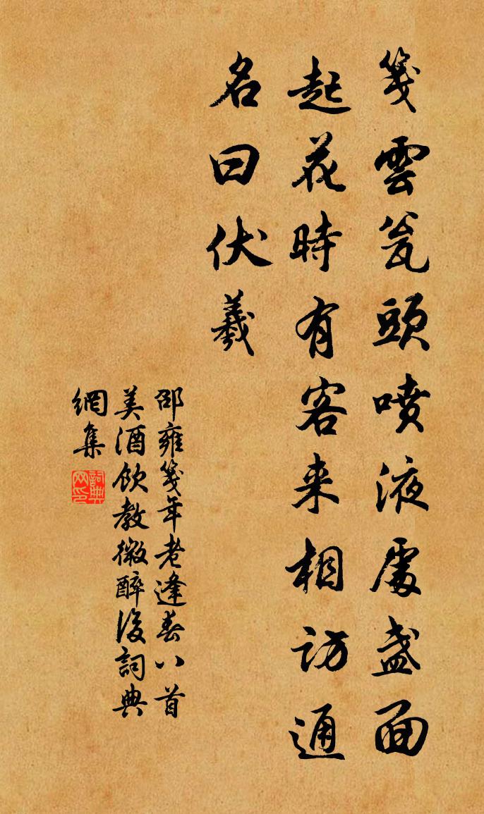 詩詞名句歷史字典書法欣賞書法字典國語詞典說文解字康熙字典古漢語字典標 題 作 者 詩 句 箋年老逢春八首美酒飲教微醉後作者:邵雍 朝代:宋代原文箋云:瓮頭噴液處,盞面起花時。有客來相訪,通名曰伏羲。詩詞問答問:《箋年老逢春八首美酒飲教微醉後》的作者是誰?答:邵雍問:該詩寫於哪個朝代?答:宋代書法欣賞箋年老逢春八首美酒飲教微醉後書法作品詩詞推薦落梅慢/落梅佚名〔宋代〕帶煙和雪,繁枝澹佇,誰將粉融酥滴。疏枝冷蕊厭群芳,年年常占春色。江路溪橋謾倒,裊裊風中無力。暗香浮動孤雁舒岳祥〔宋代〕憂心悄悄睡示能,開門看月一片冰。竅木相磨作鬼語,凍星入牖如螢青。孤雁哀號向何處,老夫掩耳不欲聽。爾從偈頌七十一首釋了惠〔宋代〕諸佛日日降生,聖人時時出現。與大地群生,同一耳聞,同一眼見,同此一心,同此一念。共樂太平時,大家呈笑庭中初植松桂,魯望偶題,奉和次韻皮日休〔唐代〕毿毿綠髮垂輕露,獵獵丹華動細風。恰似青童君欲會,儼然相向立庭中。即事五首王安石〔宋代〕幽棲地僻經過少,鍾梵聲中掩竹門。唯有多情枝上雪,暗香浮動月黃昏。茶山詩袁高〔唐代〕禹貢通遠俗,所圖在安人。後王失其本,職吏不敢陳。亦有奸佞者,因茲欲求伸。動生千金費,日使萬姓貧。我來雜曲歌辭渡遼水王建〔唐代〕渡遼水,此去鹹陽五千里。來時父母知隔生,重著衣裳如送死。亦有白骨歸鹹陽,營家各與題本鄉。身在應無回渡己卯歲除文天祥〔宋代〕歲除破衣裳,夜半刺針線。遊子長夜思,佳人不可見。草枯稚驢吼,燈暗飢鼠現。深室閉星斗,輕裘臥風霰。大化落梅胡仲弓〔宋代〕南枝不與北枝同,及早開時及早空。莫笑北枝開較晚,前頭畢竟有春風。七寶玲瓏 繼重陽韻馬鈺〔元代〕至愚至魯,怎曉妙中玄。便再拜、告風仙。口訣金身長丈六,二十八宿會聖賢。此理方知合自然。坎虎離龍,蟠繞同次道游相國寺買得翠玉罌一枚梅堯臣〔宋代〕古寺老柏下,叟貨翠玉罌。獸足面以立,瓜腹肩而平。虛能一勺容,色與藍水並。我獨何為者,忽見目以驚。家無次韻宋尚書山居虛靜堂方岳〔宋代〕世事鷗忘句肯卑,雲深料理舊花枝。了無一鳥傳幽意,只對青山自解頤。有感嚴羽〔宋代〕誤喜殘胡滅,那知患更長。黃雲新戰路,白骨舊沙場。巴蜀連年哭,江淮幾郡瘡?襄陽根本地,回首一悲傷。王文孺臞庵程敦厚〔宋代〕壁上煙蘿子,窗前鴻素書。短籬開窈窕,嫩竹轉扶疏。世事霜前葉,聲名澗底樗。柴桑陶靖節,日暮荷歸鋤。臨江仙(會黃魁)洪适〔宋代〕北斗南頭雲送喜,人間快睹魁星。向來平步到蓬瀛。如何天上客,來佐海邊城。方伯娛賓香作穗,風隨歌扇涼生。寄江陵王少府方乾〔唐代〕分手頻曾變寒暑,迢迢遠意各何如。波濤一阻兩鄉夢,歲月無過雙鯉魚。吟處落花藏筆硯,睡時斜雨濕圖書。此來讀太白詩一首和竹溪劉克莊〔宋代〕翰林萬里出峨嵋,曾受開元帝異知。只道高爺能毀鬲,無端環子亦嗔痴。空傳飛燕當時句,難覓騎鯨以後詩。的是曾元恕累日不相見以詩垂寄依韻和答強至〔宋代〕丈夫收功名,要在少壯時。今予四十強,才短良時遺。俯首入掾曹,所託真一枝。動靜系他人,何異馬受縻。事業官舍閒題白居易〔唐代〕職散優閒地,身慵老大時。送春唯有酒,銷日不過棋。祿米獐牙稻,園蔬鴨腳葵。飽餐仍晏起,餘暇弄龜兒。[龜和李太白把酒問明月歌陳普〔宋代〕人生能幾月圓時,歌之舞之復蹈之。月為一人我成三,更遣青州從事相追隨。四人好在都無闕,相勸相酬到明發。名句推薦清談可以飽,夢想接無由。韓愈《洞庭湖阻風贈張十一署·時自陽山徙掾江陵》 盡做舊愁都忘卻,新愁何處著王庭筠《謁金門·雙喜鵲》 貧居往往無煙火,不獨明朝為子推。孟雲卿《寒食》 清風徐來,水波不興。蘇軾《前赤壁賦》 山無陵,江水為竭。佚名《上邪》 漢帝重阿嬌,貯之黃金屋。李白《妾薄命》 日入群動息,歸鳥趨林鳴陶淵明《飲酒·七》 落花狼藉酒闌珊,笙歌醉夢間。李煜《阮郎歸·呈鄭王十二弟》 千淘萬漉雖辛苦,吹盡狂沙始到金。劉禹錫《浪淘沙九首》 出必告,反必面。居有常,業無變。李毓秀《弟子規·入則孝》