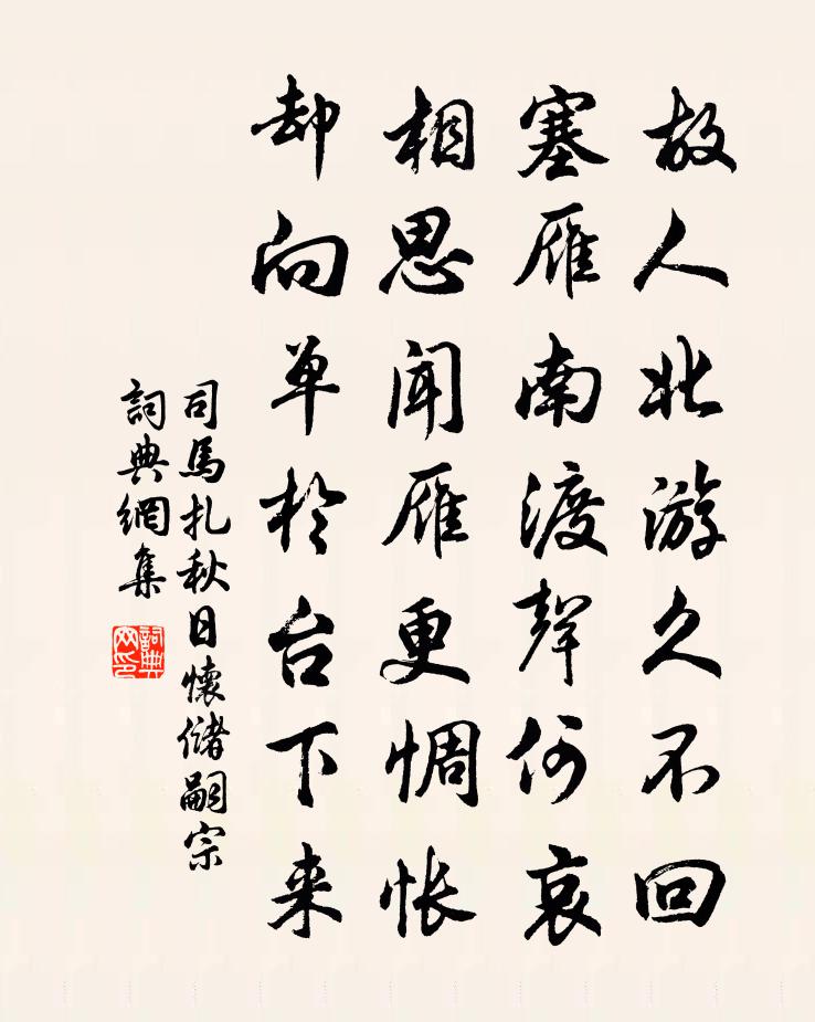 詩詞名句歷史字典書法欣賞書法字典國語詞典說文解字康熙字典古漢語字典標 題 作 者 詩 句 秋日懷儲嗣宗作者:司馬扎 朝代:唐代秋日懷儲嗣宗原文故人北游久不回,塞雁南渡聲何哀。相思聞雁更惆悵,卻向單于台下來。詩詞問答問:秋日懷儲嗣宗的作者是誰?答:司馬扎問:秋日懷儲嗣宗寫於哪個朝代?答:唐代問:秋日懷儲嗣宗是什麼體裁?答:七絕司馬扎秋日懷儲嗣宗書法欣賞秋日懷儲嗣宗書法作品注釋全唐詩:卷596-35詩詞推薦晚投大雲峰二首李彌遜〔宋代〕高樹風生晚徑秋,平沙無日下鳧鷗。野航邀月渡溪北,古寺僧歸鍾殷樓。寓軒曾幾〔宋代〕故國例卜宅,他鄉多惜居。短長三萬日,何處是吾廬。緣識宋太宗〔宋代〕眼識諸緣相,行持妙法存。明開邪見性,不見有無根。次蕭饒州韻仇遠〔宋代〕寓舍已三遷,閒官又一年。酒杯時樂聖,茶碗欲通仙。愛筍從穿壁,澆花自汲泉。誰能問前代,劉蹶與秦顛。祝英台近(次篔房韻)李演〔宋代〕采芳苹,縈去櫓。歸步翠微雨。柳色如波,縈恨滿煙浦。東君若是多情,未應花老,心已在、綠成陰處。困無語。賦得臨江遲來客公乘億〔唐代〕江上晚沈沈,煙波一望深。向來殊未至,何處擬相尋。柳結重重眼,萍翻寸寸心。暮山期共眺,寒渚待同臨。北去龍州與韓將軍夜會項斯〔唐代〕庭綠草纖纖,邊州白露沾。別歌緣劍起,客淚是愁添。見月鵲啼樹,避風雲滿簾。將軍盡尊酒,樓上賦星占。寄羅機宜竟陵督捕六首項安世〔宋代〕共是天家赤子,可憐地下遊魂。去草固嫌滋蔓,遏流須藕澄冰。秋晚雜興陸游〔宋代〕渺渺風煙接小江,牛頭山色滿蓬窗。門前西走錢塘路,也有閒人似老龐。越溪懷古施肩吾〔唐代〕憶昔西施人未求,浣紗曾向此溪頭。一朝得侍君王側,不見玉顏空水流。扃岫為張支使作二首姜特立〔宋代〕老去林泉屬我,時來軒冕輸君。正好南冥運翼,未用北山移文。送權先輩歸覲信安趙嘏〔唐代〕衣彩獨歸去,一枝蘭更香。馬嘶芳草渡,門掩百花塘。野色亭台晚,灘聲枕簟涼。小齋松島上,重葉覆書堂。禪悅二首·其二張問陶〔清代〕門庭清妙即禪關,枉費黃金去買山。只要心光如滿月,在家還比出家閒。禹碑劉贄〔宋代〕壇峙 * 石,溪忘夏禹碑。物神人所貴,世事遠誰知。丁亥冬大雪十數作鄧清曠以苦寒吟見寄艾性夫〔宋代〕十雪勢未已,一科天積陰。背風留更久,入夜落偏深。禾稼連冰柱,天花幻玉林。遙憐五峰老,尚寄苦寒吟。病後夏初雜書近況十首方回〔宋代〕妙年剛謂世無愁,汗漫猖狂萬里游。夢裡講經天竺國,醉中橫笛岳陽樓。散花女已無蹤矣,老樹精今尚在不。咋舌憶山中寄舊友錢起〔唐代〕數歲白雲里,與君同採薇。樹深煙不散,溪靜鷺忘飛。更憶東岩趣,殘陽破翠微。脫巾花下醉,洗藥月前歸。風景採桑子元好問〔金代〕兒家門戶重掩,郎住牆東。枉破春工。萬紫千紅一夜風。伯勞分背西飛燕,何日相逢。縱得相逢。海闊天高處處同拜和老人見寄韻洪咨夔〔宋代〕阿翁瑩徹八窗冰,獨愛春郊畫有聲。正鮆肥桃漲暖,欲河魨上荻芽生。驚雷破柱眠逾穩,明月中庭酌屢更。應待兒暮寒楊萬里〔宋代〕過鴈雙仍急,寒鴉只已多。絕憐暗色好,無柰暮寒何。眼病書休讀,心勞句尚喔。老生窮事業,此外豈無他。名句推薦菩提本無樹,明鏡亦非台。惠能《菩提偈》 不要人夸顏色好,只留清氣滿乾坤。王冕《墨梅》 暫伴月將影,行樂須及春。李白《月下獨酌四首·其一》 酒意詩情誰與共?淚融殘粉花鈿重。李清照《蝶戀花·暖雨晴風初破凍》 憑空怒浪兼天涌,不盡六朝聲。歸莊《錦堂春·半壁橫江矗起》 晚妝初了明肌雪,春殿嬪娥魚貫列。李煜《木蘭花·晚妝初了明肌雪》 秦女含顰向煙月,愁紅帶露空迢迢。溫庭筠《惜春詞》 雨足高田白,披蓑半夜耕。崔道融《田上》 恨蕭蕭、無情風雨,夜來揉損瓊肌。李清照《多麗·詠白菊》 客心已百念,孤游重千里。何遜《相送》