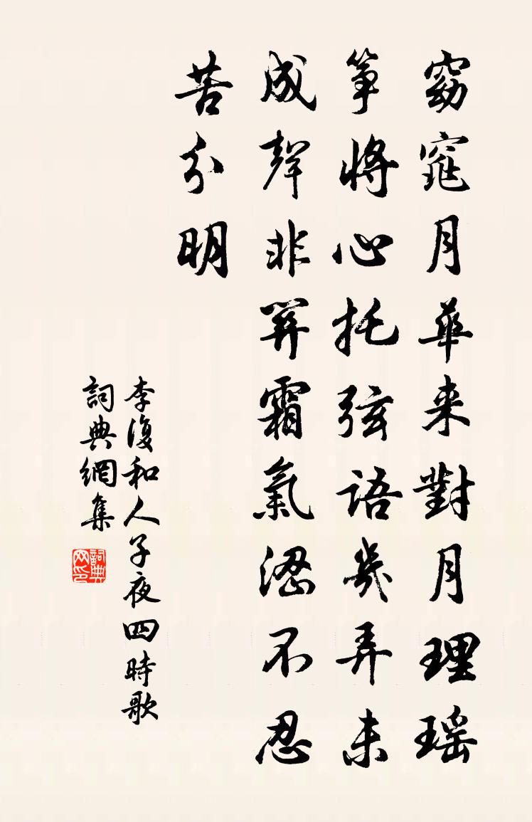 詩詞名句歷史字典書法欣賞書法字典國語詞典說文解字康熙字典古漢語字典標 題 作 者 詩 句 和人子夜四時歌作者:李復 朝代:宋代和人子夜四時歌原文窈窕月華來,對月理瑤箏。將心托弦語,幾弄未成聲。非關霜氣澀,不忍苦分明。詩詞問答問:和人子夜四時歌的作者是誰?答:李復問:和人子夜四時歌寫於哪個朝代?答:宋代李復和人子夜四時歌書法欣賞和人子夜四時歌書法作品詩詞推薦送客至湖州市陸游〔宋代〕偶駕雞棲送客行,迢迢十里出關城。誰知小市蕭條處,剩有豐年笑語聲。聊借野風吹醉頰,更憑陂水濯麈纓。故廬寄張先郎中王安石〔宋代〕留連山水住多時,年比馮唐未覺衰。篝火尚能書細字,郵筩還肯寄新詩。胡床月下知誰對,蠻榼花前想自隨。投老送姜醫與能仁西堂印老能仁韋宙讀書之地胡寅〔宋代〕韋公挾策漫荊榛,牧子亡羊也未真。百疊亂山秋思杳,半岩修竹歲寒親。不須招手遊蓮社,且可冥心舍筏津。山芋倒垂柳楊無咎〔宋代〕南州初會遇。記惺惺、說底語。而今精神□,傾下越風措。雍門人獨夜,客舍停杯處。餘香應未泯,憑君重唱金縷春雨陸游〔宋代〕細雨吞平野,余寒勒早春。未增豪飲興,先著苦吟身。幽徑萱芽短,方橋柳色新。閉門非為老,半世是閒人。遣興方岳〔宋代〕莫怨乘桴道不行,身方否處道方亨。大千世界愁中老,八萬障門嗔上生。了了不如都懡?,休休便是力修行。夜缸代人題瓊守歸疆堂曾豐〔宋代〕前朝列聖規模大,雨露涵濡山海外。椎卉之民半冠帶,恬不復它余百載。前守諸公方略偏,藩籬漫浪耳目前。版圖潄玉齋前雜卉皆龍圖王至之所植各賦一章凡得宋祁〔宋代〕壓枝高下錦,攢蕊淺深霞。疊采晞陽媚,鮮葩照露斜。依韻和栽花二闋強至〔宋代〕移花新了詔書來,似負迎春著意栽。桃李我公天下滿,不須偏待此中開。寄無相寧道二友釋行海〔宋代〕只隔青山百餘里,都無訊息是何如。春來雖有遊人使,逆旅情懷懶作書。浣溪沙葛勝仲〔宋代〕溪岸沈深屬泛萍。傾城容貌此推輪。可憐虛度二年春。暮暮來時騷客賦,朝朝新處後庭人。天留花月伴羈臣。信美台李當遇〔宋代〕零陵郡北雲帆落,信美台前江月明。石淺風高灘瀨急,孤舟一夜聽寒聲。巢湖阻風題岸亭曹勛〔宋代〕病體縈仍未肯安,益嗟氣血頓衰殘。更堪五日守風苦,殊覺一年行路難。晚興白居易〔唐代〕草淺馬翩翩,新晴薄暮天。柳條春拂面,衫袖醉垂鞭。立語花堤上,行吟水寺前。等閒消一日,不覺過三年,偈頌一百二十三首釋祖欽〔宋代〕久雨忽晴,心光發明。團團紅日,寥寥太清。非特好曬{左日右良},亦乃好經營。下秧種粟,桑麻漸青,綠楊枝句胡銓〔宋代〕儋耳道中還可樂,東坡安用嘆途窮。海棠蘇軾〔宋代〕東風裊裊泛崇光,香霧霏霏月轉廊。只恐夜深花睡去,更燒高燭照紅妝。九日登高劉禹錫〔唐代〕世路山河險,君門煙霧深。年年上高處,未省不傷心。寄章茂深郎中二首陳造〔宋代〕立譚當日受知深,不待陳情道古今。高會幾陪山簡醉,長篇許為愛卿吟。歲華遷謝心雖在,世路崎嶇老不禁。擬近秋後二首徐文卿〔宋代〕種豆山園中,土瘠豆不實。攟收能幾何,倚杖三嘆息。況此山下田,旱久苗葉赤。無豆尚猶可,無禾孰供食。已孤名句推薦故人何不返,春華復應晚。柳惲《江南曲》 路遙知馬力,日久見人心。佚名《增廣賢文·上集》 芙蓉生在秋江上,不向東風怨未開。高蟾《下第後上永崇高侍郎》 數州訊息斷,愁坐正書空。杜甫《對雪》 善政得民財,善教得民心。孟子《孟子·盡心章句上·第十四節》 名無細而不聞,行無隱而不彰。劉向《列女傳·節義傳·周主忠妾》 酹酒蒼茫,倚歌平遠,亭上玉虹腰冷。吳文英《十二郎·垂虹橋》 莫罵酉時妻,一夜受孤淒。佚名《增廣賢文·上集》 聽風聽雨過清明。愁草瘞花銘。吳文英《風入松·聽風聽雨過清明》 故山知好在,孤客自悲涼。蘇軾《臨江仙·送王緘》