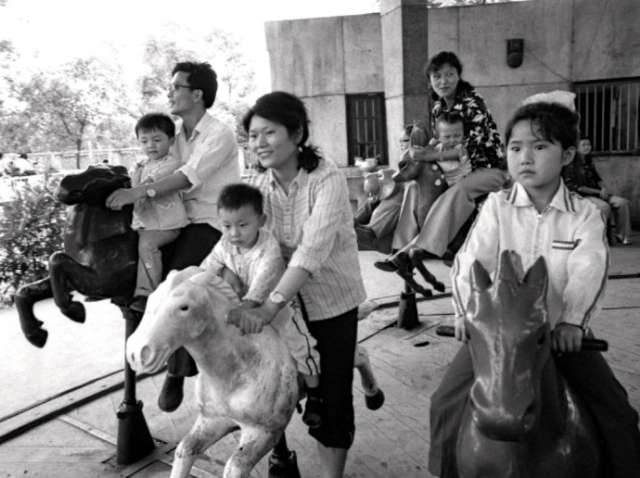 賣汽水的老人、玩蹺蹺板的兒童、大熊貓、騎木馬的孩子、滑滑梯的孩童、正在照相的人們