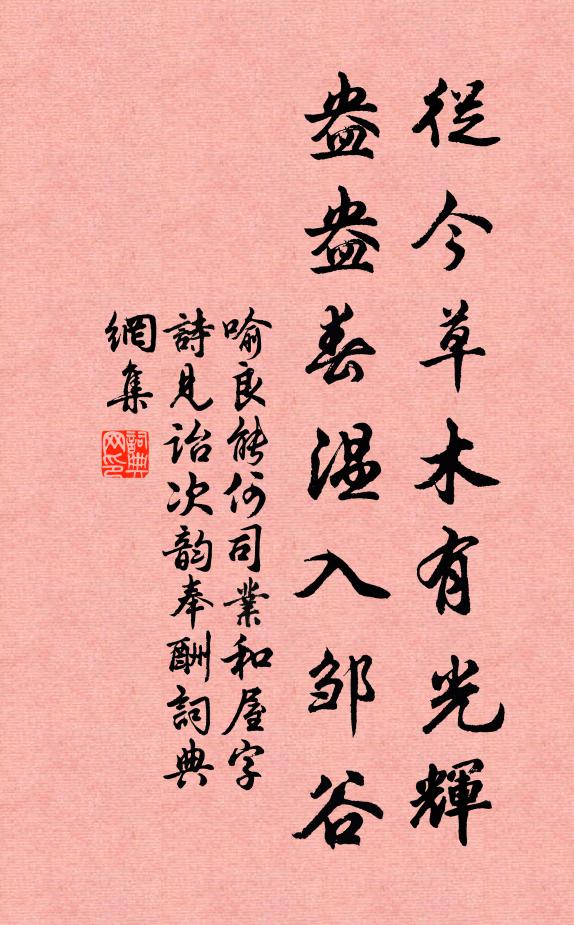 古詩文歷史字典書法欣賞書法字典國語詞典說文解字康熙字典古漢語字典從今草木有光輝,盎盎春溫入鄒谷喻良能 《何司業和屋字詩見詒次韻奉酬》名句出處出自宋代喻良能的《何司業和屋字詩見詒次韻奉酬》全文:亦好園林富松竹,愛山堂上書連屋。恨無妙語為題品,空對奇峰有十六。先生佳句落泉石,杜詩韓筆端能續。有如妙響發朱弦,恰似清音動寒玉。須知小圃辱提撕,何異寒門被收錄。從今草木有光輝,盎盎春溫入鄒谷。名句書法欣賞從今草木有光輝,盎盎春溫入鄒谷書法作品喻良能名句,何司業和屋字詩見詒次韻奉酬名句名句推薦此懷難與俗人談張炎《漁歌子》紅白雖相宜,品藻當如何舒邦佐《以魯直露溼何郎試湯餅為韻賦酴醿七首》隨行五升郗,一歲無滴瀝周文璞《夜坐讀書》雲黃知塞近,草白見邊秋王涯《隴上行》請觀今日長安道,易地何嘗不有之邵雍《觀棋長吟》寧知玉署思賢切,御手調羹等客來鄭俠《贈雲門居士》金華山下赤松鄉,何日橫門杜短牆鄭剛中《此心》訪歐公遺像,仍存古井,逋仙舊隱,猶有荒祠張之翰《沁園春 游孤山寺寄姜中丞》鴟梟豈終古,驚散雙鴛鴦陳獨秀《感懷二十首》朝來莫怪波漾靜,收向計翁筆勢中鄭剛中《益昌霪雨逾月負郭皆浸禱祠之後倉廩何全居民》錦江相去幾何哉,未見窗前落雪皚魏了翁《李提刑李參政再和招鶴詩再用韻以謝》此老不可天下人,一住廬山三十春陳舜俞《騎牛歌》乃知文章作,中與性情通韓維《覽梅聖俞詩編》空錄齊後瑟鮑照《登雲陽九里埭詩》遠遊眼底故交少,晚歲人間樂事稀陸游《秋思》詩詞推薦採桑曲趙孟堅〔宋代〕桑椹紫來蠶務急,帶曉採桑桑葉濕。屋頭綠暗勃姑啼,柱礙朝朝汗流出。人家蠶老婦勤苦,銀釧忙催隔窗霧。方花宣妙寺偶成衛宗武〔宋代〕翠玉光中藤拄杖,綠去叢里竹提輿。幽尋是處堪盤泊,絕勝當年五馬車。詠美人春遊詩江淹〔南北朝〕江南二月春。東風轉綠苹。不知誰家子。看花桃李津。白雪凝瓊貌。明珠點絳唇。行人鹹息駕。爭擬洛川神。寄潘歙州伯恭梅堯臣〔宋代〕我貧 * 酒,有酒無錢沽。新安走牙兵,六月至我廬。手中持尺題,肩上擔瓦壺。高山度青天,救此愁腸枯。開之宿育王河頭庵戴栩〔宋代〕晚靄圖成紺碧天,鷺鷥無數起平田。渡船委岸人家閉,卻向僧床聽雨眠。奉和御製璟與張說源乾曜同日上官命宴都堂賜詩應制宋璟〔唐代〕丞相邦之重,非賢諒不居。老臣慵且憊,何德以當諸。厚秩先為忝,崇班復此除。太常陳禮樂,中掖降簪裾。聖酒和韻問魏石川疾何夢桂〔宋代〕謾道無丹蛻骨凡,繡襦不換嫁時衫。老天倘未忘周孔,巫鬼何須問抵鹹。身健加餐親鼎飪,眼明減藥認囊椷。山中水調歌頭(五首選三)張惠言〔清代〕東風無一事,妝出萬重花。閒來閱遍花影,椎有月鉤斜。我有江南鐵笛,要倚一枝香雪,吹徹玉城霞。清影渺難即相和歌辭。相逢行韋應物〔唐代〕二十登漢朝,英聲邁今古。適從東方來,又欲謁明主。猶酣新豐酒,尚帶灞陵雨。邂逅兩相逢,別來問寒暑。寧知仙草歐陽修〔宋代〕世說書有仙草,書得之能隱書身。仙書已怪書妄,此事況無文。嗟爾得從誰,不辨偽與真。持行入都市,自謂術通