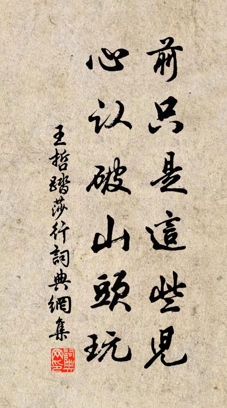古詩文歷史字典書法欣賞書法字典國語詞典說文解字康熙字典古漢語字典前只是這些兒,心認破山頭玩王哲 《踏莎行》名句出處出自元代王哲的《踏莎行》全文:道修真,人會嘆。中說得終無斷。也磨出慧鋒開,頭自有仙家贊。動光明,常圓滿。清泉瑩堪教看。前只是這些兒,心認破山頭玩。名句書法欣賞前只是這些兒,心認破山頭玩書法作品王哲名句,踏莎行名句名句推薦著眼看福人,要識太平年謝枋得《古詩贈相士吳楚峰》對面開詩景,當空列畫屏杜汝能《時思薦福寺》西風舊池館,猶得采芙蓉齊己《蝴蝶》雁湖曾是謫臨川,誰道風流愧昔賢許月卿《贈李企》解鞍旅舍天將暮惠洪《青玉案·綠槐煙柳長亭》入夜月虛白,逢春草自生韓維《過杜甫墳》黃帽青鞋安樂法,芋魁豆莢太平人洪咨夔《又敬和還家自喜》章呂合謀,惟敵是挑岳珂《林文節紹聖日記後帖贊》所幸並舍賢,昔年同詩書五邁《寄居元職方北第呈西鄰盛進士》如嶼兮媚川,如山兮倚天釋道璨《又觀音贊》欲喚凌波仙子呂同老《水龍吟(浮翠山房擬賦白蓮)》從君吏隱中,窮達初不計蘇軾《孔毅甫妻輓詞》稿砧刀頭未有時,攀條拭淚坐相思徐彥伯《樂府雜曲。鼓吹曲辭。芳樹》等閒白卻少年頭,悟得空時總不愁顧逢《雜興》嘆息春期失,淹留夕夢牽韓維《依韻和貢父見寄》詩詞推薦春耕陸游〔宋代〕今年液水滿西疇,父老人人卜有秋。只要耕犁及時節,裹茶買餅去租牛。東屯北崦杜甫〔唐代〕盜賊浮生困,誅求異俗貧。空村惟見鳥,落日未逢人。步壑風吹面,看松露滴身。遠山回白首,戰地有黃塵。念奴嬌·斷虹霽雨黃庭堅〔宋代〕八月十七日,同諸生步自永安城樓,過張寬夫園待月。偶有名酒,因以金荷酌眾客。客有孫彥立,善吹笛。援筆作茶陳東〔宋代〕偏愛君家碧玉盤,建溪雲腳未嘗乾。書生自恨無金換,聊以詩章乞數團。偈頌三十四首釋如淨〔宋代〕大地平沈,側布黃金。虛空透闊,高架枬檀。依稀馬廄,仿佛牛欄。鶻眼鷹眼不許看。句張君褆〔宋代〕石間佛足明如玉,山外神光散作燈。閒遊陸游〔宋代〕白石床平偶小留,青芒屨穩復閒遊。微丹點破一林綠,淡墨寫成千嶂秋。竹院頻分齋缽飯,苔磯時把釣魚鉤。要知辭世頌釋寶曇〔宋代〕平生灑灑落落,末後哆哆啝啝。殷勤覓一把火,莫教辜負澄波。和昌言官舍十題石榴花司馬光〔宋代〕靈根逐漢臣,遠自河源至。流離遍中壤,今茲盡苗裔。畏日助殷紅,凍雨滌濃翠。宜攜避暑客,花下縱橫醉。放舟戲書釋紹嵩〔宋代〕再岸蕭蕭蘆荻秋,斜風細雨轉船頭。年來頻作江湖夢,須向山陰上小舟。