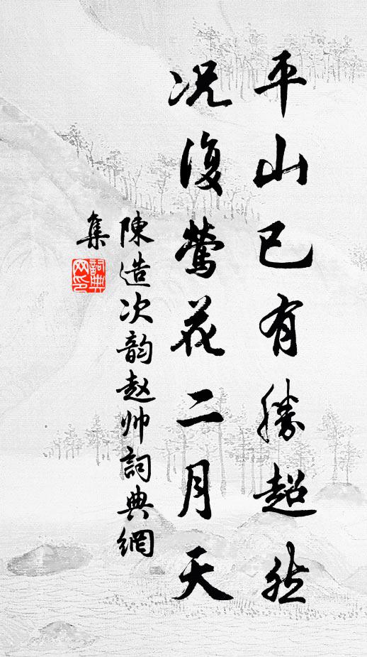 古詩文歷史字典書法欣賞書法字典國語詞典說文解字康熙字典古漢語字典平山已有勝超然,況復鶯花二月天陳造 《次韻趙帥》名句出處出自宋代陳造的《次韻趙帥》全文:平山已有勝超然,況復鶯花二月天。管領鶯花屬仙伯,不應草草賦歸田。名句書法欣賞平山已有勝超然,況復鶯花二月天書法作品陳造名句,次韻趙帥名句名句推薦弟兄況自逢三益,事業懸知定十全周必大《次韻王仲謨仲寧唱酬二首》一條捷逕入無為馬鈺《玩丹砂 立法梯》雨恨雲愁,江南依舊稱佳麗。王禹偁《點絳唇·感興》掃階楊柳敗荷風,春名秋初下觀中薛師董《題金陵雜興詩後八首》峨眉山月卻入手,影落庭闈一杯酒楊萬里《送李君亮大著出守眉州》笑他黃紙除君,紅旗報我,為君助喜劉辰翁《鶯啼序》豈象之臨,亦意之尚岳珂《高宗皇帝御筆臨吳皇象如鷹帖贊》願公福德厚如山,為扶起、坤陲一半吳泳《鵲橋仙(壽崔菊坡)》憶昔江西別子時,我初折腰五斗粟曾鞏《移守江西先寄潘延之節推》晁張作薦書,射雉用一矢黃庭堅《奉和文潛贈無咎篇末多見及以既見君子云胡不》得來亦何有,理亂了不聞胡銓《中秋前一夕攜家步至北湖藉縟草久之和東坡湖》反念故園日,默默何由平張嵲《游獨孤城下作》粟嫩生肌玉梅窗《菩薩蠻(春閨)》來春甲子又一周,天相吾泉真可必真德秀《泉州貢闈慶成》海北江南零落盡,兩人相見洛陽城劉禹錫《洛中送韓七中丞之吳興口號五首》詩詞推薦鷓鴣天謝逸〔宋代〕桐葉成陰拂畫檐。清風涼處卷疏簾。紅綃舞袖縈腰柳,碧玉眉心媚臉蓮。愁滿眼,水連天。香箋小字倩誰傳。梅黃題李君亮義概堂葉適〔宋代〕分飧人所能,多至逾萬億。一朝可趣具,寒暑三十易。古之轑釜者,其始蓋未惜。懷哉西方士,義重見寡特。招呼用一代不數人百年能幾見為韻詩賦十章呈陳君趙蕃〔宋代〕東南固多賢,莫與永嘉匹。王鄭已騎鯨,輩流公第一。綠珠怨劉商〔唐代〕從來上台榭,不敢倚闌乾。零落知成血,高樓直下看。次韻鄭德彝擬古集句於石〔宋代〕明月照高樓,永夜不闔扉。盈盈樓上女,耿耿如相依。歲月忽已晚,草木變芬菲。扳條折其榮,風流付枕幃。蹇修觀移碑石有感顧逢〔宋代〕自古興衰皆有數,移來舊碣作新碑。少會會見重磨日,還憶今朝刻字時。端午前一日阻風鄱陽湖觀競渡楊萬里〔宋代〕惡風夜半阻歸船,端欲留人作勝緣。千里攜家觀競渡,五湖新漲政黏天。棹翻波浪山如雪,醉殺兒郎喜欲顛。得去和人與人分惠賜冰楊巨源〔唐代〕天水藏來玉墮空,先頒密署幾人同。映盤皎潔非資月,披扇清涼不在風。瑩質方從綸閣內,凝輝更向畫堂中。麗詞初寓橫涇黃順之〔宋代〕十年泉石夢,及此始依然。野迥天垂地,身閒日抵年。稍欣聞見少,漸與土風便。分得漁樵席,白雲相共眠。次韻答簡簿王炎〔宋代〕少日牛衣嘗熟眠,老來駝褐不護寒。欲呵龜手拈禿筆,怯看冰柱縣疏檐。東風不解著梅柳,翻作六出欺春妍。春回