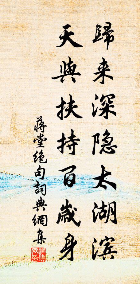 古詩文歷史字典書法欣賞書法字典國語詞典說文解字康熙字典古漢語字典歸來深隱太湖濱,天與扶持百歲身蔣堂 《絕句》名句出處出自宋代蔣堂的《絕句》全文:歸來深隱太湖濱,天與扶持百歲身。雖是浮雲隔雙闕,丹心愛戴在君親。蔣堂詩詞大全名句書法欣賞歸來深隱太湖濱,天與扶持百歲身書法作品蔣堂名句,絕句名句名句推薦南風駕小雨,群山淨如沐張栻《靜江歸舟中讀書》牡丹灼灼看何厭,芍藥夭夭種已多李至《所苦之中無以遣悶更題新竹別獻五章幸賜披覽》初無公侯心,骨相本寒餓黃庭堅《寄懷元翁》渚蓮尚拆庭梧老歐陽修《漁家傲》不須計較作思量,五五從來二十五釋慧暉《偈四首》清於夷則初秋律,美似芙蓉八月花黃庭堅《謝仲謀示新詩》舞袖翩翩歌聲妙,掩粉面、斜窺翠黛佚名《水龍吟慢/水龍吟》又落他鄉淚,風前一滿衣杜牧《逢故人》暝色凝煙,不勝淒黯邵亨貞《齊天樂 甲午七月望後,橫泖客舍驟雨頓涼,》絕代佳人,不入金張室,卻訪吾廬劉克莊《六州歌頭(客贈牡丹)》夜橋燈火照溪明,欲放扁舟取次行蘇軾《贈孫莘老七絕》杳兮冥,恍兮惚,湛兮然佚名《水調歌頭 此下原有沁園春七返還丹一首,乃》又不聞賓頭盧,應供四天下章甫《種基祖蔡仲逸孫祖顯一時宦遊荊州官閒無事五》枉費機謀,徒勞奔競趙師俠《踏莎行》公論盡歸恩怨外,清談不落是非間胡仲弓《和劉後村雜興》詩詞推薦瀟湘八景平沙雁落宋寧宗〔宋代〕漂泊楚天長,同群兄弟行。朔風離塞漠,落日下瀟湘。古磧多葭菼,平田足稻粱。飛鳴眇空際,布武作文章。湖山十詠王希呂〔宋代〕荷花過眼作鮮妍,小艇初疑久自便。日日孤山山下路,紅菱白藕不論錢。同友人會裴明府縣樓許彬〔唐代〕開閣雨吹塵,陶家揖上賓。湖山萬疊翠,汀樹一行春。景逼歸檐燕,歌喧已醉身。登臨興未足,喜有數年因。達磨祖師贊釋師觀〔宋代〕手提金錫,銀山鐵壁。對朕者誰,還雲不識。透過玄關, * 。次韻仲信留別李洪〔宋代〕倦遊再閏入都門,喜見隆興詔令新。功業詎堪銘日觀,龍鍾空嘆倚天津。題詩竹閣逢寒食,修禊蘭亭及暮春。我欲除兵部侍郎賜帶趁朝參虞儔〔宋代〕幸叨持橐侍甘泉,敢意恩榮慰暮年。紫綬金章光照地,絲鞭玉勒喜朝天。兒曹莫起無魚嘆,人世難為跨鶴仙。報國新年五首蘇軾〔宋代〕荔子幾時熟,花頭今已繁。探春先揀樹,買夏欲論園。居士常攜客,參軍許叩門。明年更有味,懷抱帶諸孫。行路難·洞庭水上一吳均〔南北朝〕洞庭水上一株桐,經霜觸浪困嚴風。昔時抽心耀白日,今旦臥死黃沙中。洛陽名工見咨嗟,一翦一刻作琵琶。白璧梅花引·荊溪阻雪蔣捷〔宋代〕白鷗問我泊孤舟,是身留,是心留?心若留時,何事鎖眉頭?風拍小簾燈暈舞,對閒影,冷清清,憶舊遊。舊遊舊至浦城界聞武林失火而還陳藻〔宋代〕幾年要入武林游,今日中塗卻罷休。剩得紀行詩數首,前途有便是良謀。