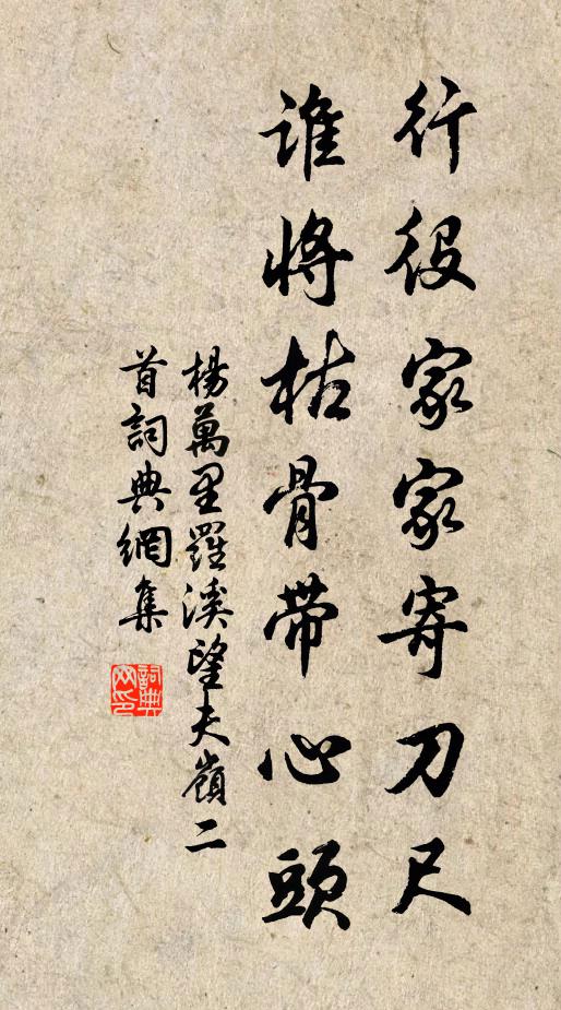 古詩文歷史字典書法欣賞書法字典國語詞典說文解字康熙字典古漢語字典行役家家寄刀尺,誰將枯骨帶心頭楊萬里 《羅溪望夫嶺二首》名句出處出自宋代楊萬里的《羅溪望夫嶺二首》全文:行役家家寄刀尺,誰將枯骨帶心頭。惟有望夫心志苦,甘霖偏為七娘流。楊萬里詩詞大全名句書法欣賞行役家家寄刀尺,誰將枯骨帶心頭書法作品楊萬里名句,羅溪望夫嶺二首名句名句推薦神之聽之,來燕來寧真宗《高宗郊祀前廟朝享太廟三十首》徑乘兩槳去,不待五馬車蘇轍《送表弟程之元知楚州》憑愚邀敬多官府,與想桃源源上行趙蕃《書懷二首》咫尺西江路,悲歡暫莫聞牟融《寄張源》化身為醫忘其軀,草書非學聊自娛蘇軾《六觀堂老人草書詩》不知歌謠妙,聲勢出口心陸龜蒙《大子夜歌二首》拔劍擊前柱,悲歌難重論李白《南奔書懷(一作自丹陽南奔道中作。蕭士贇雲是偽作)》三春強半麥青青,是處田家只望晴袁甫《和王伯友韻》髑髏識盡喜何立,枯木龍吟消未乾釋重顯《頌一百則》俯仰兩青空,舟行明鏡中陸游《泛瑞安江風濤貼然》青楓獨映搖前浦,白鷺閒飛過遠村李嘉祐《送朱中舍游江東》陳縟禮、獻歲惟良佚名《十二時/憶少年》出處義與比,盛衰世相關杜范《丁丑別金壇劉漫塘七首》白首餘杭白太守,落魄拋名來已久白居易《蘇州李中丞以元日郡齋感懷詩寄微之及予,輒》當呼玉澗手蘇軾《次韻奉和錢穆父蔣潁叔王仲至詩四首》詩詞推薦贈張聽聲李石〔宋代〕人言鼻聽無如龍,聽不以耳乃反聾。未若水母本無目,隔水回響相鳴雄。我持此理問張瞍,廢目任耳偏能聰。忍聞過千頃寺訪谷隱老胡仲參〔宋代〕別久交情淡,重來似舊時。人生雲聚散,世事月盈虧。茶具權行酒,禪床借看詩。漫天多雪意,預約探梅期。蛻龍洞鍾宿〔宋代〕蒼岩磊落任龍蟠,綿亘千年露未乾。一自為霖破壁去,至今風雨逼山寒。句林逋〔宋代〕算吟千萬首,方得兩三聯。龍井十題歸隱橋釋元淨〔宋代〕謝講竺峰寺,歸隱新此橋。院幽結林表,身老寄煙霄。相和歌辭。飲馬長城窟行虞世南〔唐代〕馳馬渡河乾,流深馬渡難。前逢錦車使,都護在樓蘭。輕騎猶銜勒,疑兵尚解鞍。溫池下絕澗,棧道接危巒。拓地丙申元日五絕方回〔宋代〕雪余連雨滿城泥,喝道宵行萬馬蹄。昨夜隔年書未點,瓶梅燈畔一枝低。記畫方岳〔宋代〕閒雲古木山藏寺,野渡孤舟水落磯。秋色無人空黯淡,竹門未掩待僧歸。從軍行張玉孃〔宋代〕二十遴戲勇,從軍事北荒。流星飛玉彈,寶劍落秋霜。書角吹楊柳,金山險馬當。長驅空朔漠,馳捷報明王。直舍紀事二首程公許〔宋代〕獨冷官曹可得禁,近來冷過玉壺冰。無錢沽酒休煩送,有馬知誰許借乘。罷謁最宜吟慘澹,愛間贏得睡懵騰。鸞鳳
