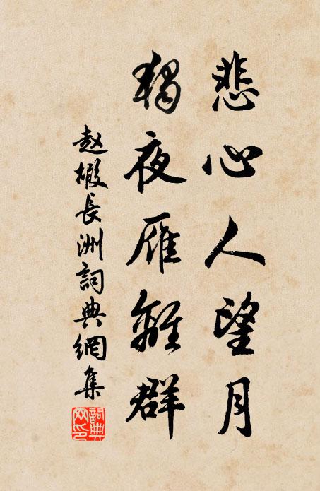 古詩文歷史字典書法欣賞書法字典國語詞典說文解字康熙字典古漢語字典悲心人望月,獨夜雁離群趙嘏 《長洲》名句出處出自唐代趙嘏的《長洲》全文:扁舟殊不系,浩蕩路才分。范蠡湖中樹,吳王苑外雲。悲心人望月,獨夜雁離群。明發還驅馬,關城見日曛。趙嘏詩詞大全名句書法欣賞悲心人望月,獨夜雁離群書法作品趙嘏名句,長洲名句名句推薦落梅香影放華燈,快我來尋采若盟熊瑞《再和元夕》徘徊徒倚十二蘭,嘯聲吹上梅稍月趙葵《秋浦樓》積善必餘慶,於公大門閭樓鑰《送陳表道宰南豐》荒園雪晴愁徑滑,濕柴堅坐戀爐紅張耒《雪晴》忽忽歲將暮,烈烈北風涼鄒登龍《歲晚懷愚齋趙叔愚壺山宋謙父》苔逕流錢青莫數史愚《謁金門》西崑當日下雲駢洪适《朝中措(蘇少蓮母生日)》萬物餘一體,九州餘一家王安石《雜詠八首》身是三千第一名,內家叢里獨分明薛能《吳姬十首》困倚闌乾一欠伸陳師道《南鄉子》隃知萬古月,自在最高天戴表元《八月十五夜雨中微有月色》護惜常愁滿樹開,況無一片在蒼苔陸游《憶梅》梅花應待行時發,野岸山房探得春葉適《送林子高》只尋隱跡歸何處,方說煙霞不定居張蠙《逢道者》萬里碧霄終一去,不知誰是解絛人崔鉉《詠架上鷹》詩詞推薦送蔡駰守天台蔡肇〔宋代〕天召四萬八千丈,玉京五城十二樓。欲乘西風跨獨鶴,直渡南斗騎牽牛。 * 長爪快搔背,巢父投竿應掉頭。廣文八月五日病中方回〔宋代〕於心敢自欺,但恐不精思。未覺扶顛易,方驚悔過遲。病堪長作客,貧可薦招醫。觀井如彭祖,聞諸草角時。招許主客歐陽修〔宋代〕欲將何物招嘉客,惟有新秋一味涼。更掃廣庭寬百畝,少容明月放清光。樓頭破監看將滿,瓮面浮蛆撥已香。仍約寄王振拾遺(戊辰歲)齊己〔唐代〕折檻意何如,平安信不虛。近來焚諫草,深去覓山居。□□□□□,□□□□余。分明知在處,難寄亂離書。再禱梅山華岳〔宋代〕梅山昔扣五通仙,曾許英雄第一簽。恰遇塵埃當擾擾,如何泥濘尚淹淹。若非推入高宗夢,須是遙分太史占。他日瀟湘八景圖瀟湘夜雨葉茵〔宋代〕雲氣浮江天已夕,江樹號風飛雨迫。淒涼正則賦懷沙,疑與漁翁分半席。一聲曖乃隔中流,打篷淅霎添旅愁。土膏期盡鮑溶〔唐代〕魚鎖生衣門不開,玉筐金月共塵埃。青山石婦千年望,雷雨曾知來不來。偶眠白居易〔唐代〕放杯書案上,枕臂火爐前。老愛尋思事,慵多取次眠。妻教卸烏帽,婢與展青氈。便是屏風樣,何勞畫古賢?題九華閣方惟深〔宋代〕鬥起喧卑地,塵埃不入顏。微尋清書夢,靜看別州山。隱几孤鴻沒,調琴遠鶴還。何時了吾事,來此伴君閒。訴衷情歐陽修〔宋代〕清晨簾幕卷輕霜,呵手試梅妝。都緣自有離恨,故畫作,遠山長。思往事,惜流芳。易成傷。擬歌先斂,欲消還顰