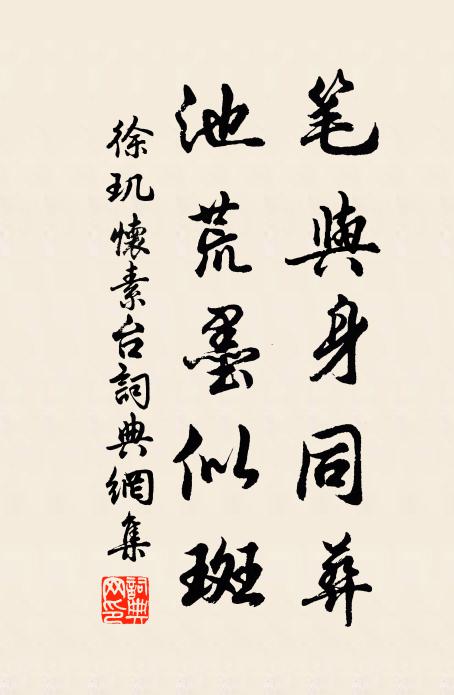 古詩文歷史字典書法欣賞書法字典國語詞典說文解字康熙字典古漢語字典筆與身同葬,池荒墨似斑徐璣 《懷素台》名句出處出自宋代徐璣的《懷素台》全文:不識張顛面,畫成釵股艱。長年昔年宅,獨塑醉時顏。筆與身同葬,池荒墨似斑。才清人必重,瀟岸野雲間。徐璣詩詞大全名句書法欣賞筆與身同葬,池荒墨似斑書法作品徐璣名句,懷素台名句名句推薦螮蝀吞滄海,蟾蜍食太虛舒岳祥《初八夜遭綠林之禍因紀其事》只怕人先老張孝祥《菩薩蠻》何以報公,祝公千歲,多少人家燒夜香黃機《沁園春(壽)》流水復檐下,丹砂發清渠元季川《泉上雨後作》猛虎當路蹲,時人俱不會釋了一《頌古二十首》榮枯盡寄浮雲外,哀樂猶驚逝水前許渾《重遊練湖懷舊》春滿南宮白日長,夜來新值錦衣郎李山甫《贈徐三十(一本題缺,一本作酬劉書記見贈二)》因醉暫無事,在山難免愁王建《醉後憶山中故人(一作故人山中)》他時遷客歸朝去,擬覓瓊瑤滿袖歸王禹偁《和仲鹹詩六首之二和回喻令詩集》無謀還有計,春谷種桑榆於鵠《山中寄樊僕射(一作寄襄陽樊司空)》篙人為我言,此水通淮頭文天祥《發高郵》要牘江西社,親傳肘後書曾豐《寧都趙令君貽貺五言四首意索余和不可虛辱如》如是我聞,早落第二白玉蟾《金剛經偈寄示西林總長老》方殫義理樂,蚤覺鬢髯秋陳宓《春暮書房》聖君賢相有美意,筆端與物為陽春張耒《送翟公巽赴中書舍人》詩詞推薦首尾吟邵雍〔宋代〕堯夫非是愛吟詩,詩是堯夫自在時。何處不行芳草地,誰家不望小車兒。花枝好處安詳折,酒盞滿時{左扌右閏}別鶴杜牧〔唐代〕分飛共所從,六翮勢催風。聲斷碧雲外,影孤明月中。青田歸路遠,丹桂舊巢空。矯翼知何處?天涯不可窮。納涼秦觀〔宋代〕攜杖來追柳外涼,畫橋南畔倚胡床。月明船笛參差起,風定池蓮自在香。斸葛行洪咨夔〔宋代〕晨雞未號霜塞塗,前村後村遞招呼。長鑱短篝采葛去,冰滿髯鬢風無襦。頻年米賤置不問,高藤稠葉青扶疏。但聞山市蒲松齡〔清代〕奐山山市,邑八景之一也,然數年恆不一見。孫公子禹年與同人飲樓上,忽見山頭有孤塔聳起,高插青冥,相顧驚失調名佚名〔宋代〕芳草綠如茵,與藍袍、草爭翠色。赤岸道中呈斯遠趙蕃〔宋代〕小雨洗紅葉,青山舒白雲。秋風有奇處,我友得平分。送徐尉移簿巴陵並簡鄧器先汪兼善王炎〔宋代〕兩鳧不到蓬萊峰,翩翩墮在葭葦叢。口談世事懶揖客,劫回老眼瞻飛鴻。子真何事亦來此,培塿乃千丈松。揮毫古宣和甲辰三月三日山谷寺偶成是時欲下長蘆也釋正覺〔宋代〕溫風在山谷,青紫班芳妍。浩然春公心,不作彼此偏。其來初無像,榮事亦自然。雲容淡如鶴,草色齊膩煙。竹萌初春書懷陸游〔宋代〕六十餘年慕古人,即今方近葛天民。見人各是元非恕,遇事皆安豈怨貧。小圃鉏耰聊過日,扁舟煙雨尚關身。出門