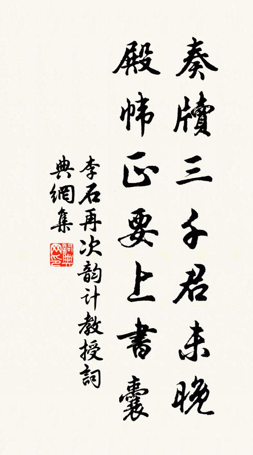 古詩文歷史字典書法欣賞書法字典國語詞典說文解字康熙字典古漢語字典奏牘三千君未晚,殿幃正要上書囊李石 《再次韻計教授》名句出處出自宋代李石的《再次韻計教授》全文:糟丘盡醉國人狂,誰似東家禮義鄉。萬卷短檠磨歲月,一生寒硯敵水霜。飯牛坐待扶桑白,戰馬初歸塞草黃。奏牘三千君未晚,殿幃正要上書囊。名句書法欣賞奏牘三千君未晚,殿幃正要上書囊書法作品李石名句,再次韻計教授名句名句推薦屋破時懸溜,弓驚不受弦虞儔《暇日邀王天任諸公游南坡天任有詩因次韻》他年誰識我,心跡在徐州薛能《雕堂》相業如何不到頭,諸公曆歷頌伊周潘喆《經賈秋壑故第》念我逃世難,過用恐禍隨舒岳祥《借成喜杉棚成》三十六峰危似冠,晴樓百尺獨登看吳融《望嵩山》秉燭追游憶盛時,歡悰終較昔年稀仇遠《和范愛竹三首》忽遇雁山客,霞佩青蓮冠柯九思《送林彥清歸永嘉》圓明自喜心如月,皓白誰愁鬢似霜釋智圓《暮秋》芳草何年恨即休韋驤《減字木蘭花(望仙詞)》天階夜色涼如水,坐看牽牛織女星杜牧《秋夕》從此七橋風與月,夢魂長到木蘭舟曾鞏《離齊州後五首》雄劍鳴開匣,人頭落玉盤譚處端《南柯子》門橫嚴子瀨,壁紀桐君籙楊翱《題方乾舊隱》今日蒸雲重睹對,絲毫不隔最譊訛釋大觀《和靜照詩韻》不作歸山計,空悲走馬鞍張耒《冬至三首》詩詞推薦荔子曾幾〔宋代〕異方風物鬢成斑,荔子嘗新得破顏。蘭蕙香浮襟解後,雪冰膚在酒酣間。絕知高味傾瑤柱,示覺豐肌病玉環。似是送孟世功吳芾〔宋代〕男兒三十未成名,肯但區區事筆耕。王粲平時希負鼎,賈生今日請長纓。漫漫海內妖氛暗,策策腰間老劍鳴。會使哭亦周趙文〔宋代〕擢第君王與袍笏,蓋棺丞相辦深衣。江南仕宦堪車載,如此全歸似汝稀。道州奉寄襄陽裴相公呂溫〔唐代〕悠悠世路自浮沉,豈問仁賢待物心。最憶過時留宴處,艷歌催酒後亭深。即事施樞〔宋代〕暝色分煙上遠峰,雨聲斷處又晴風。寶香羞冷閒情遠,落盡薔薇一架紅。聞虜人敗於柘皋作口號十首龐謙孺〔宋代〕戰伐無多生女真,人傳強半是簽軍。可憐盡死天兵手,但恐官家不得聞。秋日見橘花二首楊萬里〔宋代〕不夜非關月,無風也自香。著花能許細,落子不多長。玊糝開猶半,金須捻更強。得秋何恨脕,胦暑卻生涼。閒居述事邵雍〔宋代〕竹雨侵人氣自涼,南窗睡起望瀟湘。茅簷滴瀝無休歇,卻憶當初宿夜航。皇媧補天謠楊維楨〔元代〕盤皇開天露天醜,夜半天星墮天狗。璇樞缺壞奔星斗,輪雞環兔愁飛走。聖媧巧手煉奇石,飛廉鼓鞲虞淵赤。紅絲水龍吟 秋聲項鴻祚〔清代〕西風已是難聽,如何又著芭蕉雨?泠泠暗起,澌澌漸緊,蕭蕭忽住。候館疏碪,高城斷鼓,和成淒楚。想亭皋木落